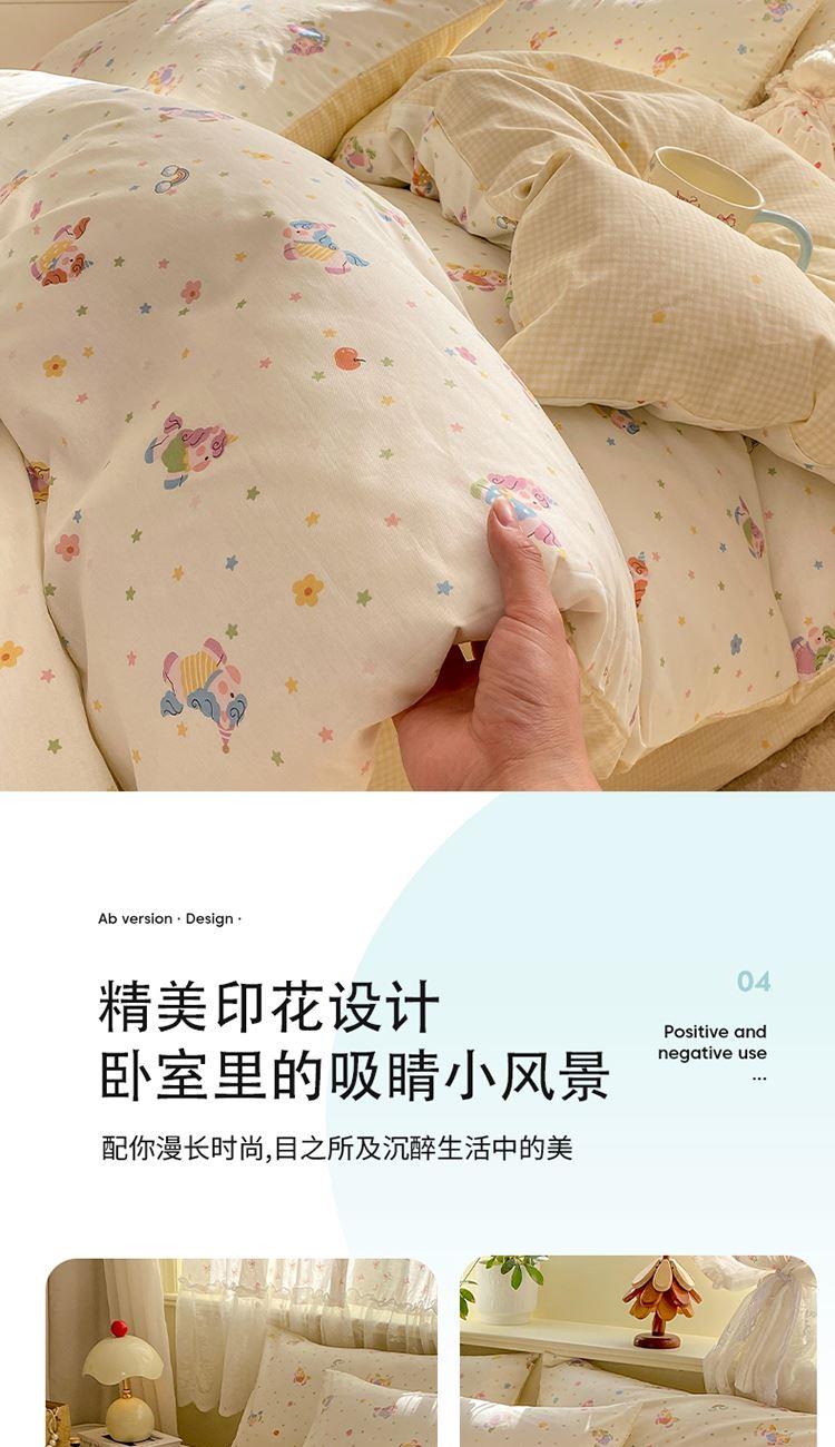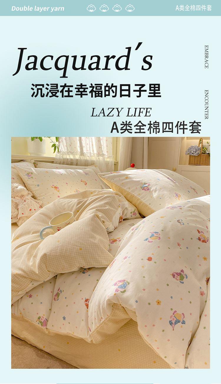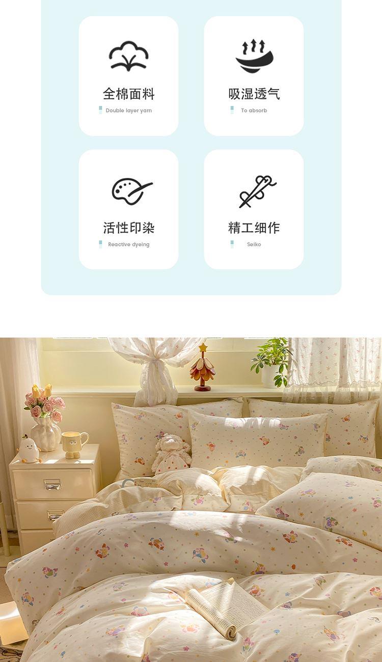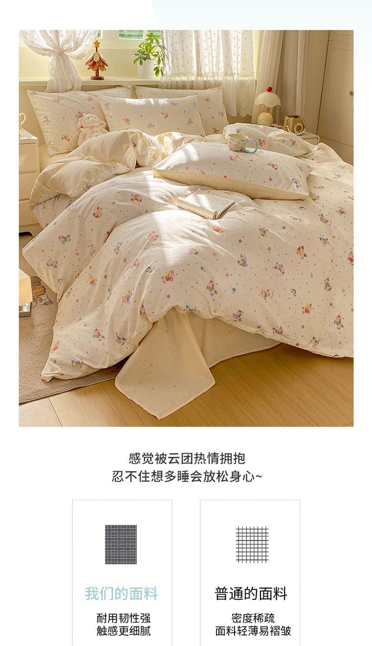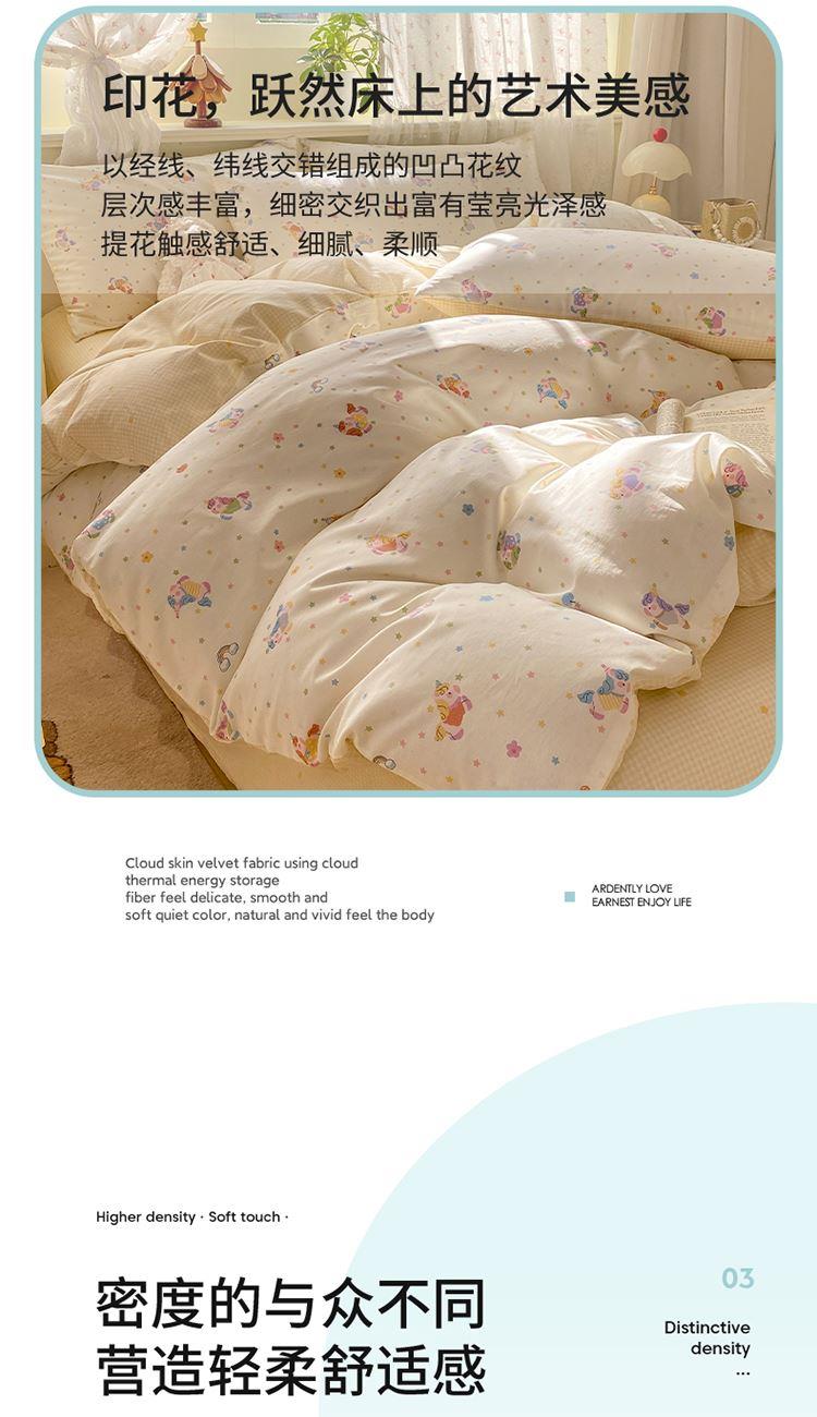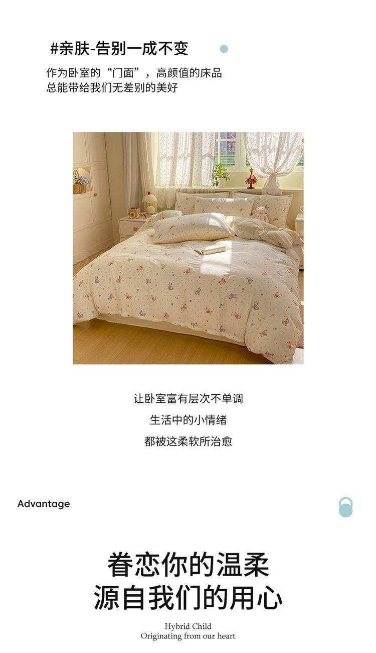 1:全棉面料柔到你心里 更贴身、吸湿、透气,保暖松软的触感,躺进去世界也变得柔软 2:印花,跃然床上的艺术美感 以经线、纬线交错组成的凹凸花纹 层次感丰富,细密交织出富有莹亮光泽感提花触感舒适、细腻、柔顺 3:密度的与众不同营造轻柔舒适感 纱织越细,面料越柔软,床品品质也就 尺寸:被套200*230cm*1 床单:230*250cm*1 枕套:48*74cm*2 包装:彩盒