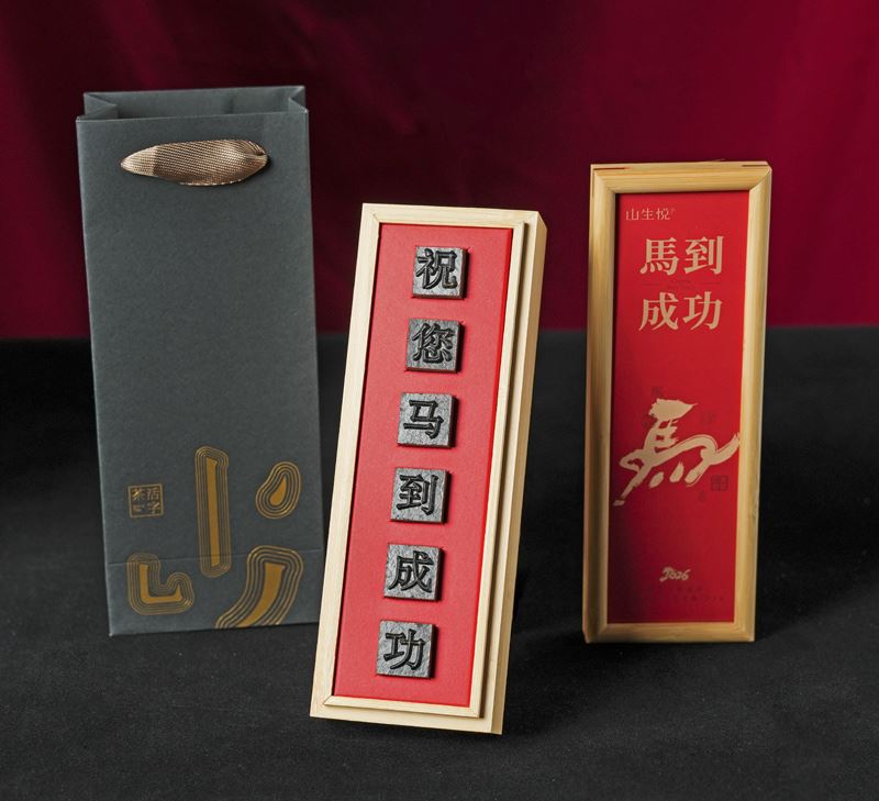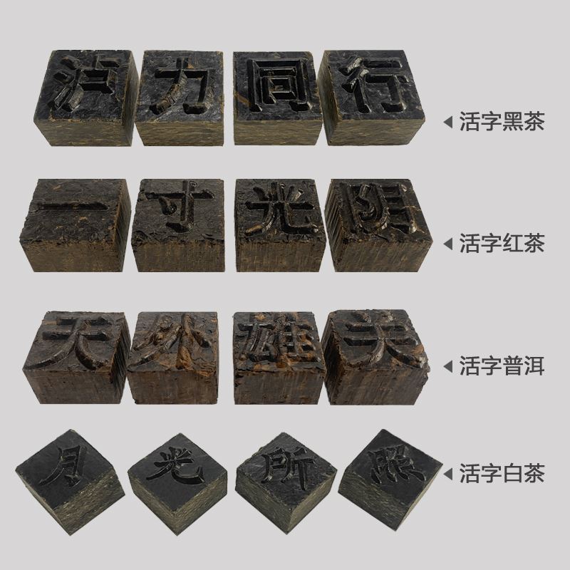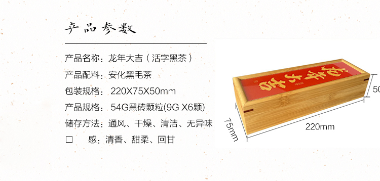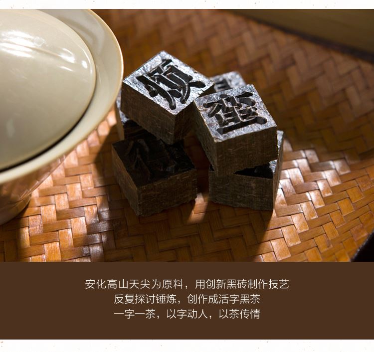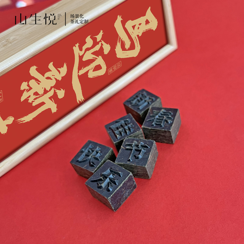 产品配置:活字茶6颗 手提袋1个 茶叶品种:活字黑砖茶 礼盒尺寸:220*75*50mm 定制范围:盒面图案定制、茶字内容定制、手袋logo定制