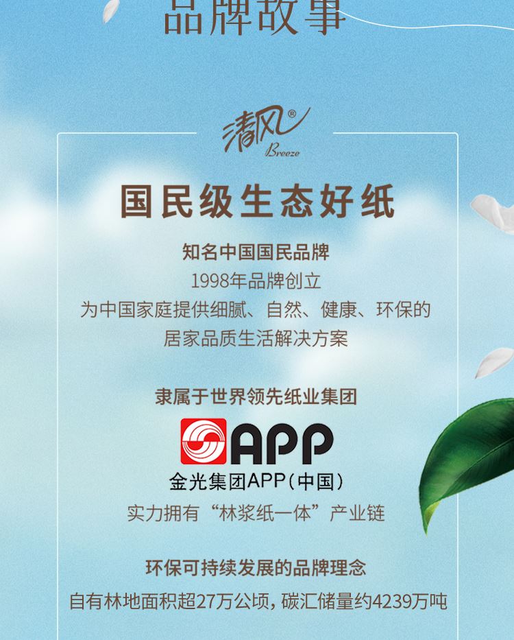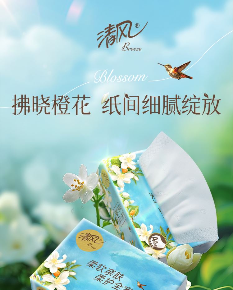 香型:无香  主要原料:原生木浆 保质期:3年  细腻好纸,7年相思木,1张细腻纸。 1.原生木浆 使用原生种植林原木生产的木浆,从源头保证绿色健康品项。全程严控更放心,不添加可迁移性荧光增白剂。 2.三层厚实,蓬松舒软 原生木浆好木出好纸,纸感细腻,棉柔亲肤。 3.湿水依旧强韧 湿水不易破,吸水力UP,多场景安心使用。 4.纤维交织紧密 长短纤维交织工艺,黄金配比,成就柔韧细腻,不掉屑、不分层,自然亲肤,品质呵护。 清风 隶属于金光集团APP,实力拥有“林浆纸一体”产业链,“种6棵,用1棵”,在国内自有林场地面积超过27万公顷,碳储量4239万吨。