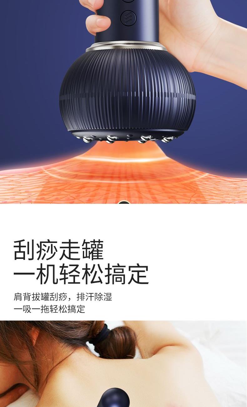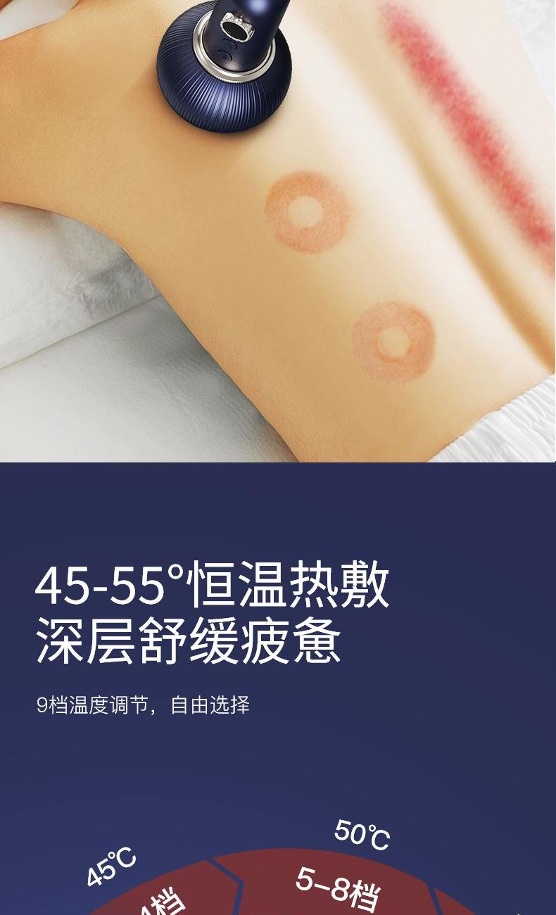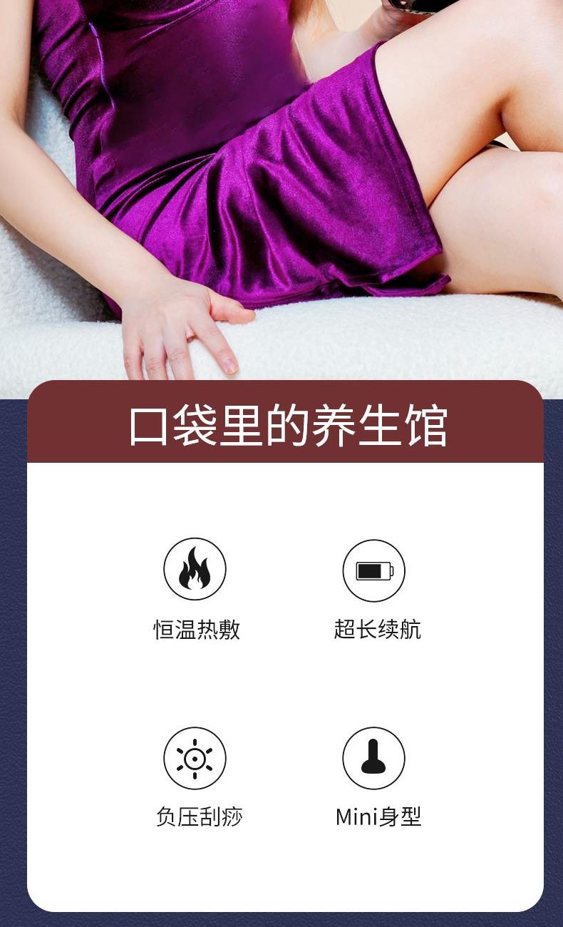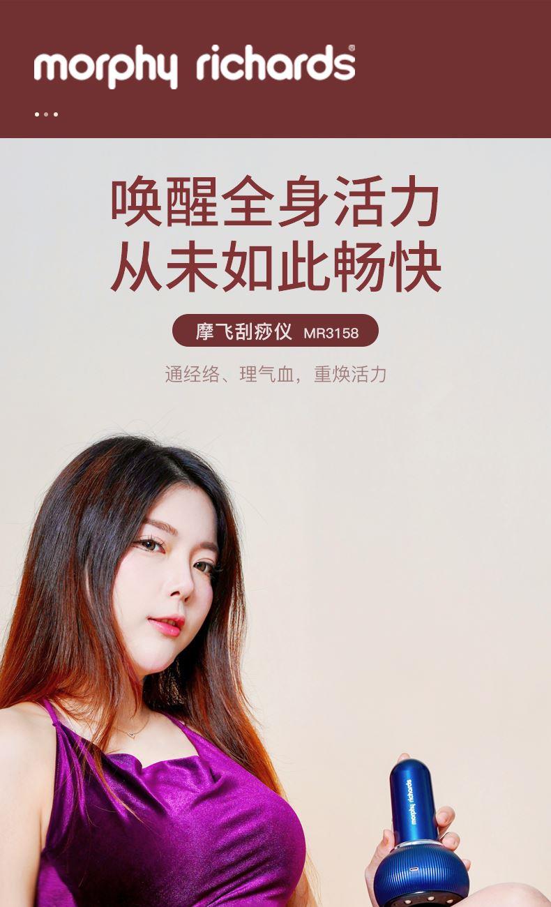 型号 MR3158 69码 6975660323155 产地 浙江温州 净重 232g 毛重 664g 包装尺寸 21X18X10.5cm 大箱尺寸 73x44.5x53.5cm 续航:≈1H(发热低档) 默认工作时间:30min(自动关闭) 充电时间:3小时±0.5小时 充电电压:5V 额定功率:5w 充电接口:USB 电池容量:1200毫安 执行标准:GB4706.1-2005/GB4706.10-2008 配件:主机*1,艾草精油*5,滤棉*4,充电线*1,说明书*1 卖点: 中西合并,结合传统刮痧、拔罐技术,守护健康 8颗浮点均匀出痧 9档拔罐吸力 红外发热,高效促进吸收,无烟无灰 搭配精油,更有效 多场景,多部位,拿起即用