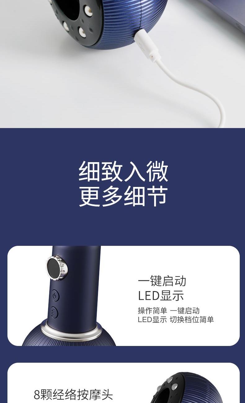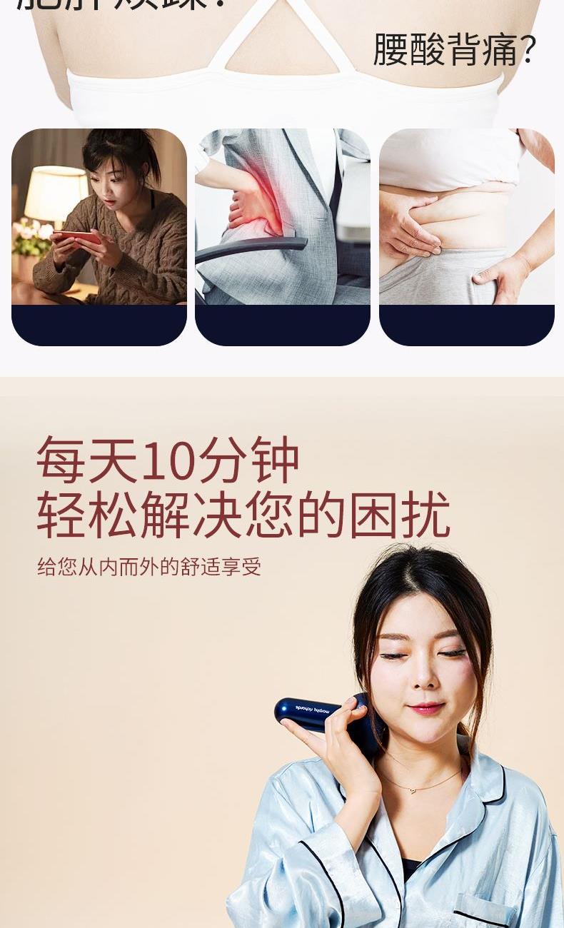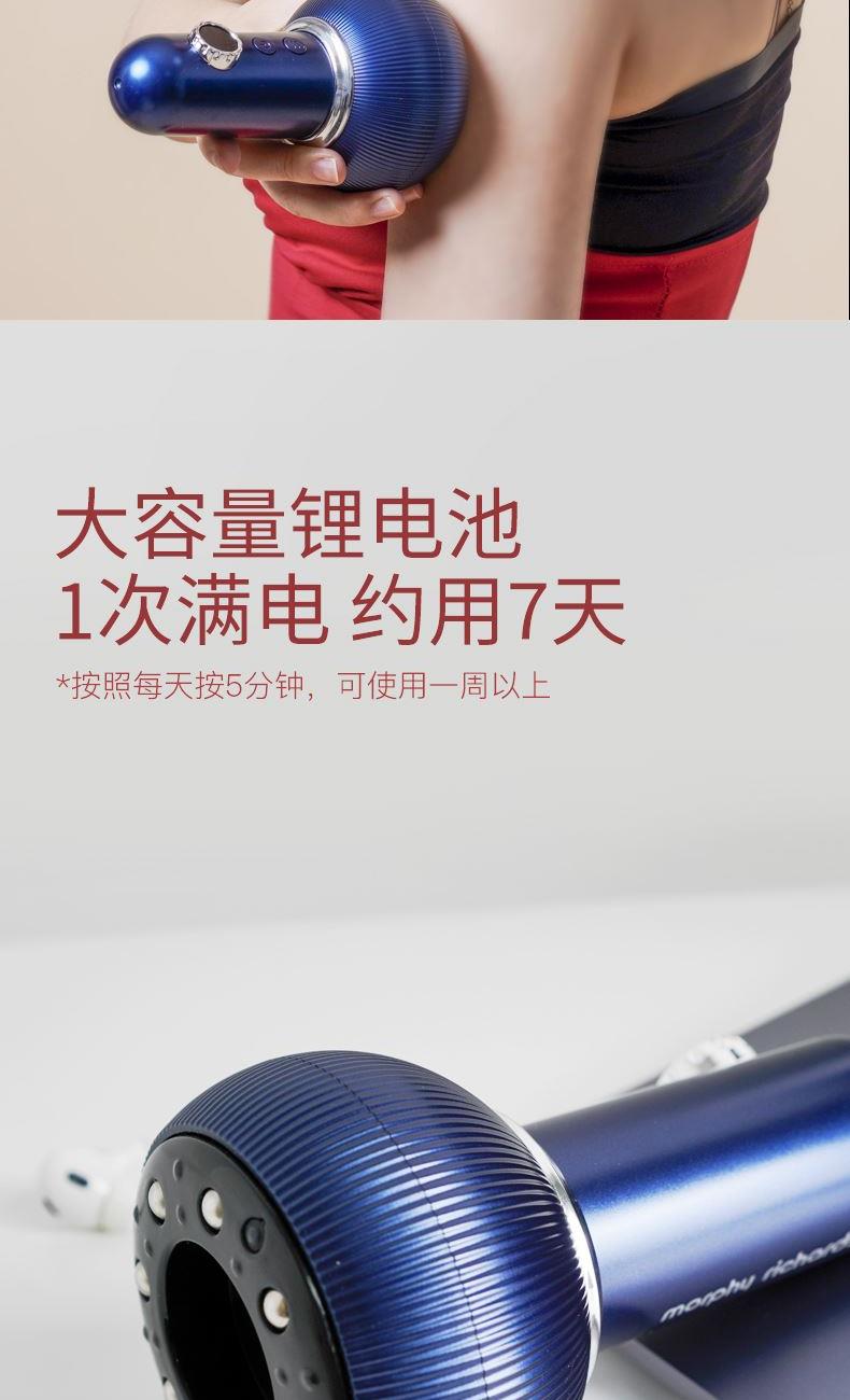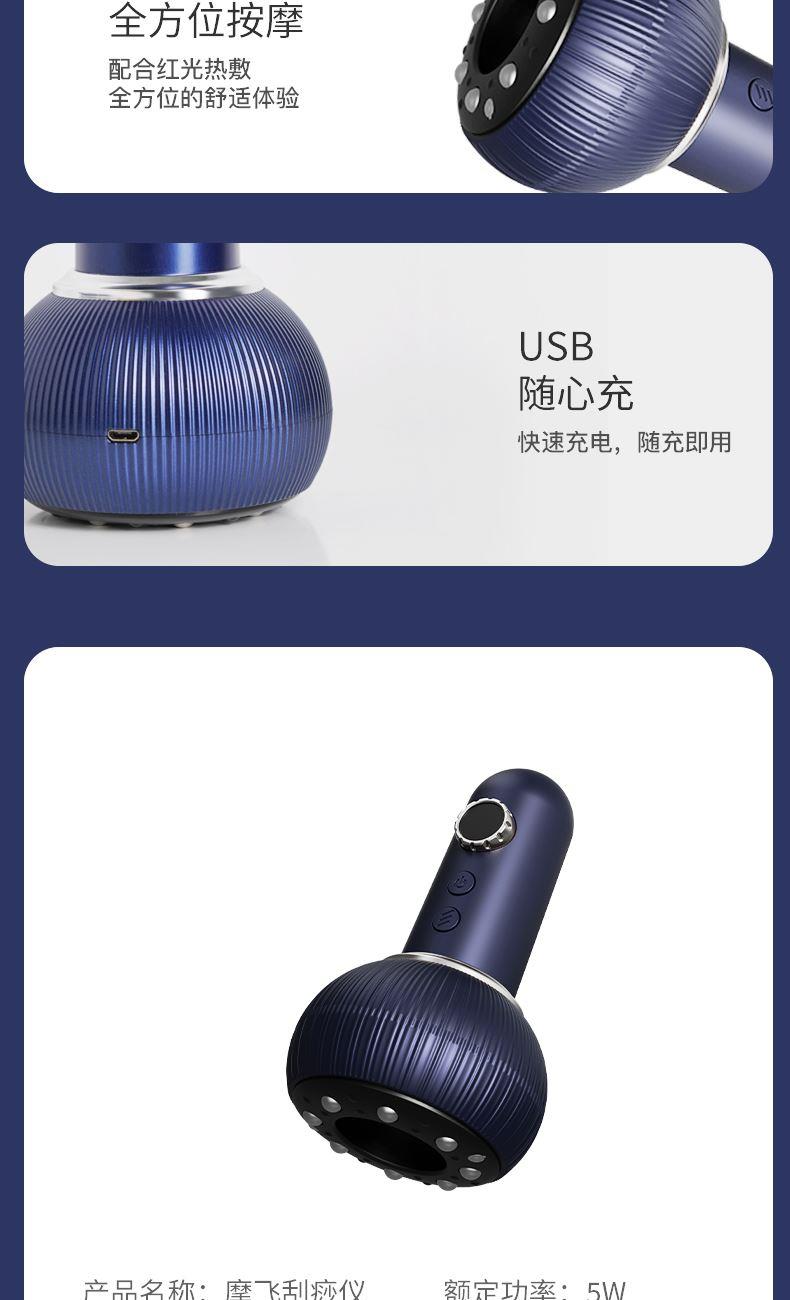 型号 MR3158 69码 6975660323155 产地 浙江温州 净重 232g 毛重 664g 包装尺寸 21X18X10.5cm 大箱尺寸 73x44.5x53.5cm 续航:≈1H(发热低档) 默认工作时间:30min(自动关闭) 充电时间:3小时±0.5小时 充电电压:5V 额定功率:5w 充电接口:USB 电池容量:1200毫安 执行标准:GB4706.1-2005/GB4706.10-2008 配件:主机*1,艾草精油*5,滤棉*4,充电线*1,说明书*1 卖点: 中西合并,结合传统刮痧、拔罐技术,守护健康 8颗浮点均匀出痧 9档拔罐吸力 红外发热,高效促进吸收,无烟无灰 搭配精油,更有效 多场景,多部位,拿起即用