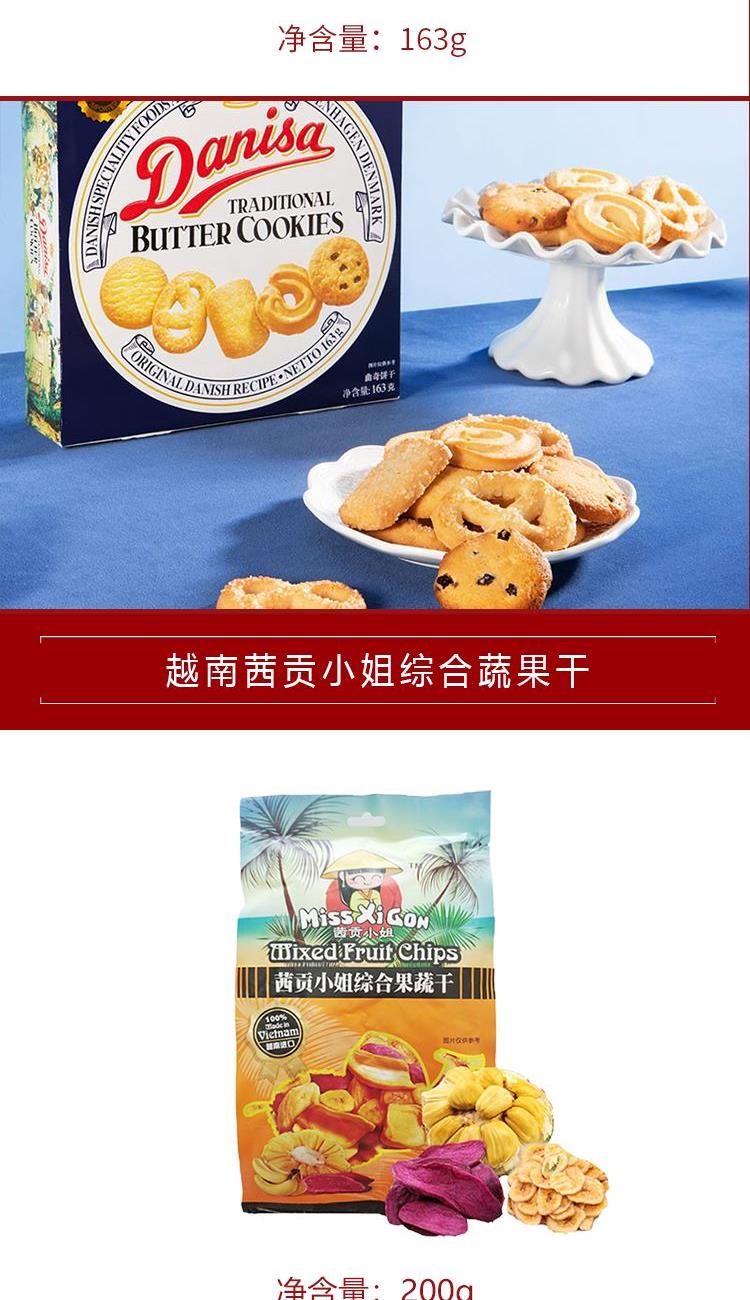 英国沃尔克斯什锦太妃糖(130周年纪念版红色)158g 瑞士三角牛奶巧克力(含蜂蜜及巴旦木糖)100g 瑞士三角黑巧克力(含蜂蜜及巴旦木糖)100g 意大利维趣多可可榛子味饼干225g 意大利维趣多全麦饼干225g 印尼皇冠丹麦曲奇饼干163g盒装 越南茜贡小姐综合蔬果干200g 马来西亚滴朵蓝山风味咖啡90g 越南进口丹帝即食燕麦片1000g 名物精美包装盒:360*360*190mm