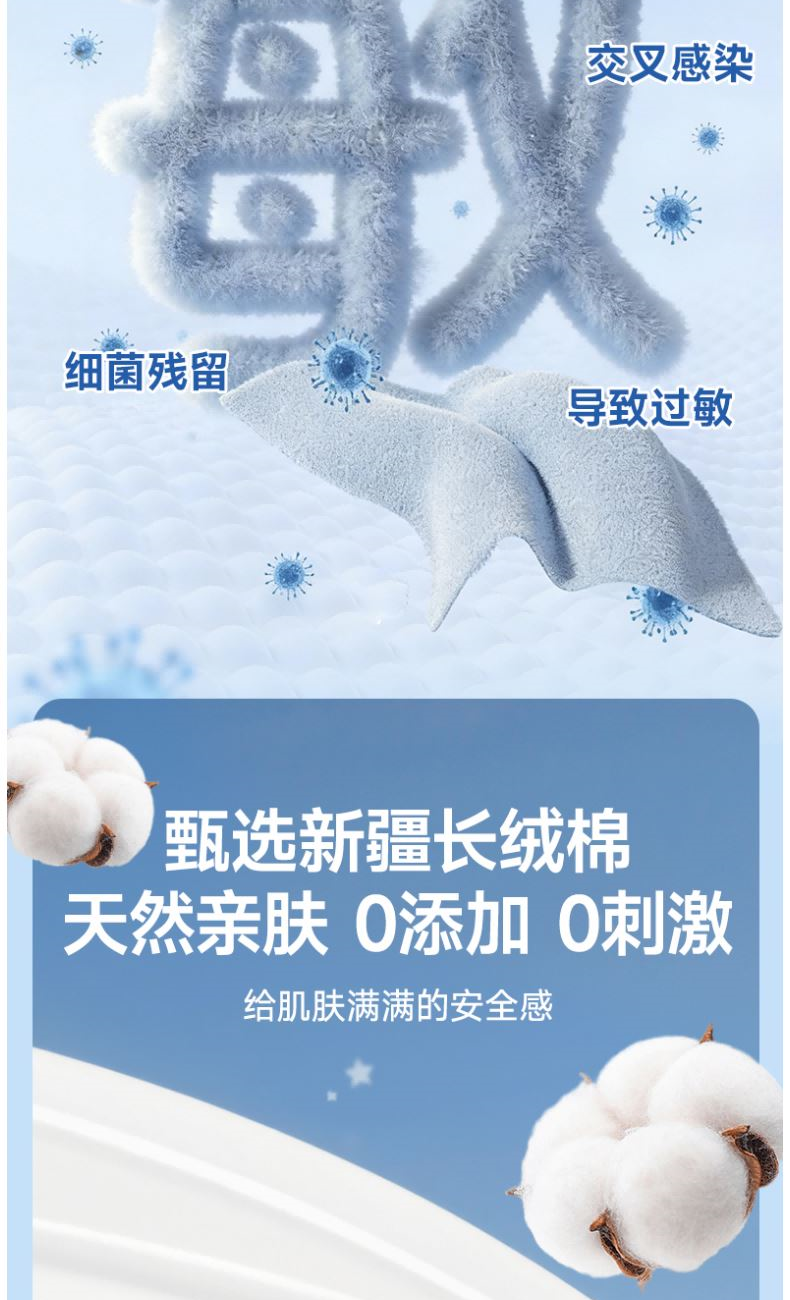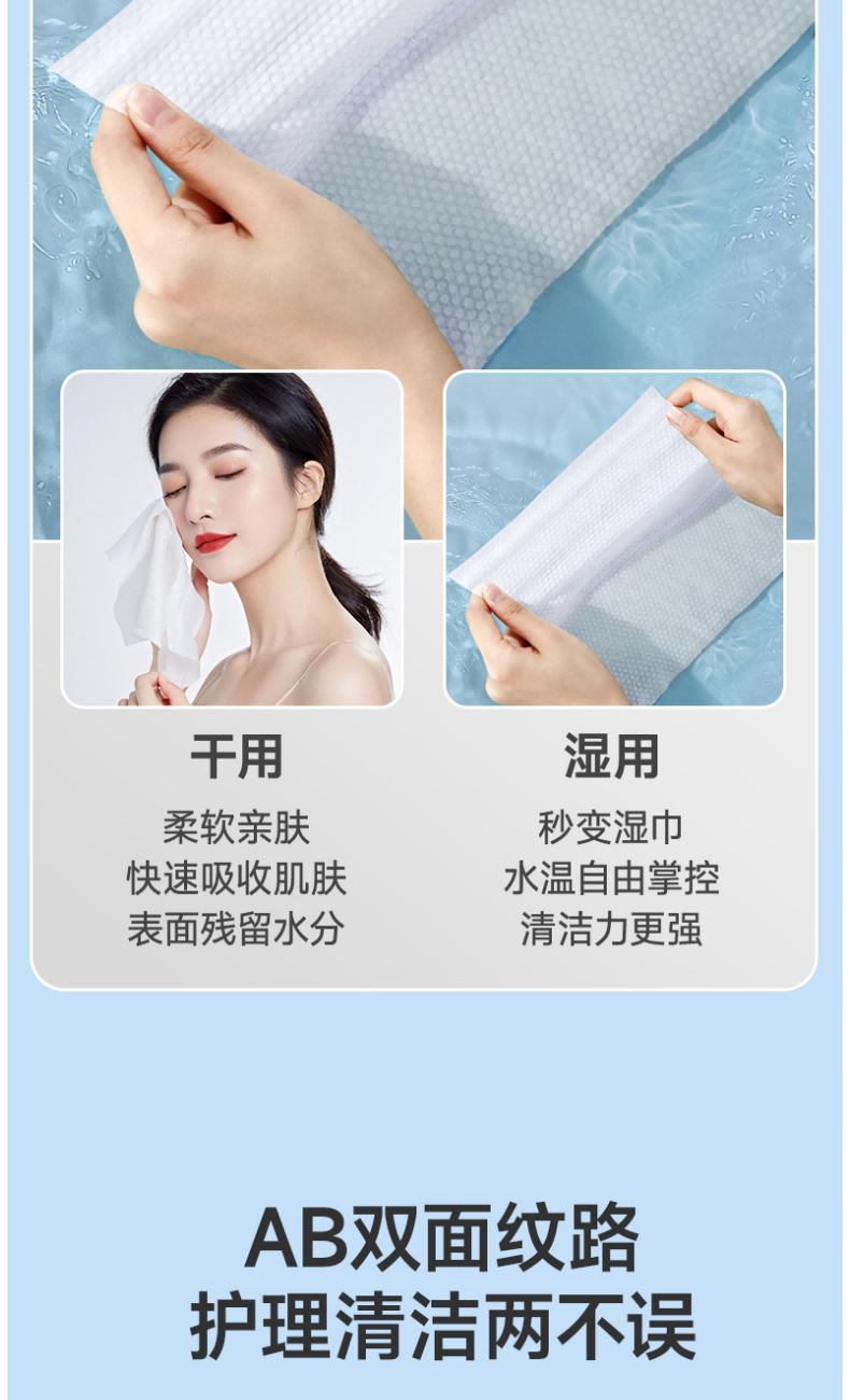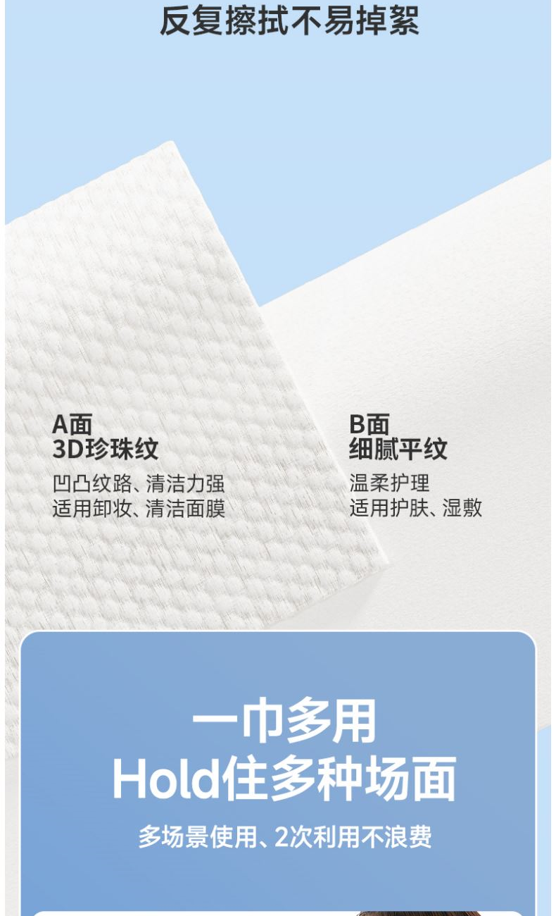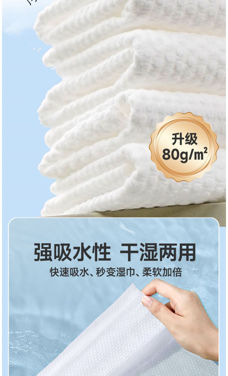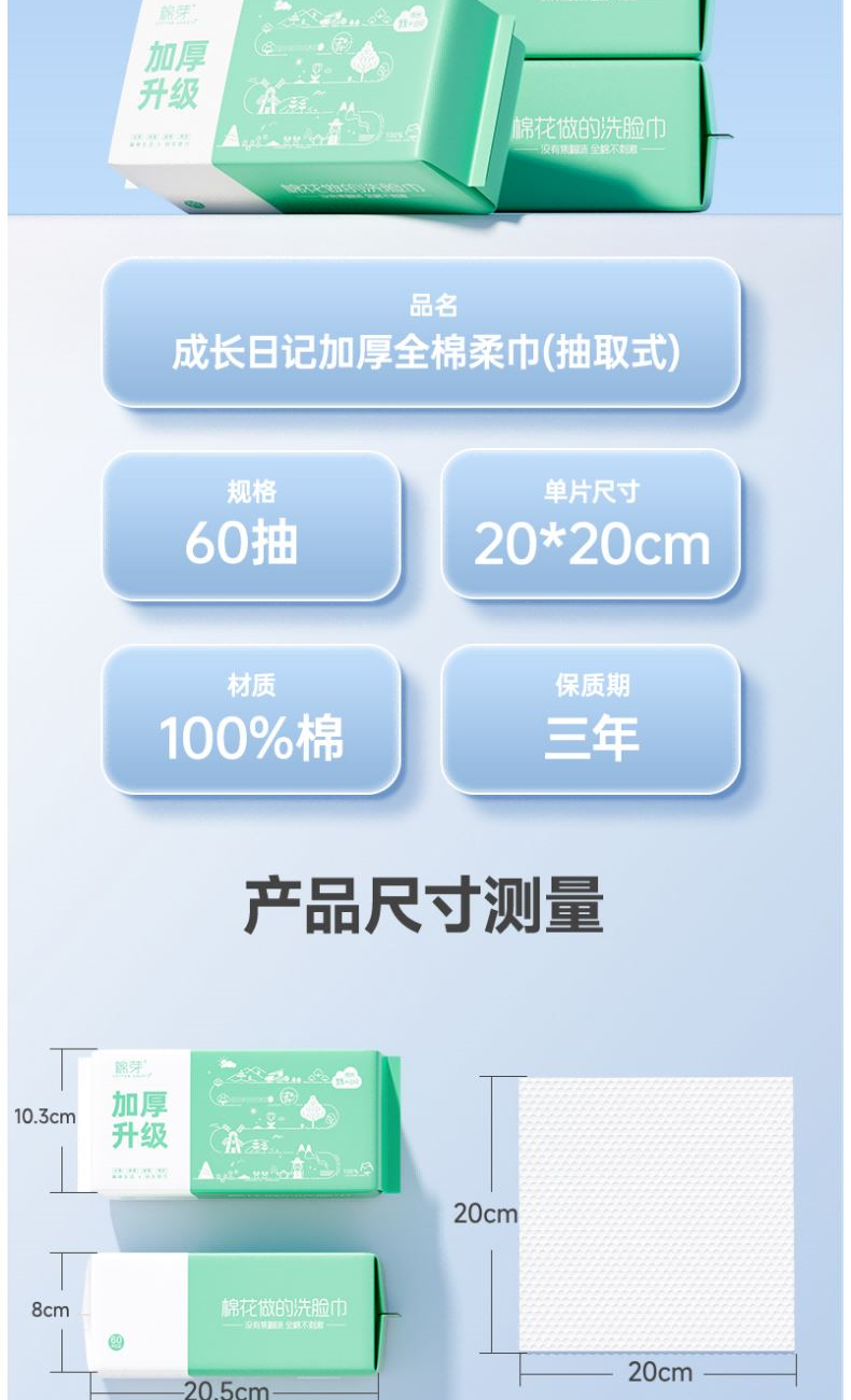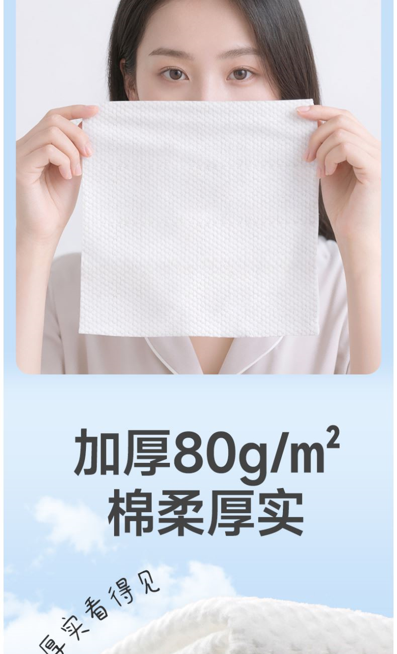 材 质:纯棉 尺 寸:20X20cm 净 含 量:60抽/包*3包 克 重:80g 核心利益点: 1、纯棉,无添加,不易掉毛,不易掉絮。 2、特厚80g/㎡。 产品区隔点 : 特厚80g/㎡双面纹理,珍珠纹清洁力更强。
