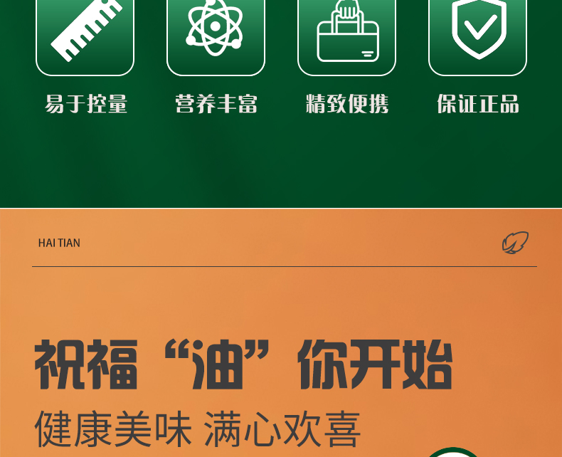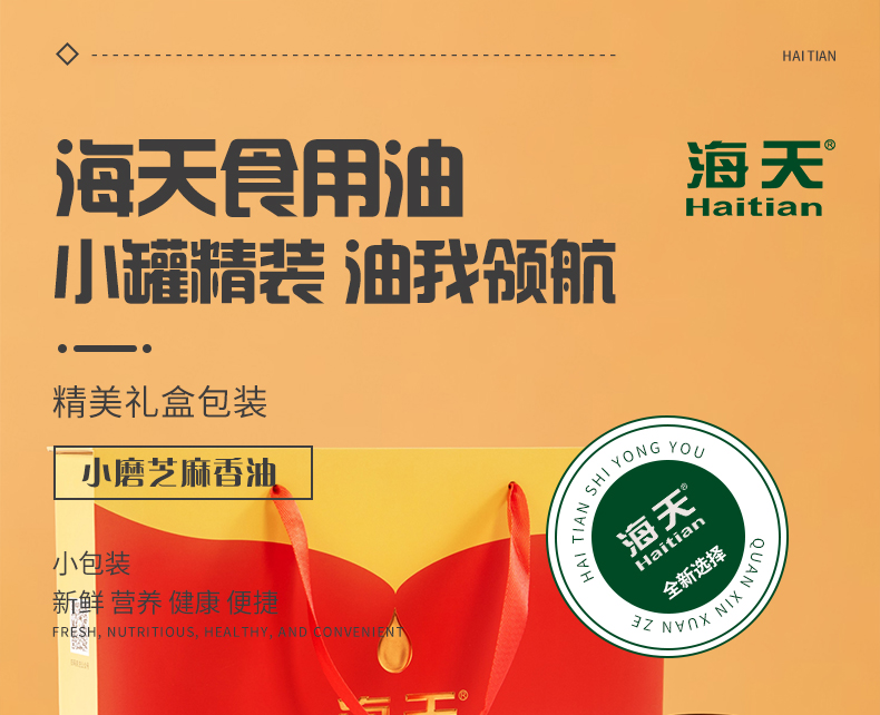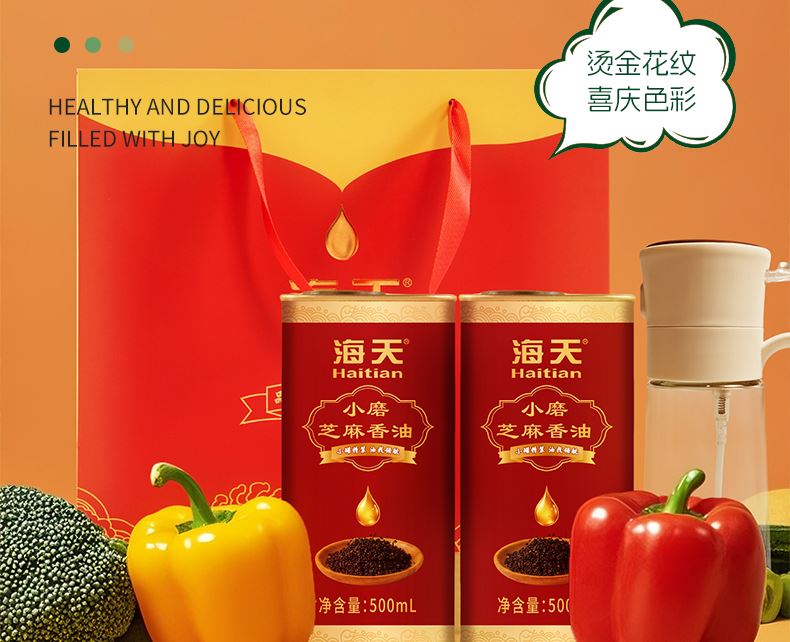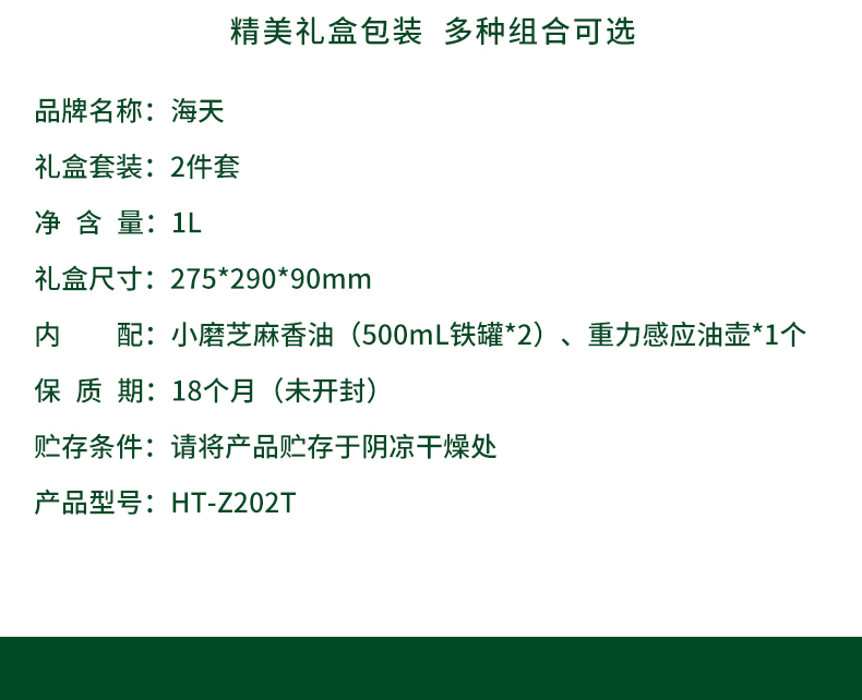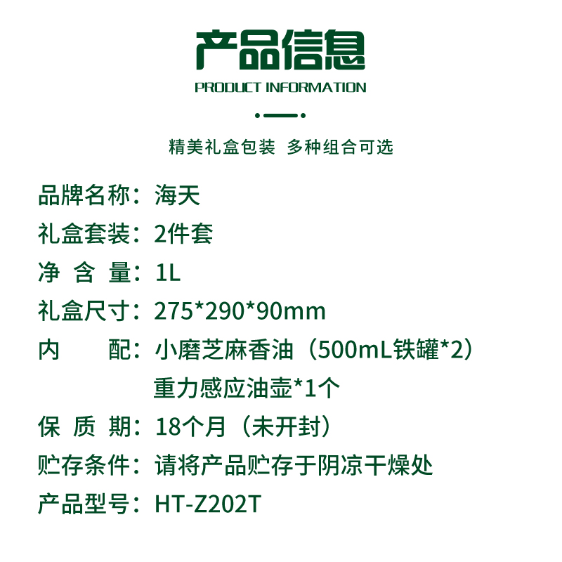 净含量:1L 内配:小磨芝麻香油(500mL铁罐*2) 重力感应油壶*1个 礼盒尺寸:234*288mm 推荐理由:员工福利、积分兑换、项目招标 优选醇正芝麻原料 100 %纯芝麻 独特水代法工艺 匠心古法 持久醇香 味美香浓 油而不腻 凉拌 制馅 蘸料 味碟