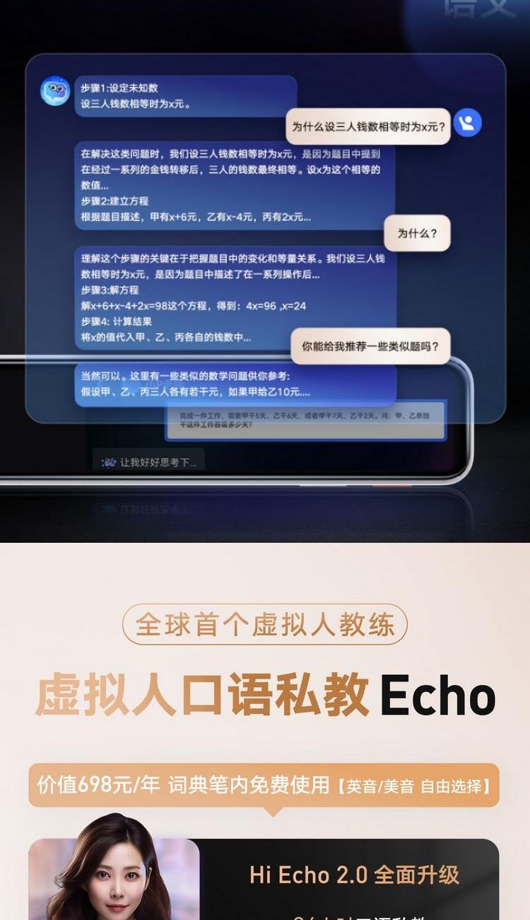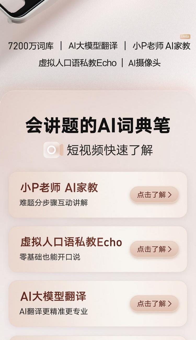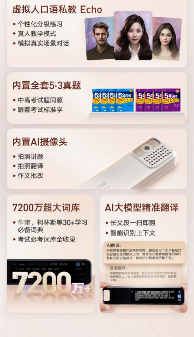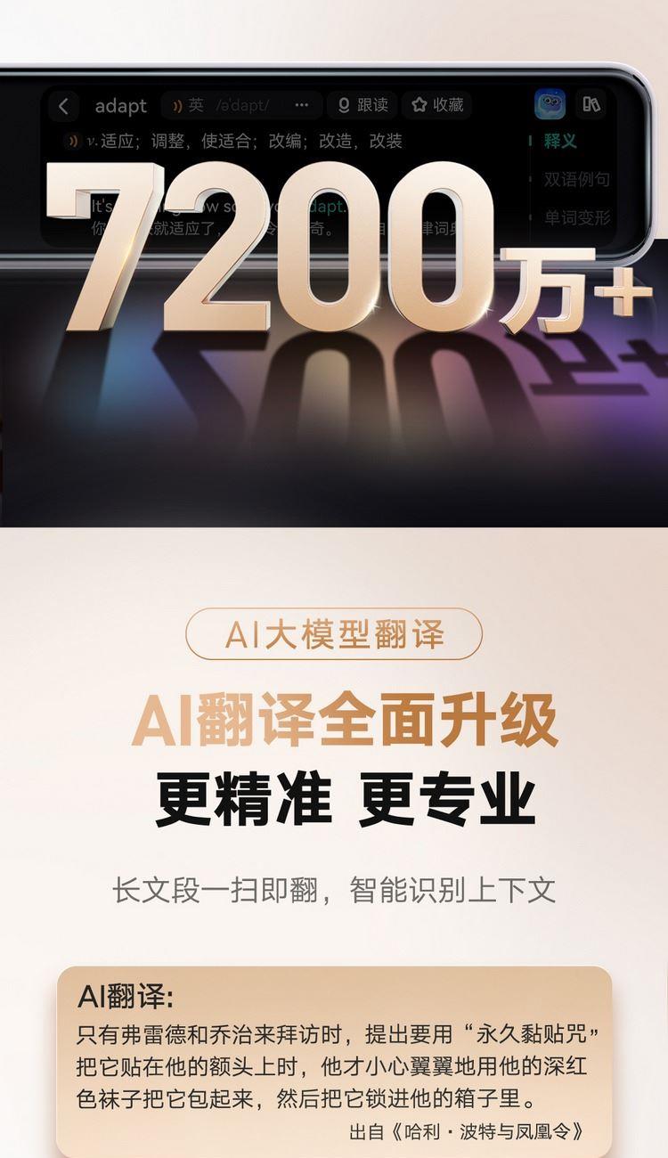 7200万词库,AI大模型翻译 小P老师AI家教,虚拟人口语私教Echo AI摄像头,拍照讲题,拍照翻译,作文批改 0.3秒极速点查,多行同步扫描, 效率翻倍高效学习不用等