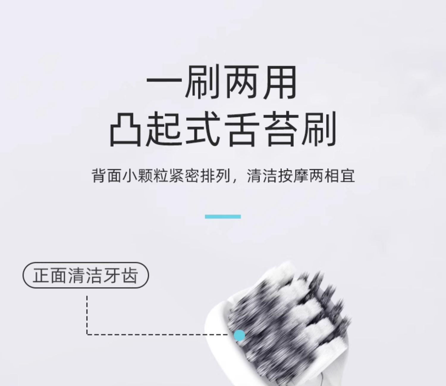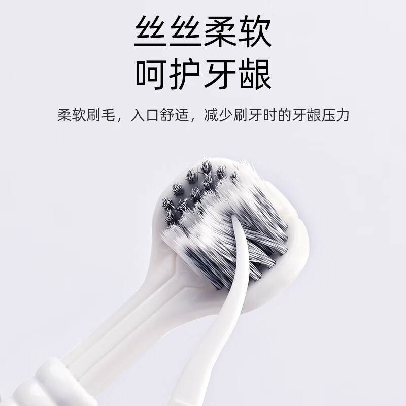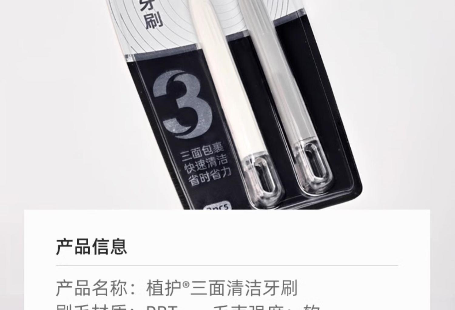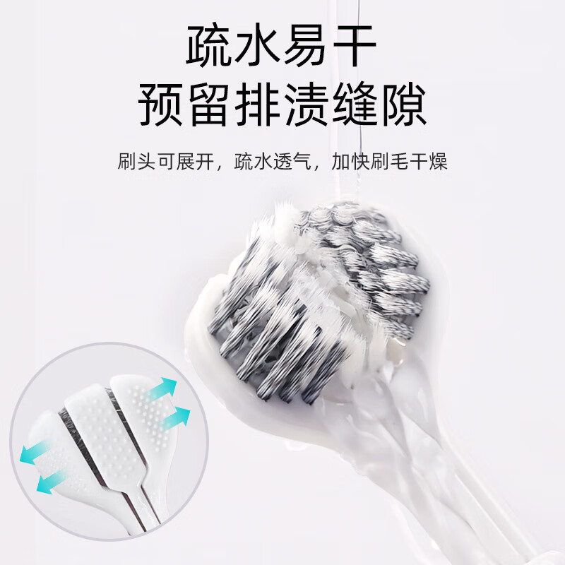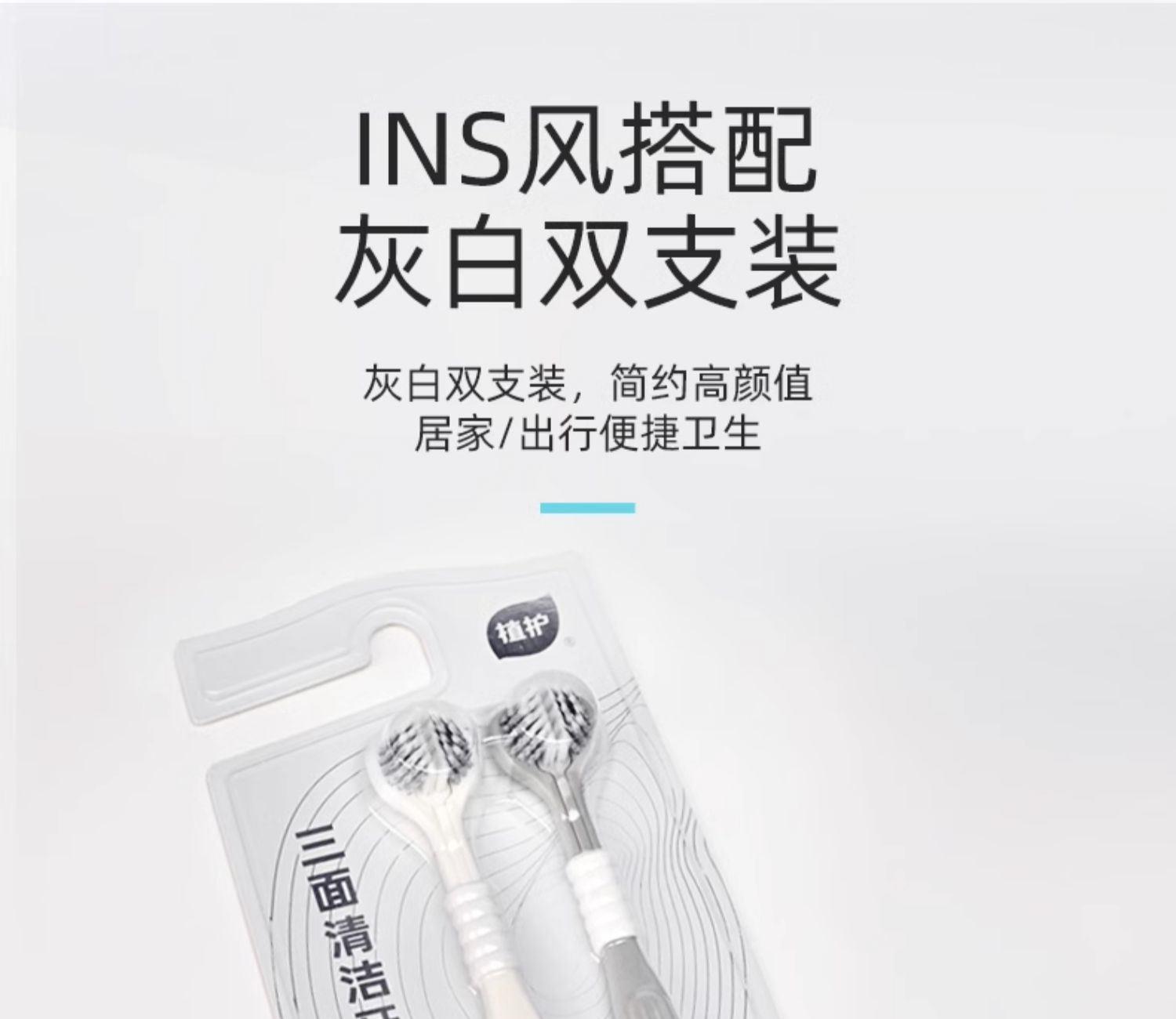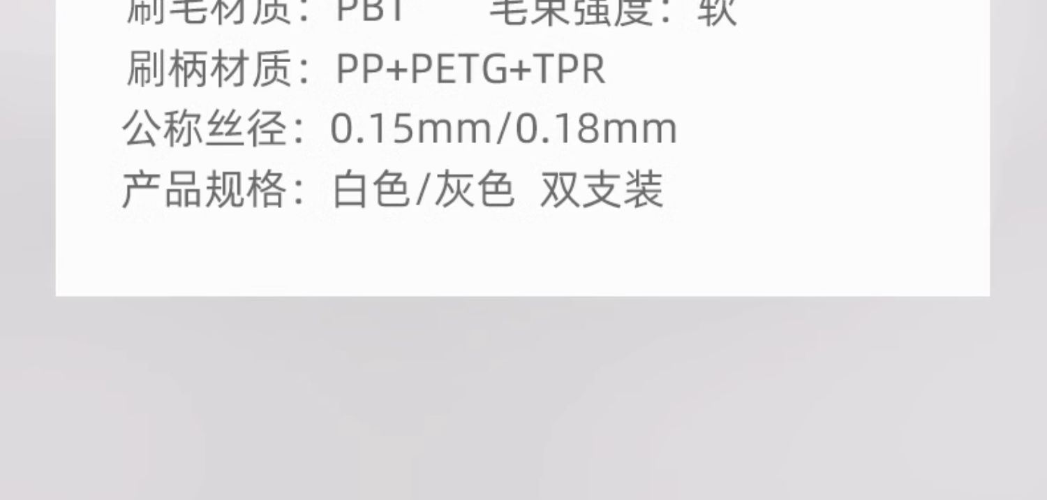 刷毛材质:PBT 毛束强度:软 刷柄材质:PP+PETG+TPR 公称丝径:0.15mm/0.18mm 产品规格:白色/灰色 双支装 保 质 期 :3年 1、一次刷三面,多角度清洁牙齿, 高效清洁; 2、刷毛细密柔软,温柔呵护口腔; 3、包裹式刷牙,清洁更全面,不留刷牙盲区; 4、疏水易干,预留排渍缝隙,疏水透气; 5、柔软刷毛,入口舒适,减少刷牙时的牙龈压力; 6、一刷两用,凸起式舌苔刷,背面小颗粒紧密排列,可清洁舌苔, 7、带防滑手柄,握把舒适 8、可悬挂设计,卫生便捷。