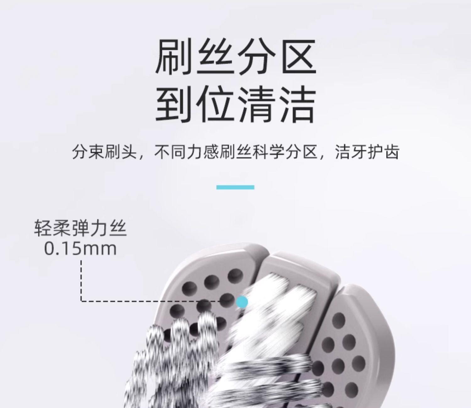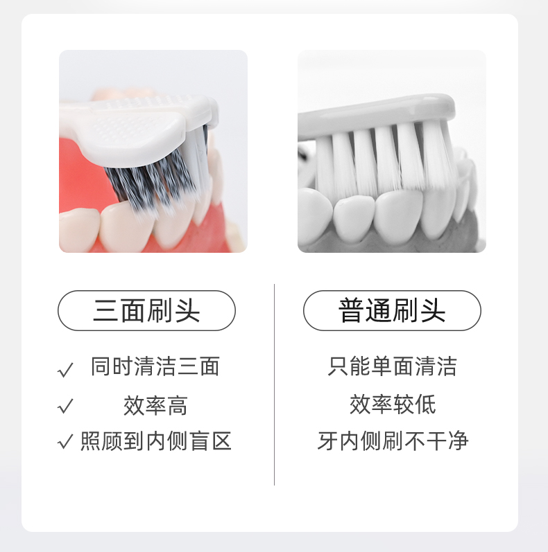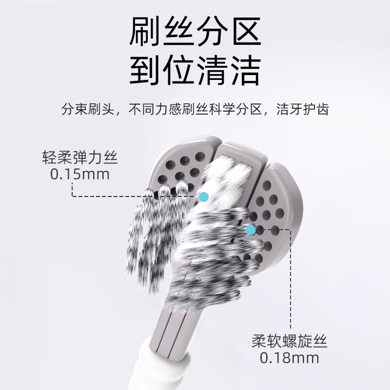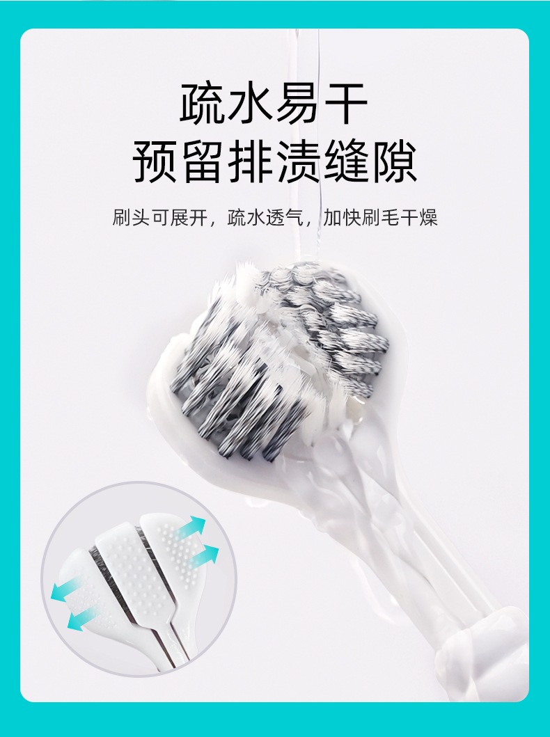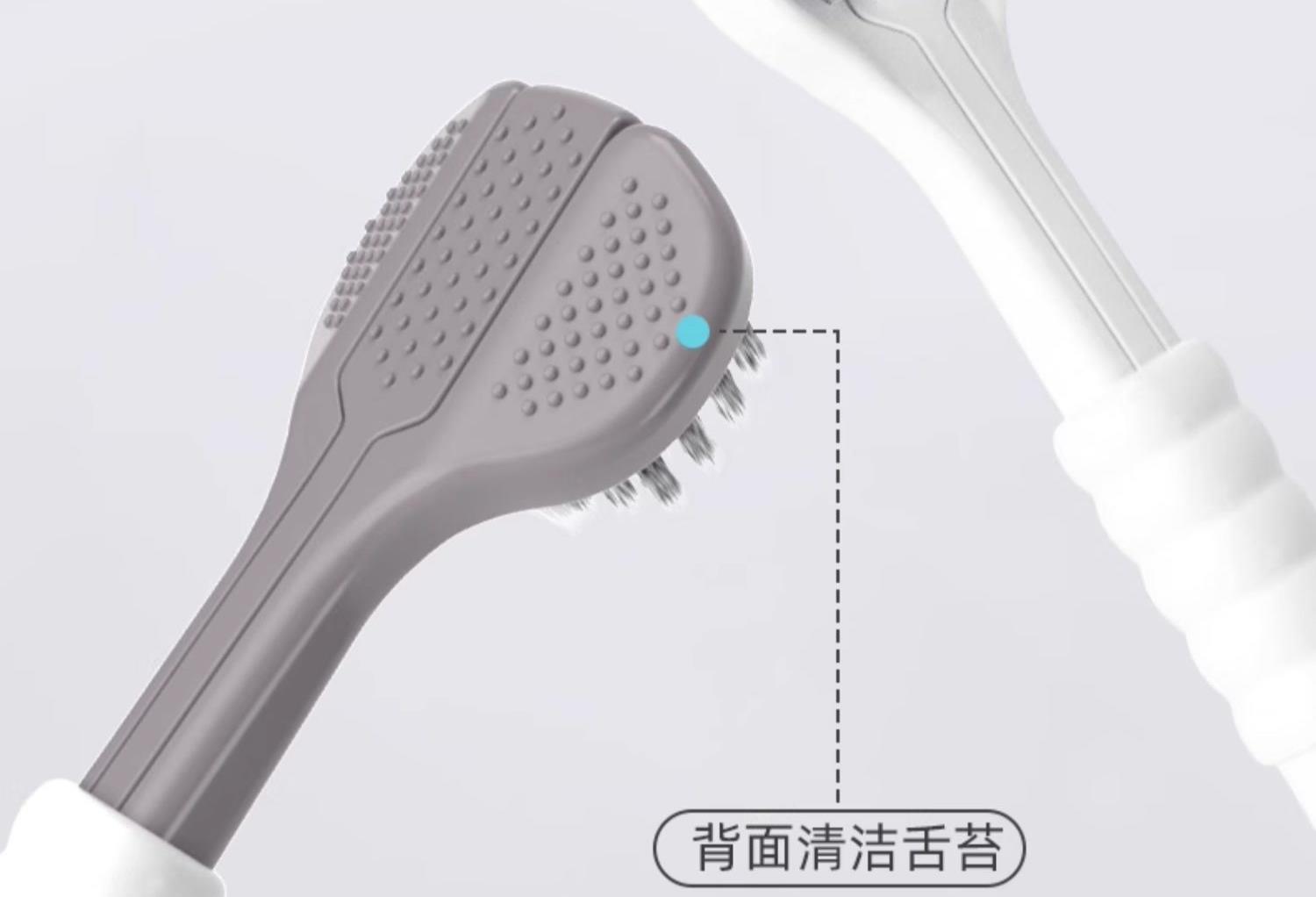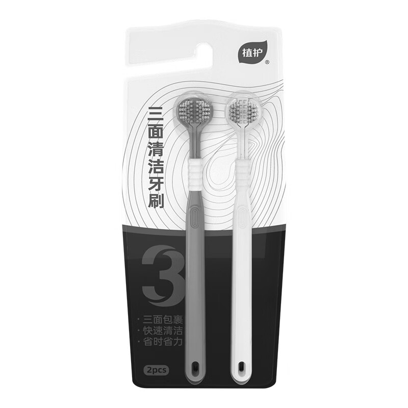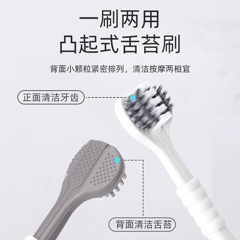 刷毛材质:PBT 毛束强度:软 刷柄材质:PP+PETG+TPR 公称丝径:0.15mm/0.18mm 产品规格:白色/灰色 双支装 保 质 期 :3年 1、一次刷三面,多角度清洁牙齿, 高效清洁; 2、刷毛细密柔软,温柔呵护口腔; 3、包裹式刷牙,清洁更全面,不留刷牙盲区; 4、疏水易干,预留排渍缝隙,疏水透气; 5、柔软刷毛,入口舒适,减少刷牙时的牙龈压力; 6、一刷两用,凸起式舌苔刷,背面小颗粒紧密排列,可清洁舌苔, 7、带防滑手柄,握把舒适 8、可悬挂设计,卫生便捷。