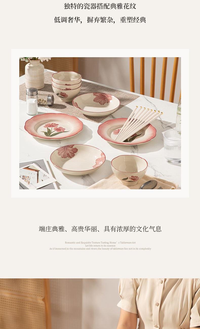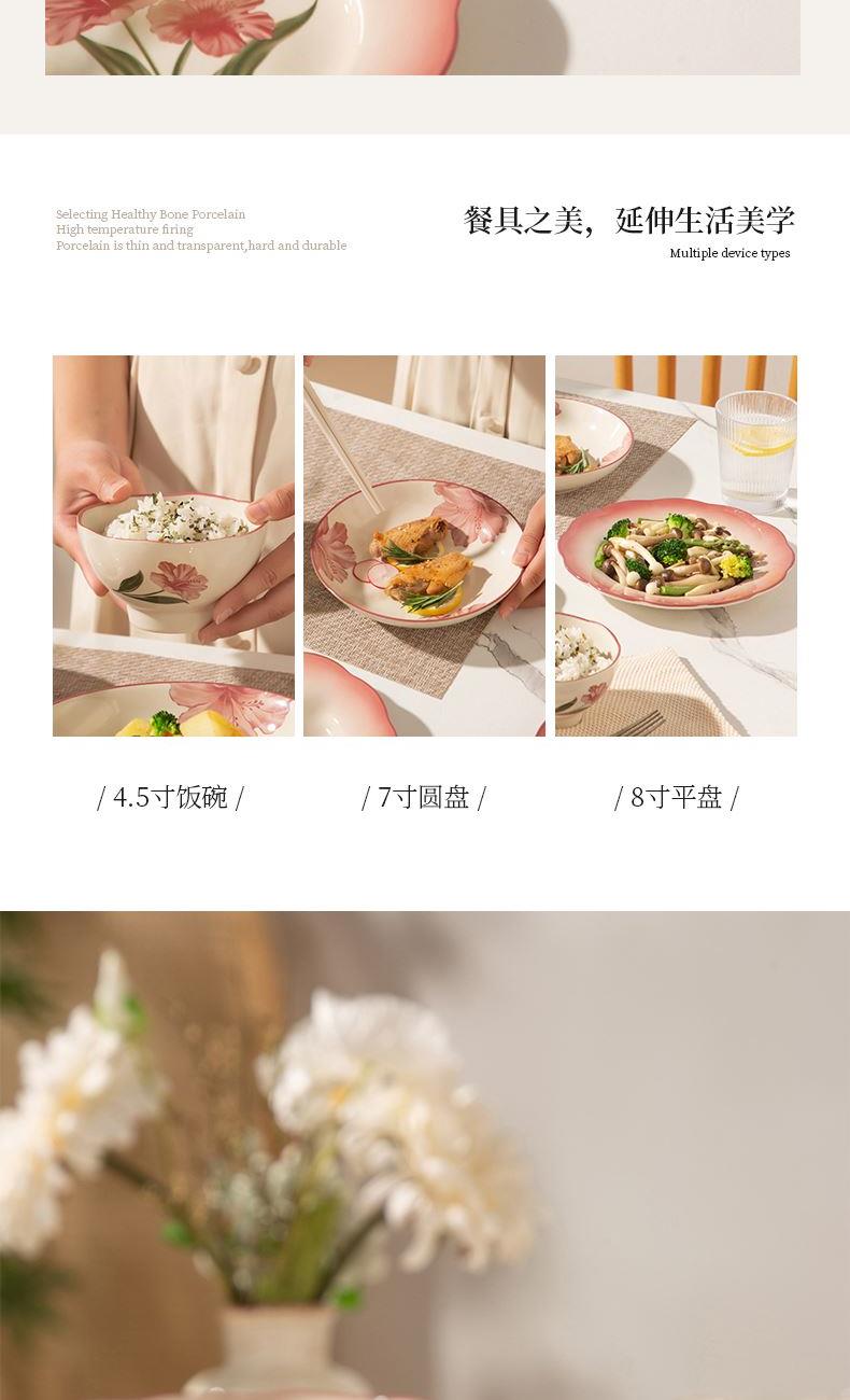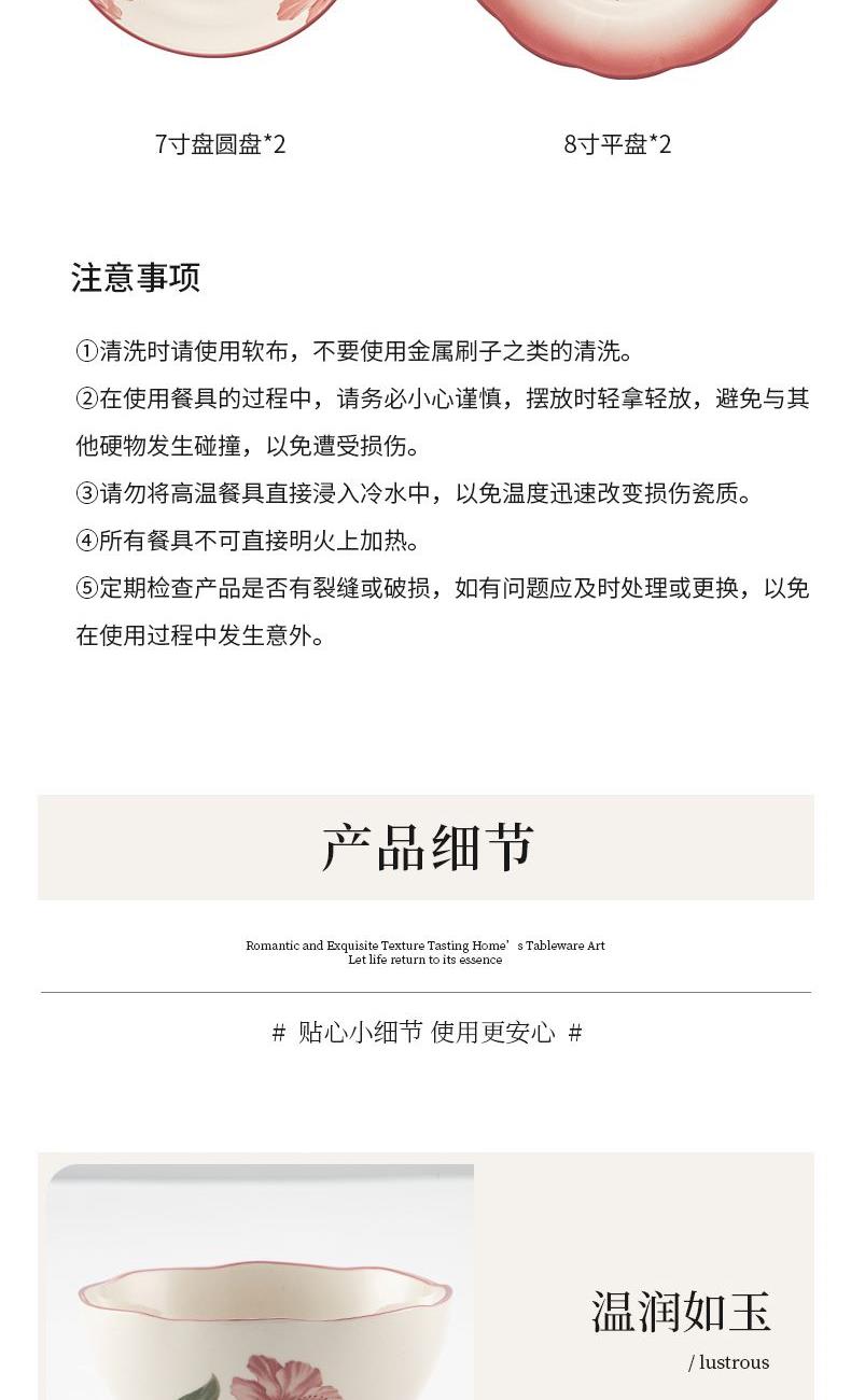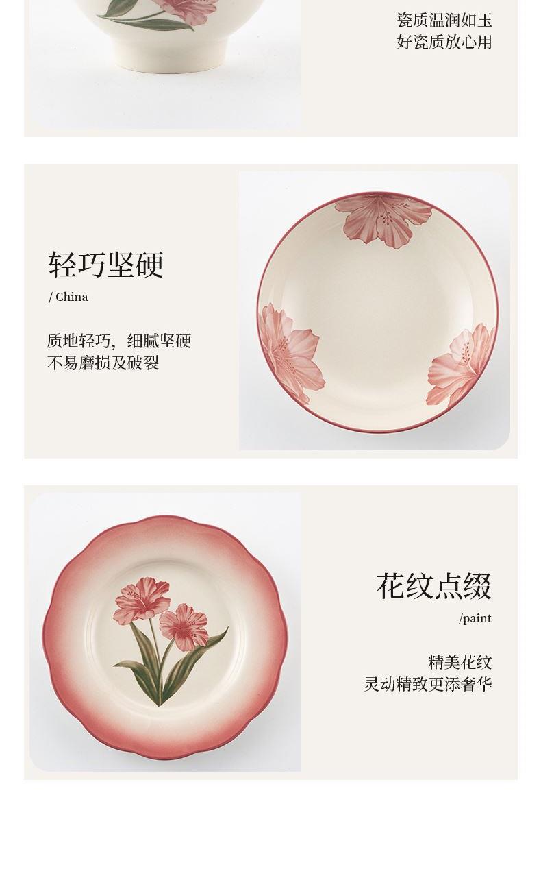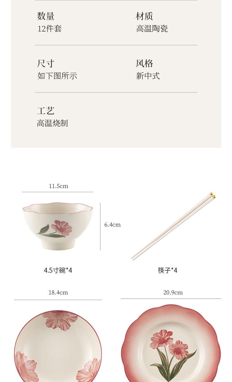 配 置:4.5寸碗*4 7寸盘圆盘*2 8寸平盘*2 筷子*4 参 数:12件套 颜 色:粉红色 材 质:高温陶瓷 1:精选优质陶土,高温烧制,釉面光滑易清洗,省时省力,即刻干净如新。 2:可进烤箱、微波炉,洗碗机,釉下花色永不褪色,更健康,使用更安全。 3:碗盘之上,红色的花朵在碗盘上肆意绽放,为餐桌增添了一抹浓郁的复古韵味,彰显着独特的品味。 4:红花寓意着繁荣昌盛、幸福美满,象征着生活的富足与喜悦。让你在享受美食的同时,感受到浓浓的幸福与温暖。