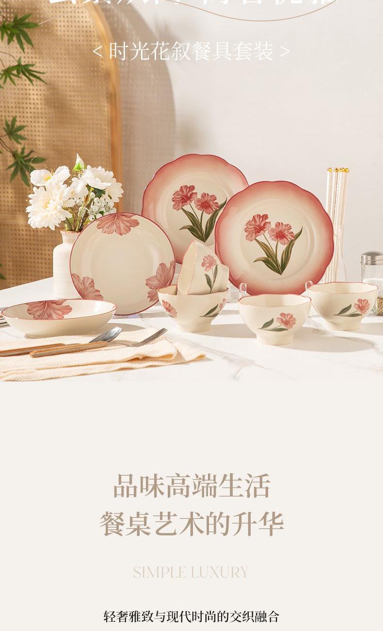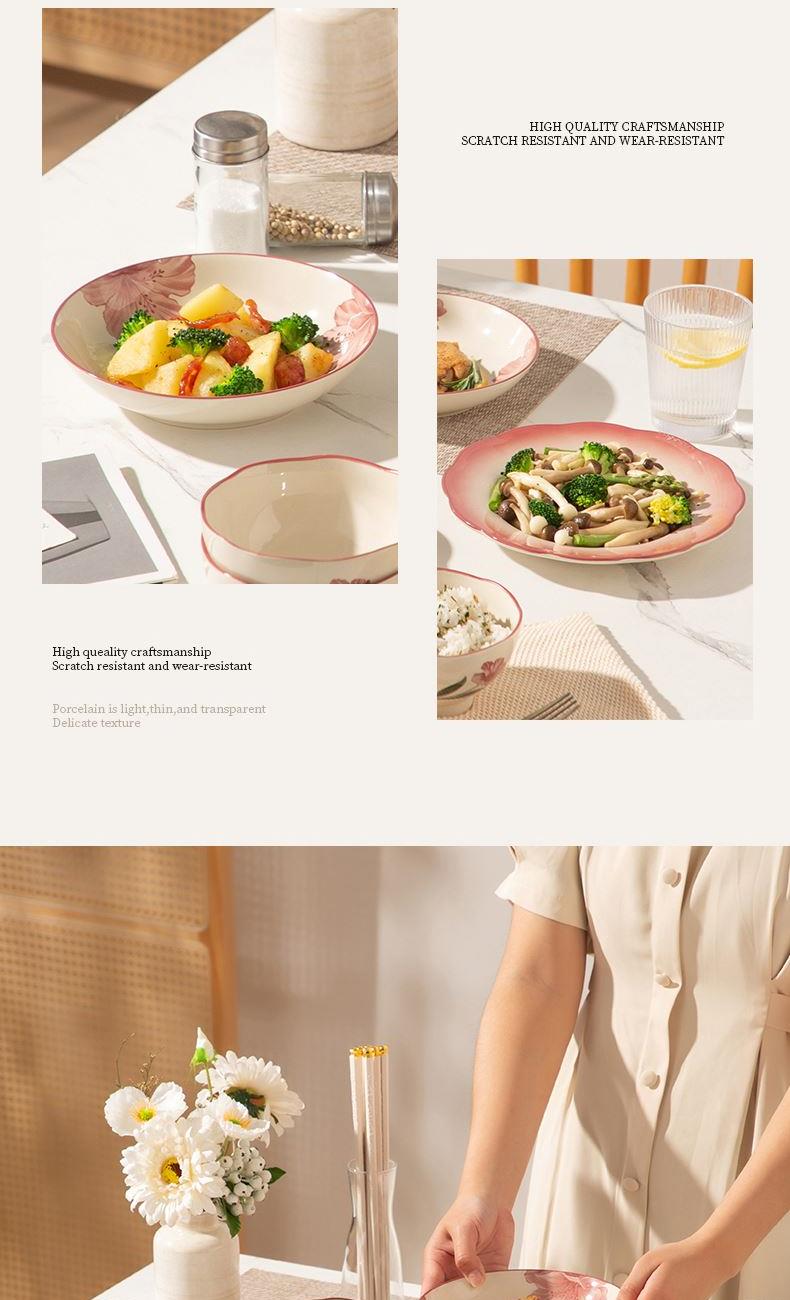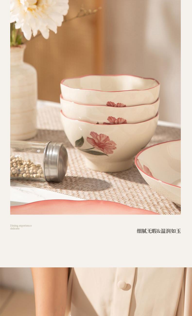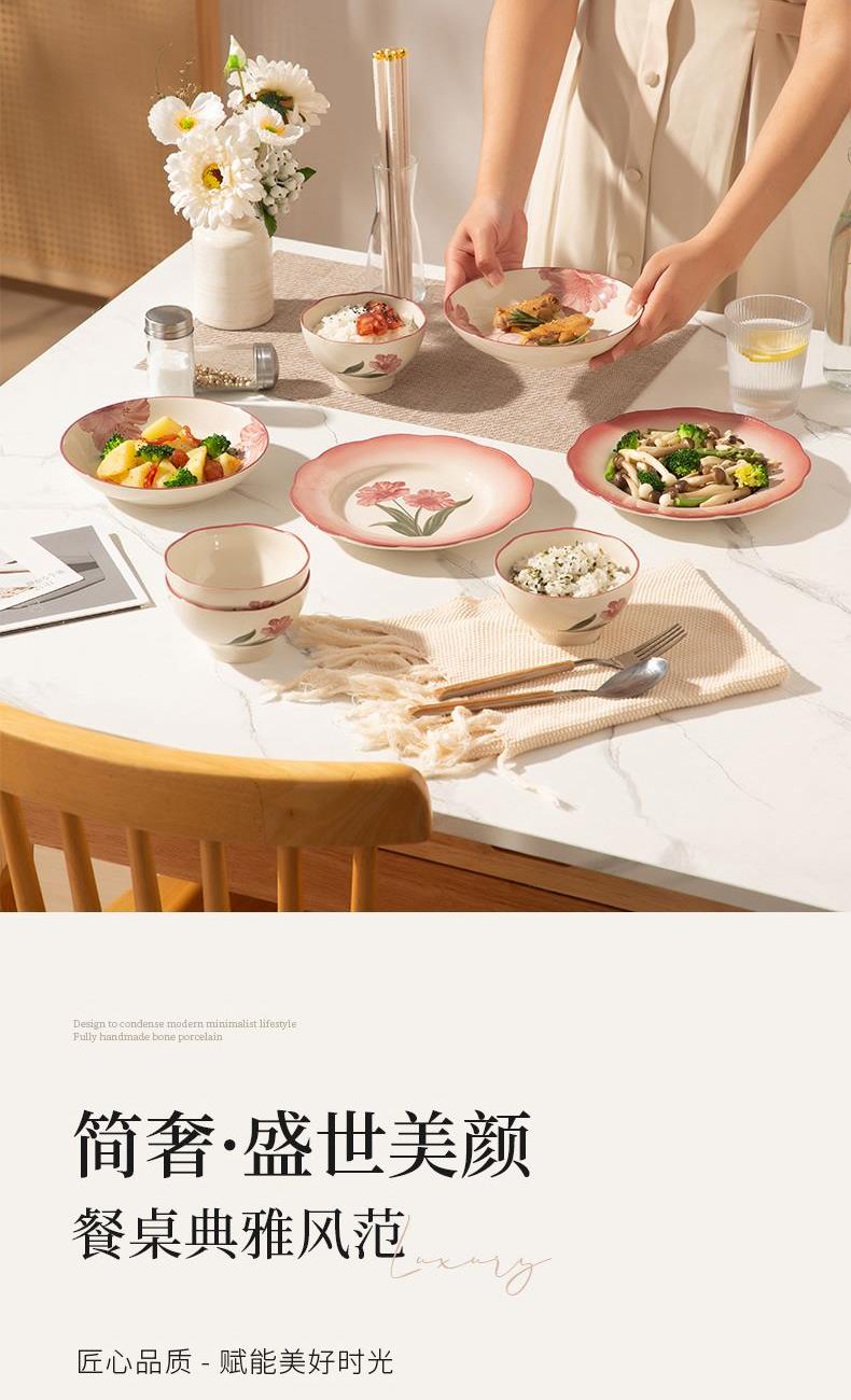 配 置:4.5寸碗*4 7寸盘圆盘*2 8寸平盘*2 筷子*4 参 数:12件套 颜 色:粉红色 材 质:高温陶瓷 1:精选优质陶土,高温烧制,釉面光滑易清洗,省时省力,即刻干净如新。 2:可进烤箱、微波炉,洗碗机,釉下花色永不褪色,更健康,使用更安全。 3:碗盘之上,红色的花朵在碗盘上肆意绽放,为餐桌增添了一抹浓郁的复古韵味,彰显着独特的品味。 4:红花寓意着繁荣昌盛、幸福美满,象征着生活的富足与喜悦。让你在享受美食的同时,感受到浓浓的幸福与温暖。