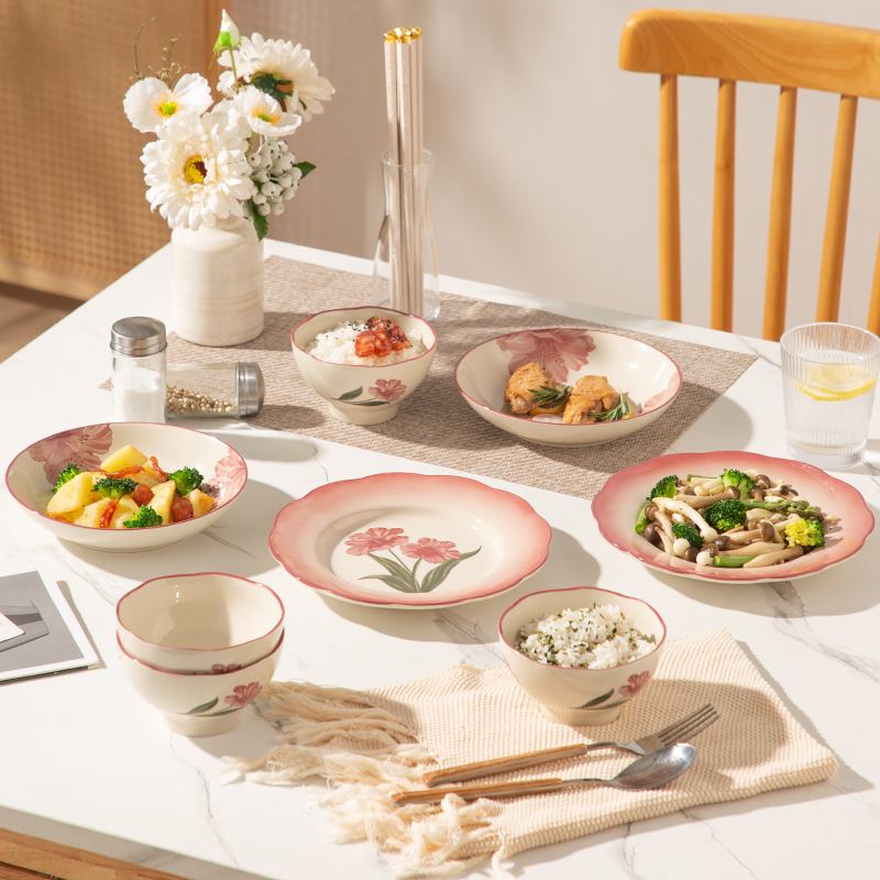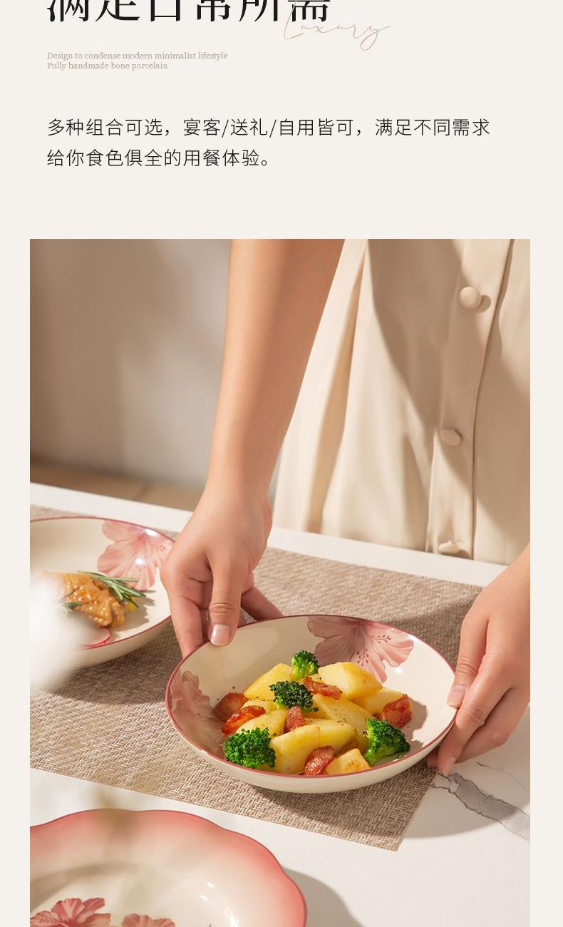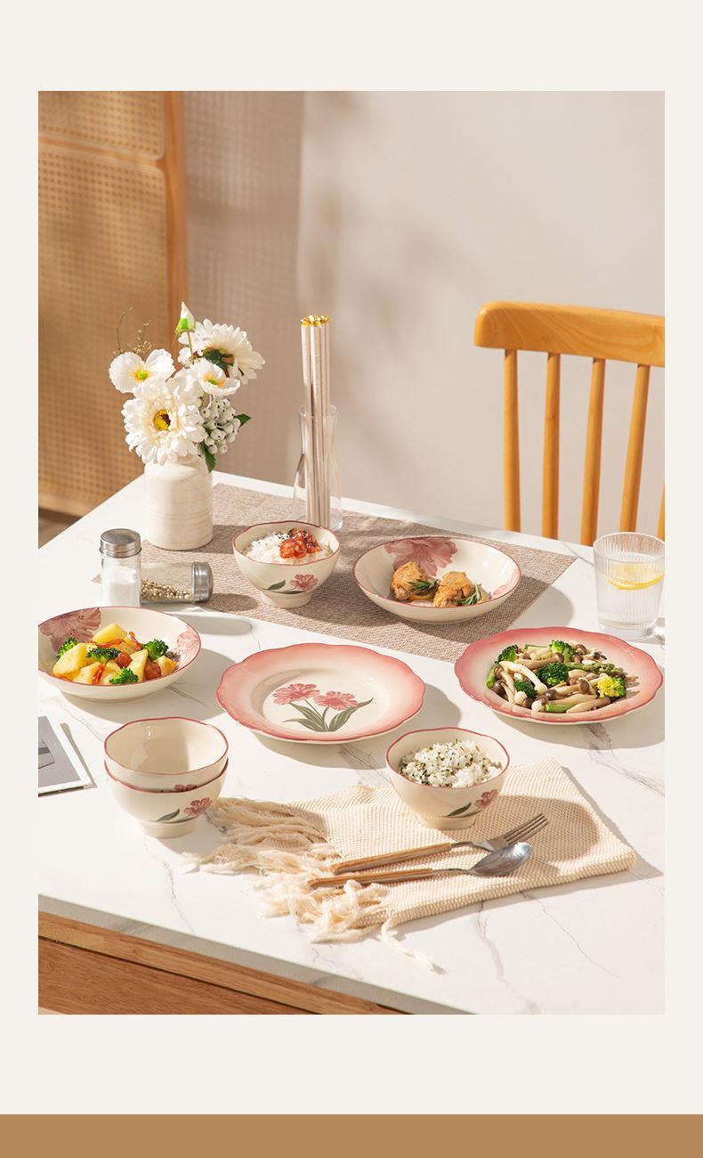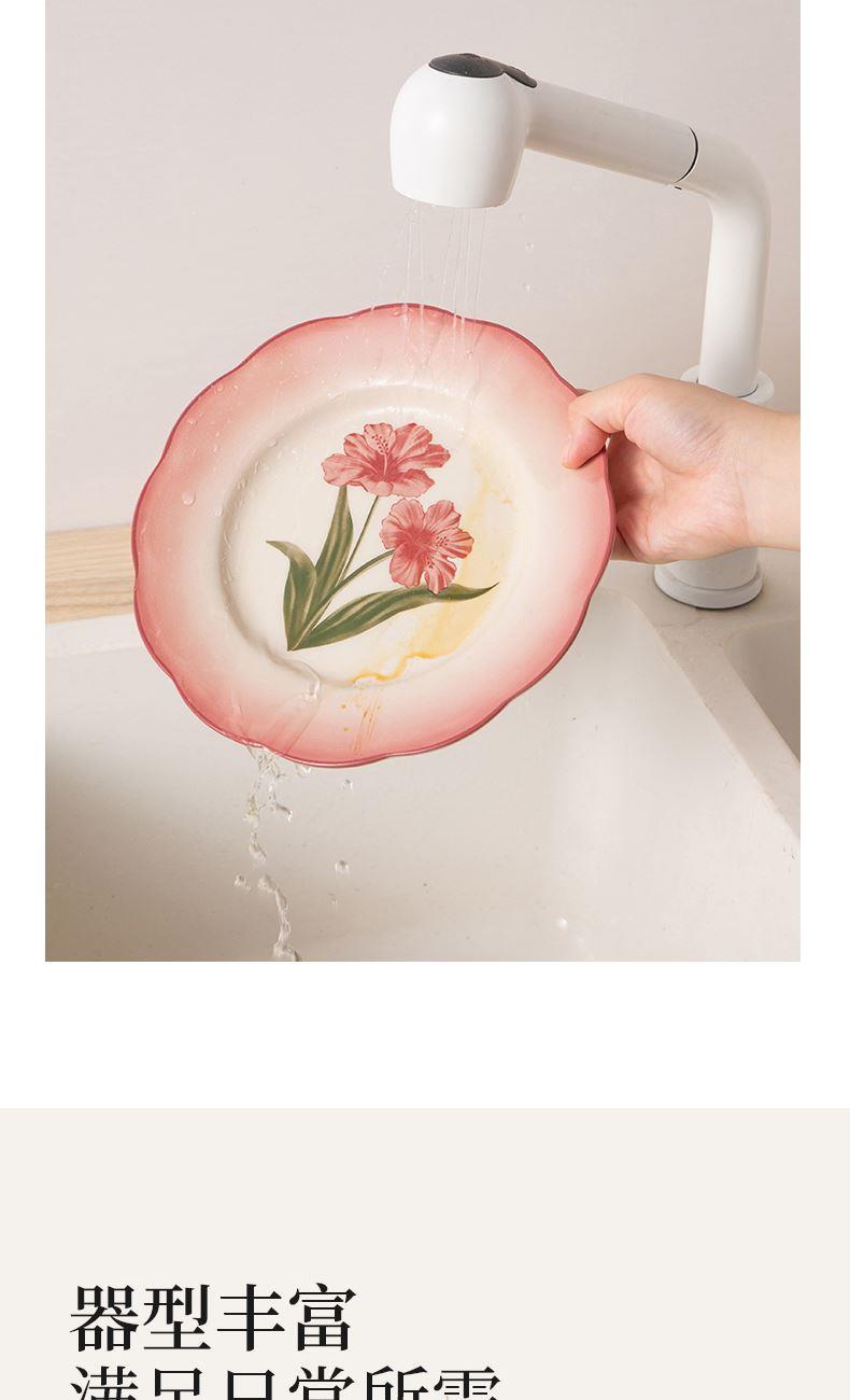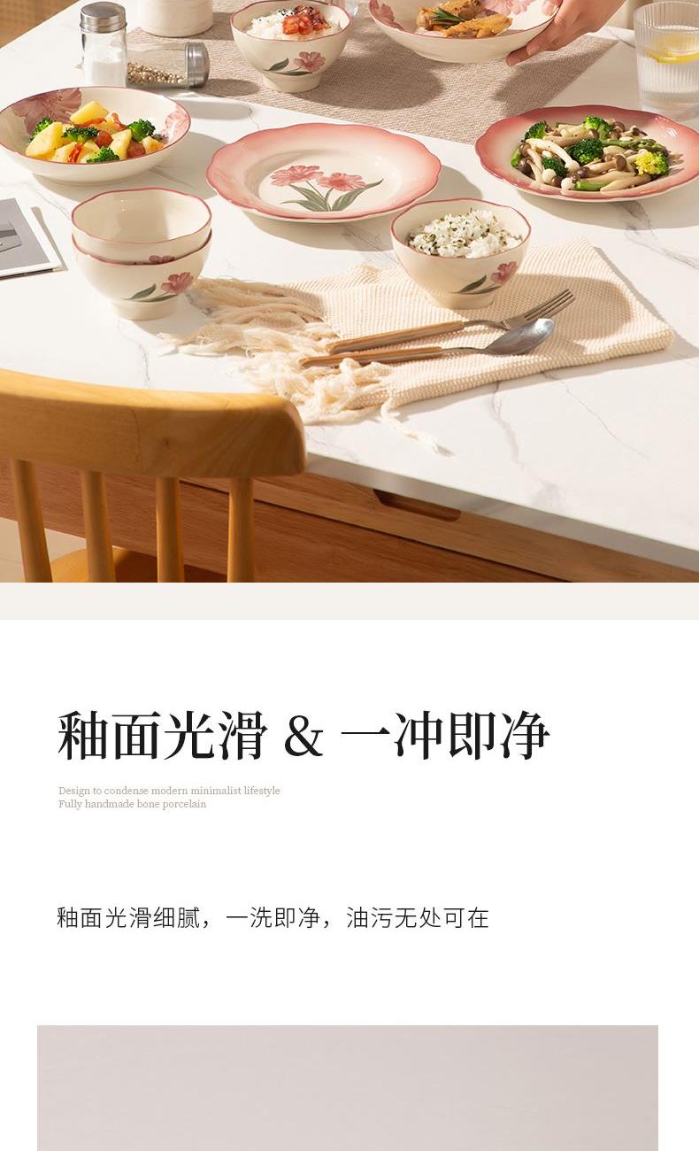 配 置:4.5寸碗*4 7寸盘圆盘*2 8寸平盘*2 筷子*4 参 数:12件套 颜 色:粉红色 材 质:高温陶瓷 1:精选优质陶土,高温烧制,釉面光滑易清洗,省时省力,即刻干净如新。 2:可进烤箱、微波炉,洗碗机,釉下花色永不褪色,更健康,使用更安全。 3:碗盘之上,红色的花朵在碗盘上肆意绽放,为餐桌增添了一抹浓郁的复古韵味,彰显着独特的品味。 4:红花寓意着繁荣昌盛、幸福美满,象征着生活的富足与喜悦。让你在享受美食的同时,感受到浓浓的幸福与温暖。