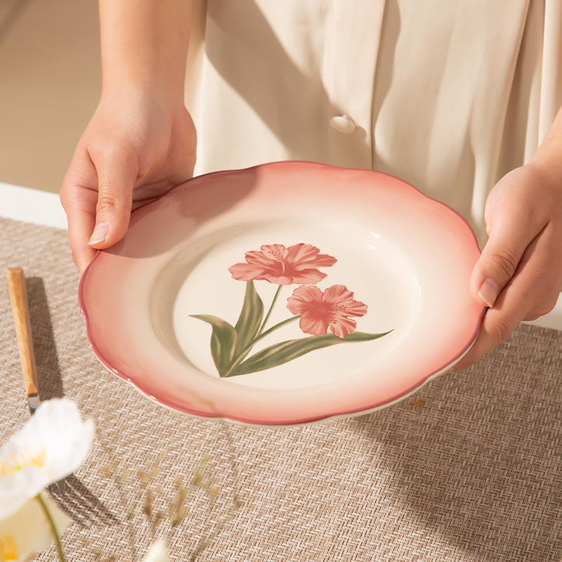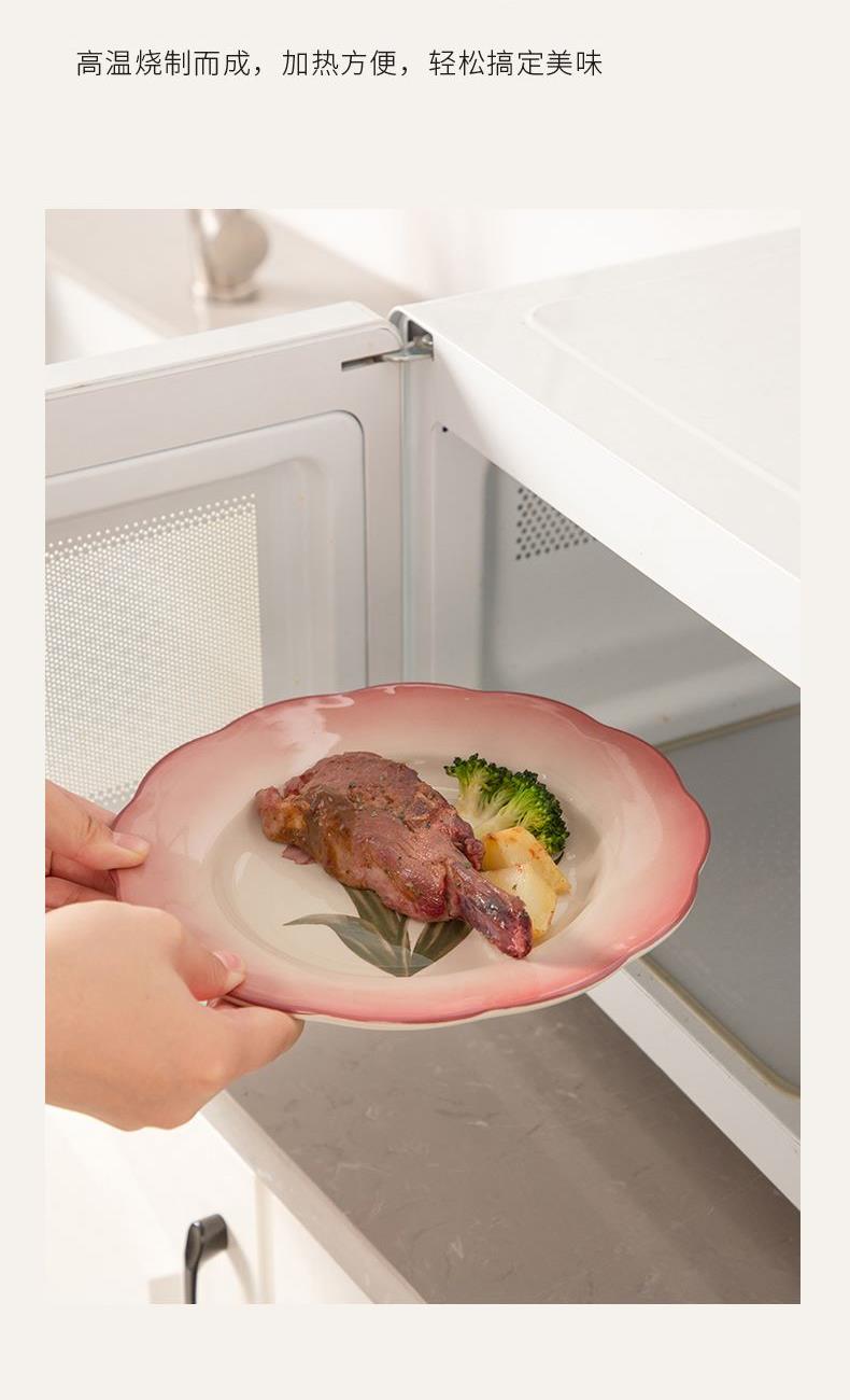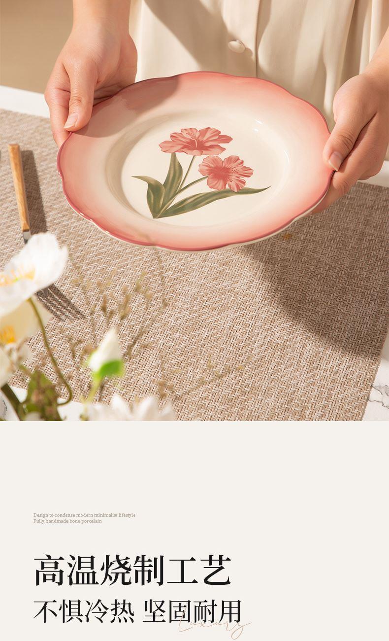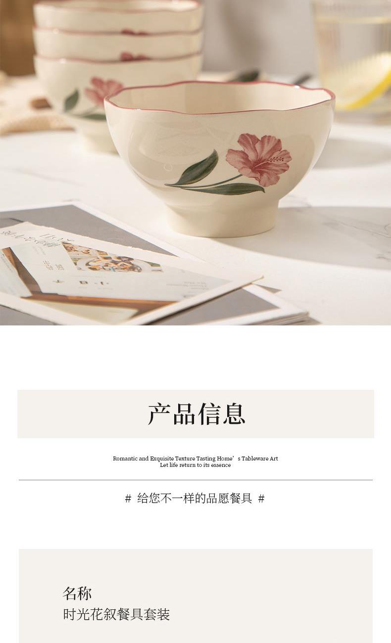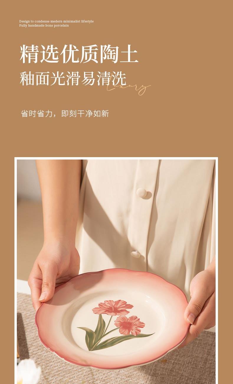 配 置:4.5寸碗*4 7寸盘圆盘*2 8寸平盘*2 筷子*4 参 数:12件套 颜 色:粉红色 材 质:高温陶瓷 1:精选优质陶土,高温烧制,釉面光滑易清洗,省时省力,即刻干净如新。 2:可进烤箱、微波炉,洗碗机,釉下花色永不褪色,更健康,使用更安全。 3:碗盘之上,红色的花朵在碗盘上肆意绽放,为餐桌增添了一抹浓郁的复古韵味,彰显着独特的品味。 4:红花寓意着繁荣昌盛、幸福美满,象征着生活的富足与喜悦。让你在享受美食的同时,感受到浓浓的幸福与温暖。