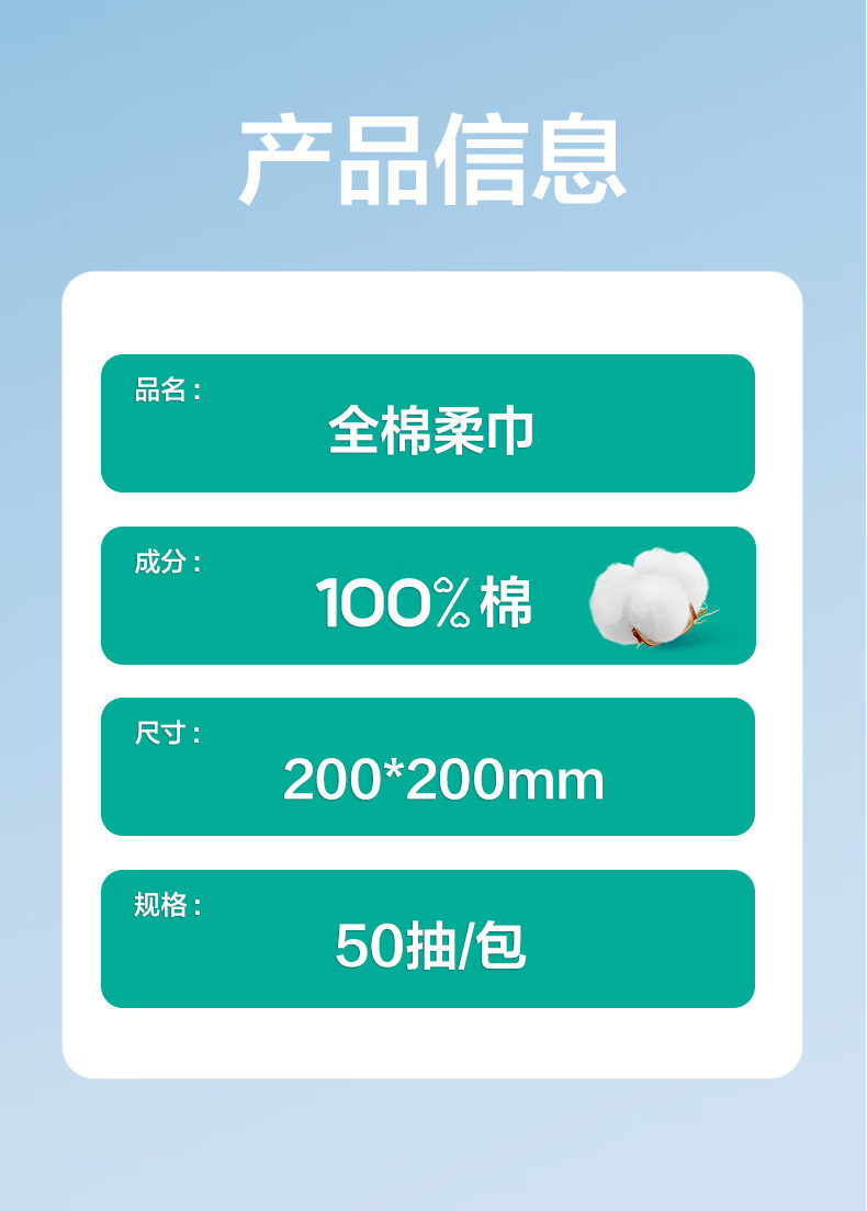 2022全棉柔巾60g平纹 尺寸:200mm*200mm 数量:50片/包 产品说明:加厚款