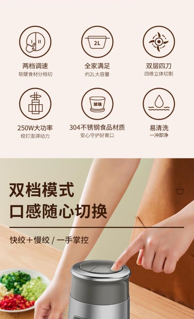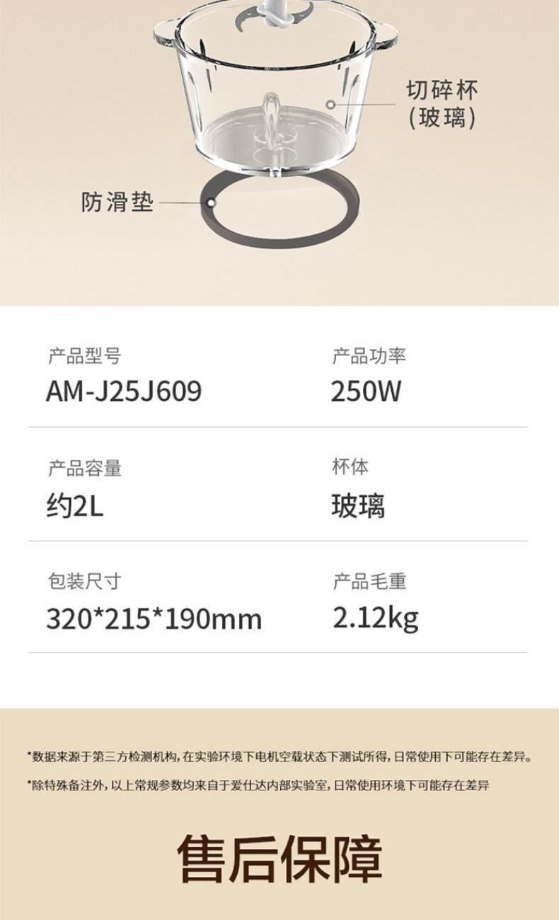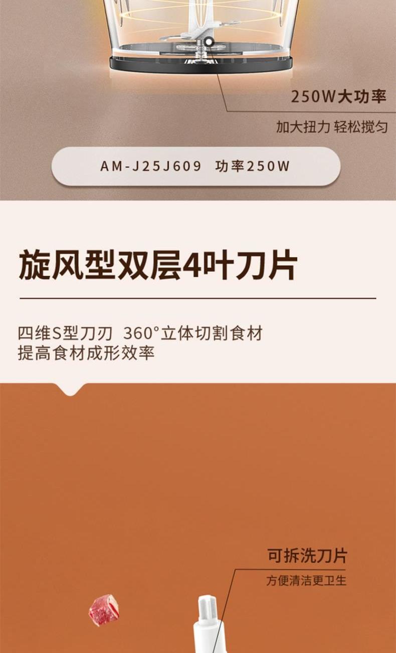 产品型号:AM-J25J609 产品容量:1.8L 杯体:玻璃 搅拌功率:250W 1、两档调速,软硬食材分档切,全家满足 2、约2L大容量,双层四刀,四维立体切割 3、250W大功率,绞打澎湃动力,304不锈钢食品材质 4、安心守护好胃口,易清洗,一冲即净。