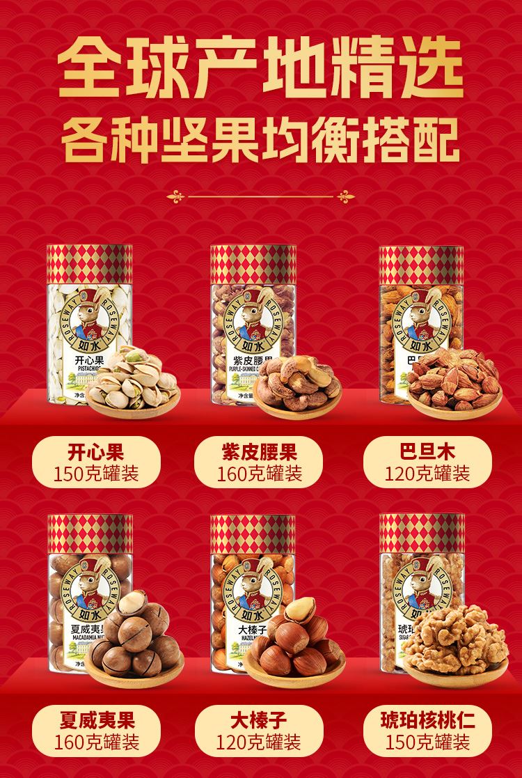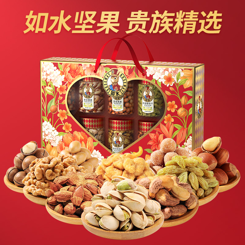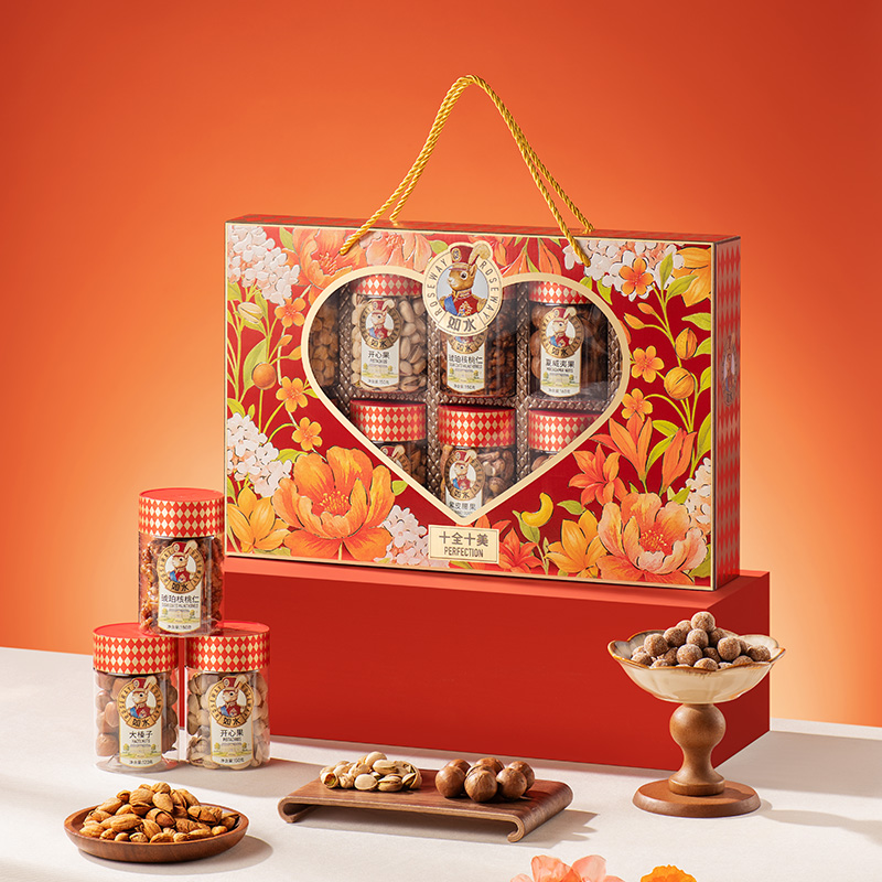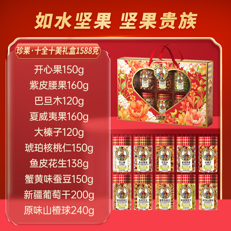 如水珍果·十全十美礼盒 净含量:1588g 如水开心果150g 如水紫皮腰果160g 如水巴旦木120g 如水夏威夷果160g 如水大榛子120g 如水琥珀核桃仁150g 如水鱼皮花生138g 如水蟹黄味蚕豆150g 如水新疆葡萄干200g 如水原味山楂球240g