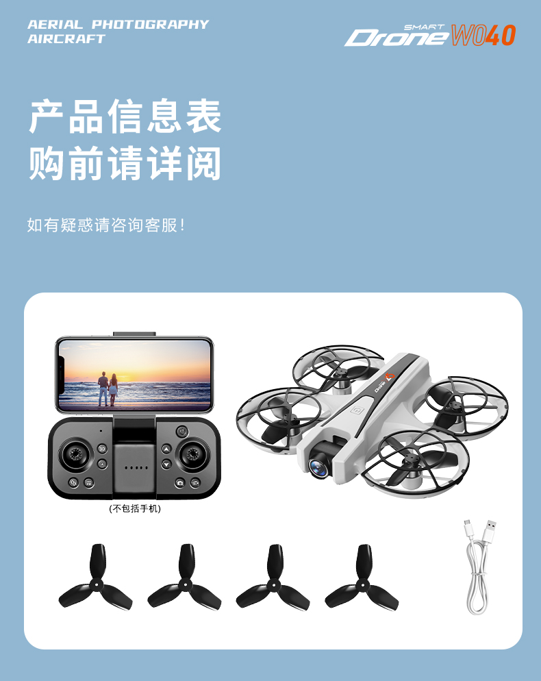 产品清单:无人机+说明书+充电线+遥控器+配件+包装盒+手提袋