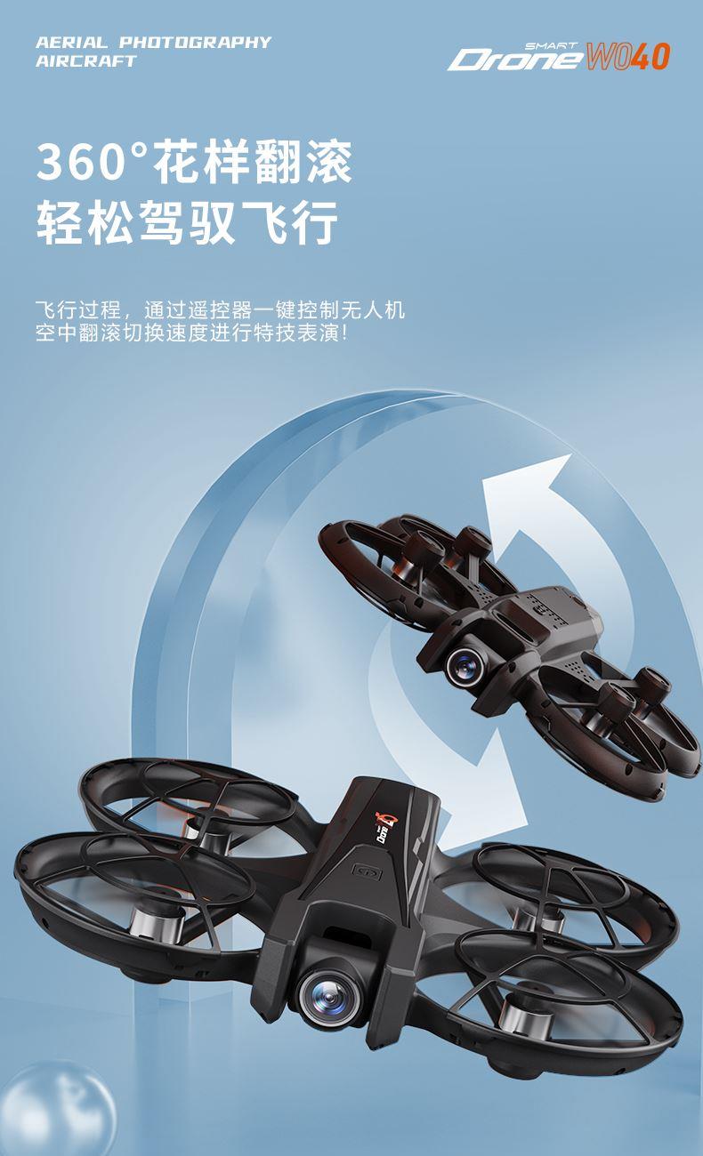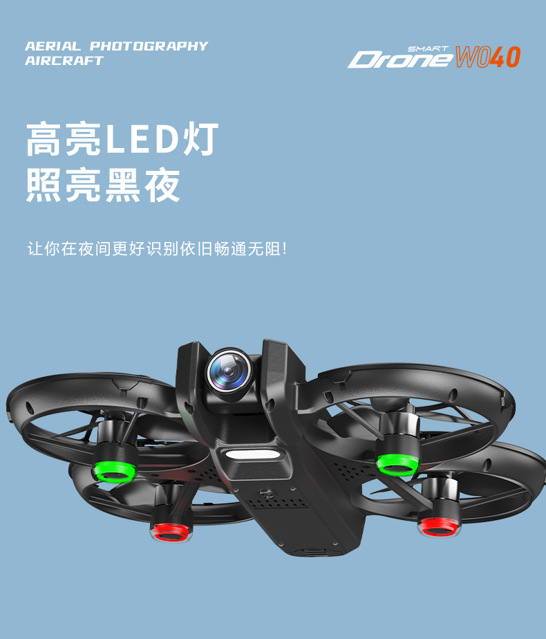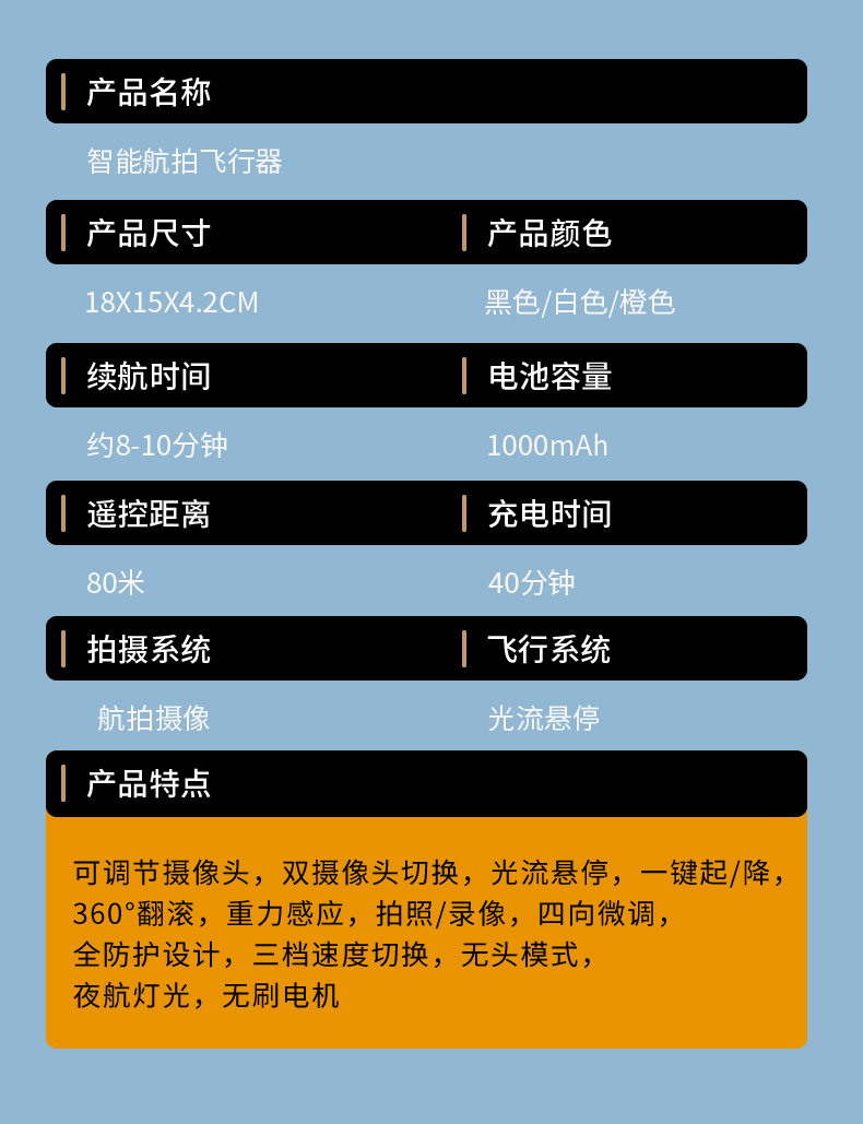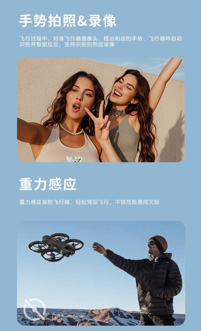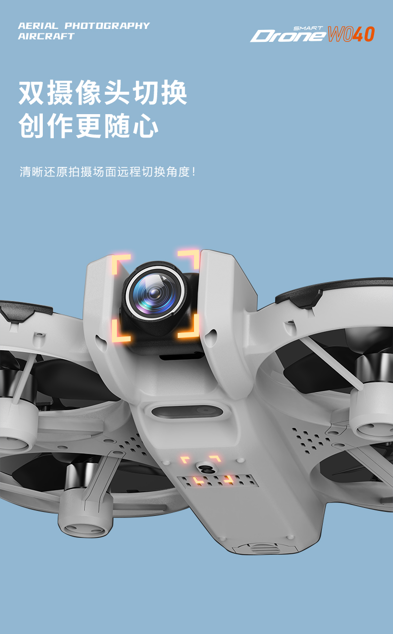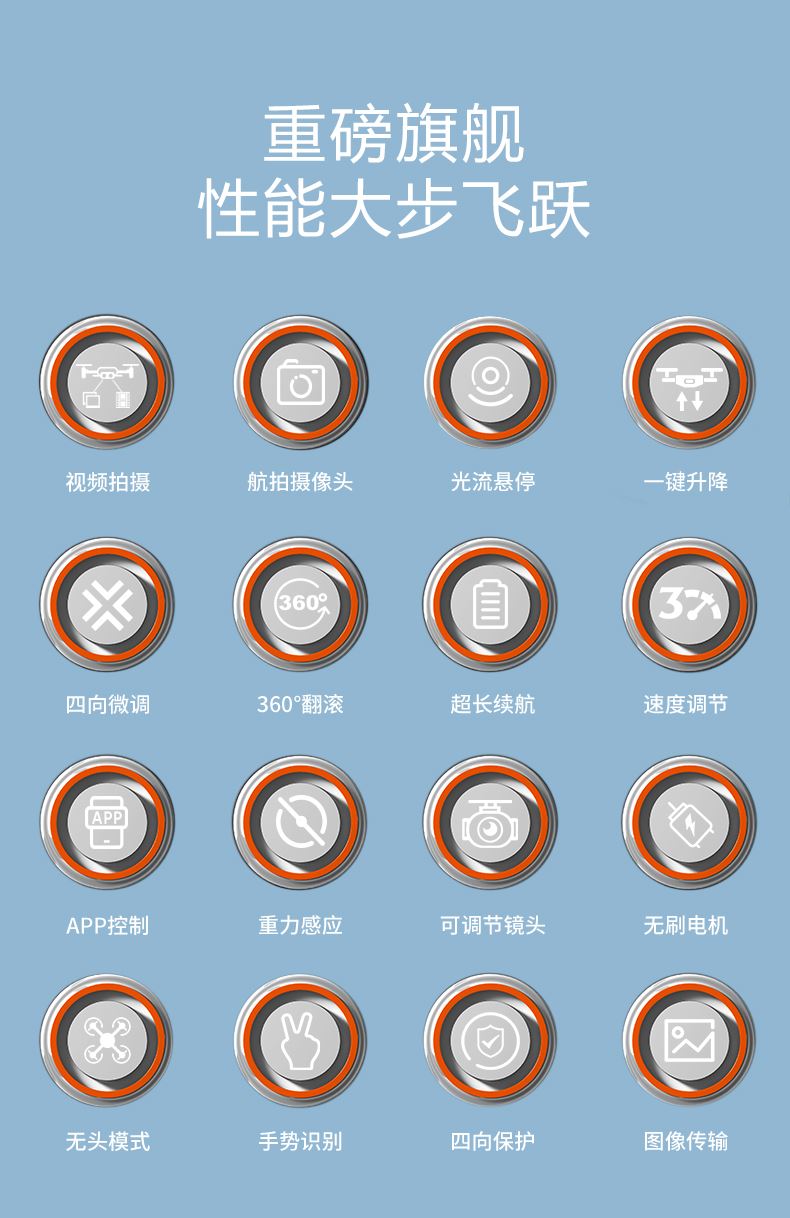 产品功能:可手动调节相机、双摄像头切换、光流悬停、一键起/降、360°翻滚、拍照、录像、四向微调、高亮LED灯、全防护设计、三档速度切换、无头模式