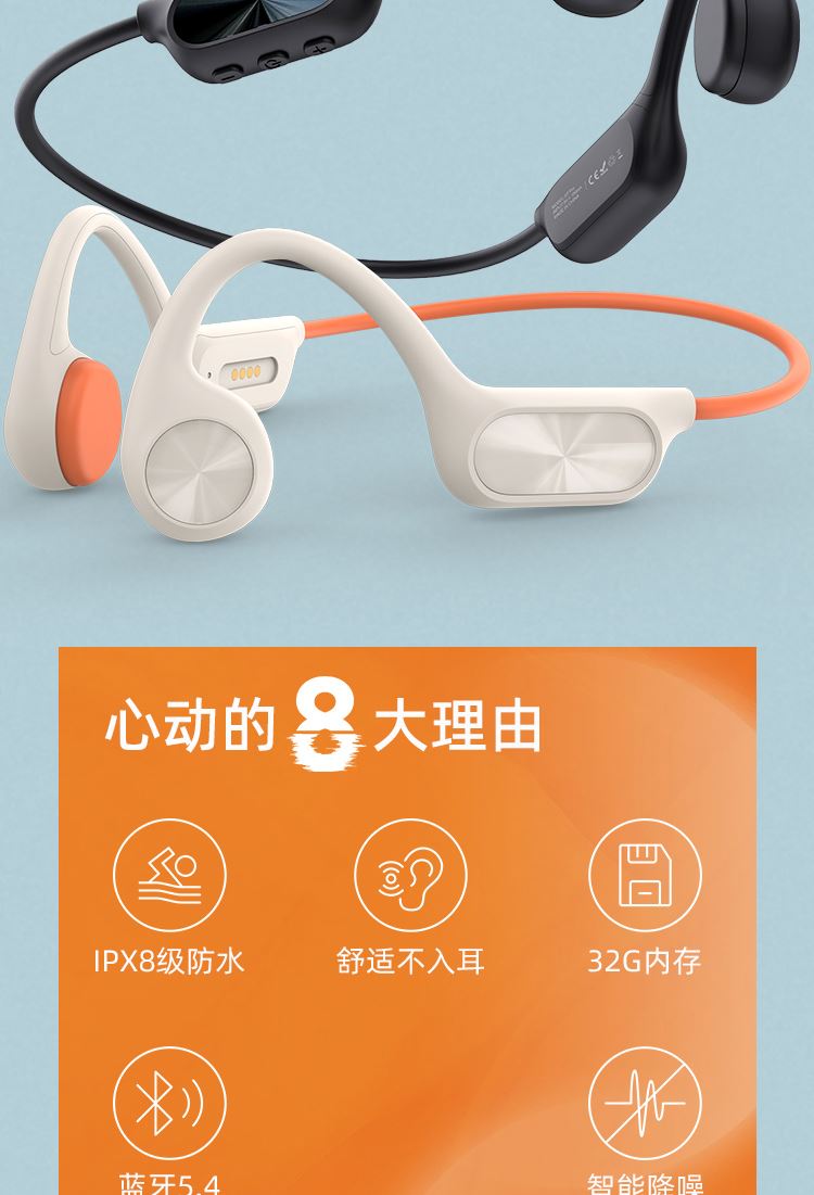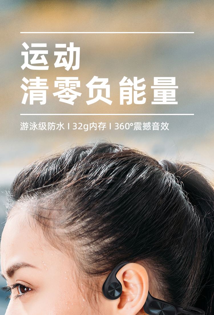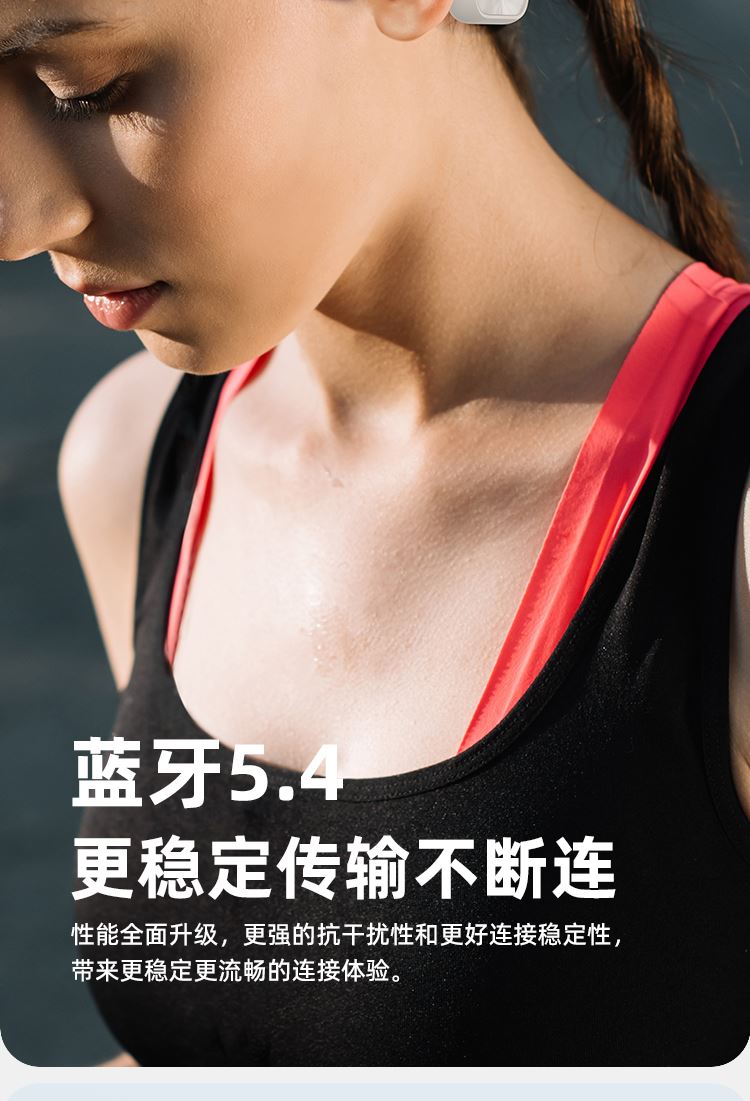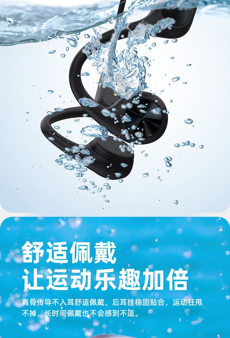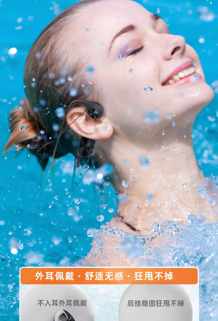 1.IPX8级防水,游泳也有听音乐的耳机,内置32g内存; 2.亚马逊欧洲销量排名第6的耳机,稍逊韶音与安克; 3.不入耳开放聆听.360度立体环绕声效,5.4蓝牙版本; 4.ENC通话降噪,DT4.0定向传音不漏音; 5.360旋转耳挂,使用便捷,不限人群使用,防水防汗,各种场景使用自如; 6.数字显示屏电量一目了然;强劲48续航·乐不停歇。 7.工作状态下待机时间18个小时