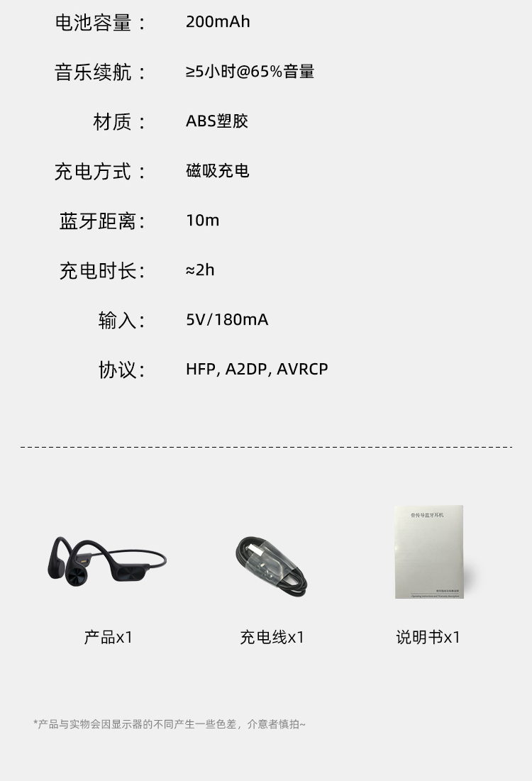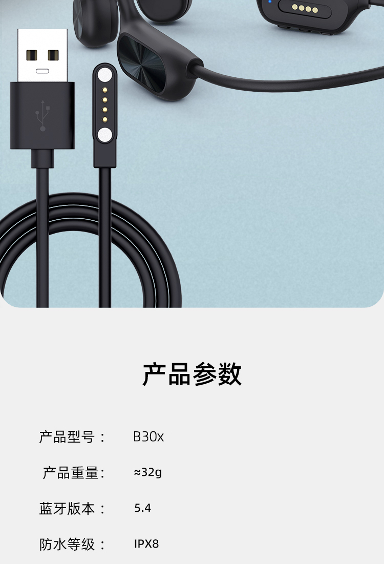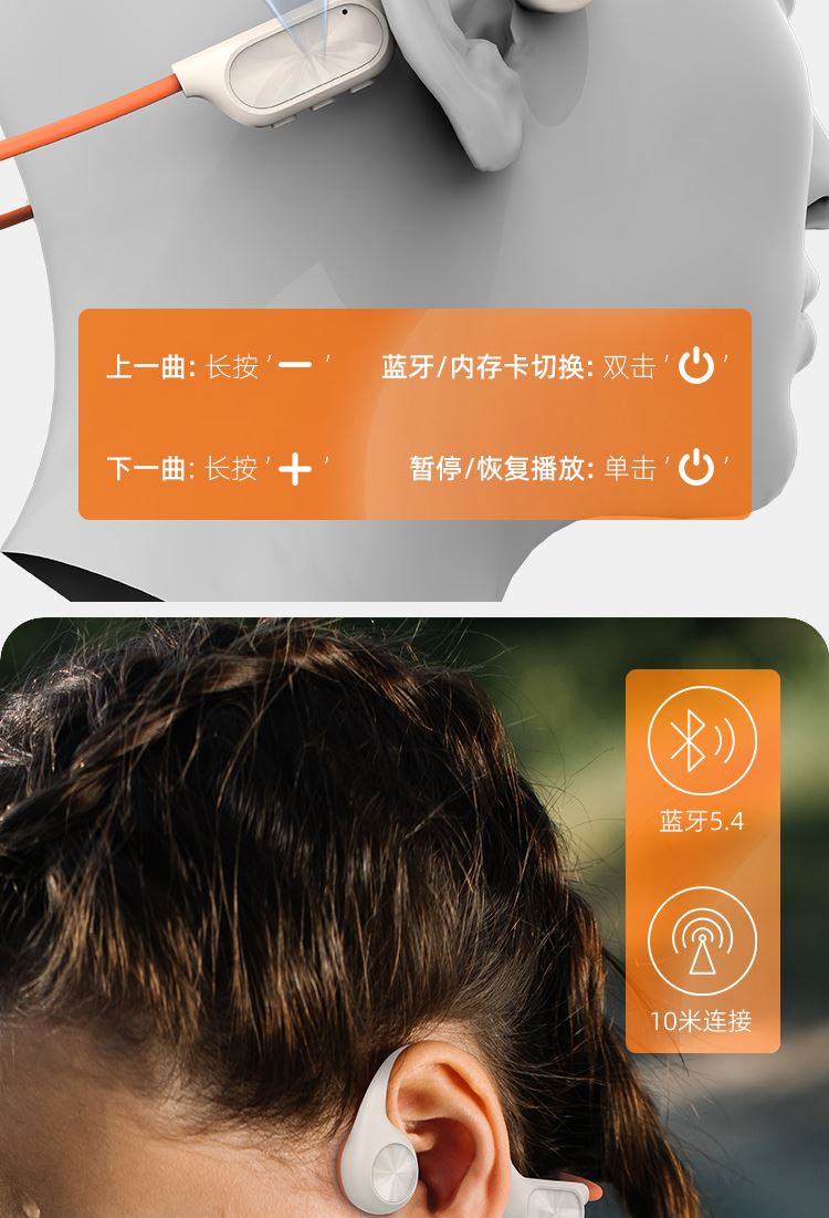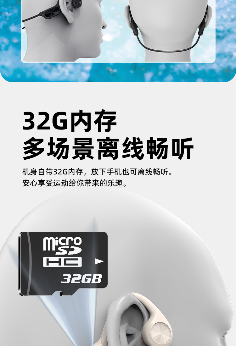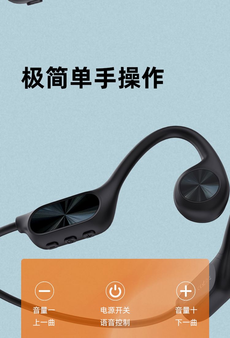 1.IPX8级防水,游泳也有听音乐的耳机,内置32g内存; 2.亚马逊欧洲销量排名第6的耳机,稍逊韶音与安克; 3.不入耳开放聆听.360度立体环绕声效,5.4蓝牙版本; 4.ENC通话降噪,DT4.0定向传音不漏音; 5.360旋转耳挂,使用便捷,不限人群使用,防水防汗,各种场景使用自如; 6.数字显示屏电量一目了然;强劲48续航·乐不停歇。 7.工作状态下待机时间18个小时