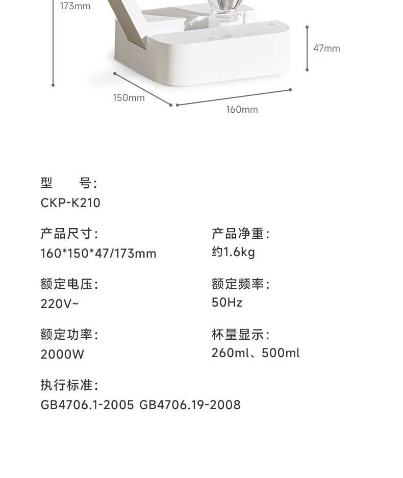 型号:CKP-K210 产品净重:约1.6kg 额定电压:220V~ 额定功率:2000W 杯量显示:260ml、500ml 急速加热,3秒即出热水 陶瓷发热管,无需预热 便携设计,轻量化机身(场景:出差、办公、户外。母婴出行) 温度控制,多档调温 安全防护保护:防干烧保护,童锁设计,水电分离结构