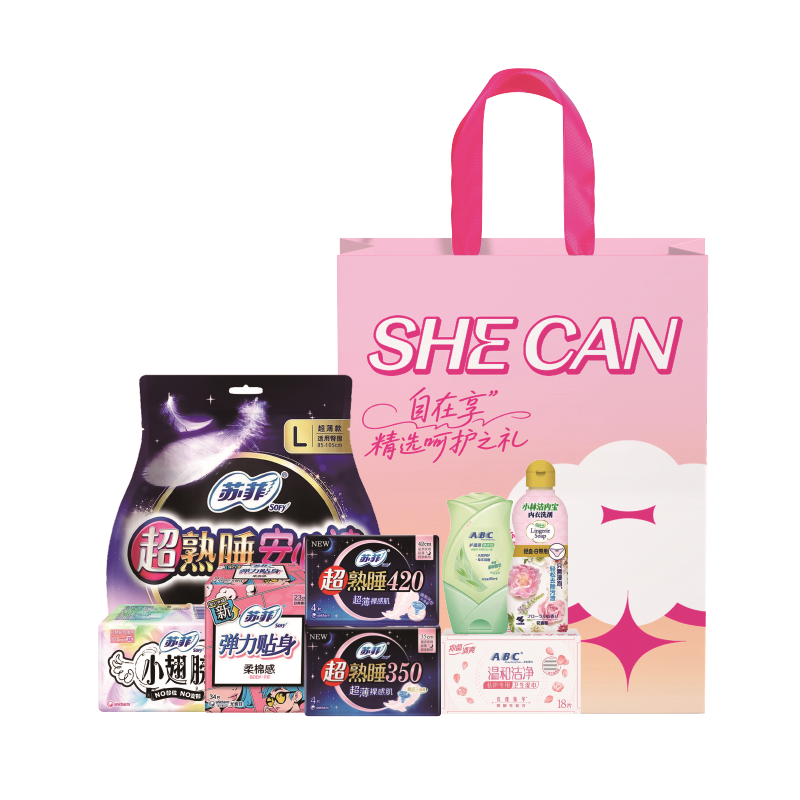 苏菲小翅膀175无香型护垫9片*4 苏菲弹力贴身23cm纤巧日用(新)5片*6 苏菲超熟睡350超薄随心翻超薄夜用 4片*3 苏菲超熟睡420超薄随心翻超薄夜用 4片*3 苏菲超熟睡安心裤 超薄 L 2P*3 ABC护理液(草本护理配方)80ml*1 ABC私户专用温和洁净独立湿巾18片*2 小林洁内宝内衣洗剂 花香型120mL*1