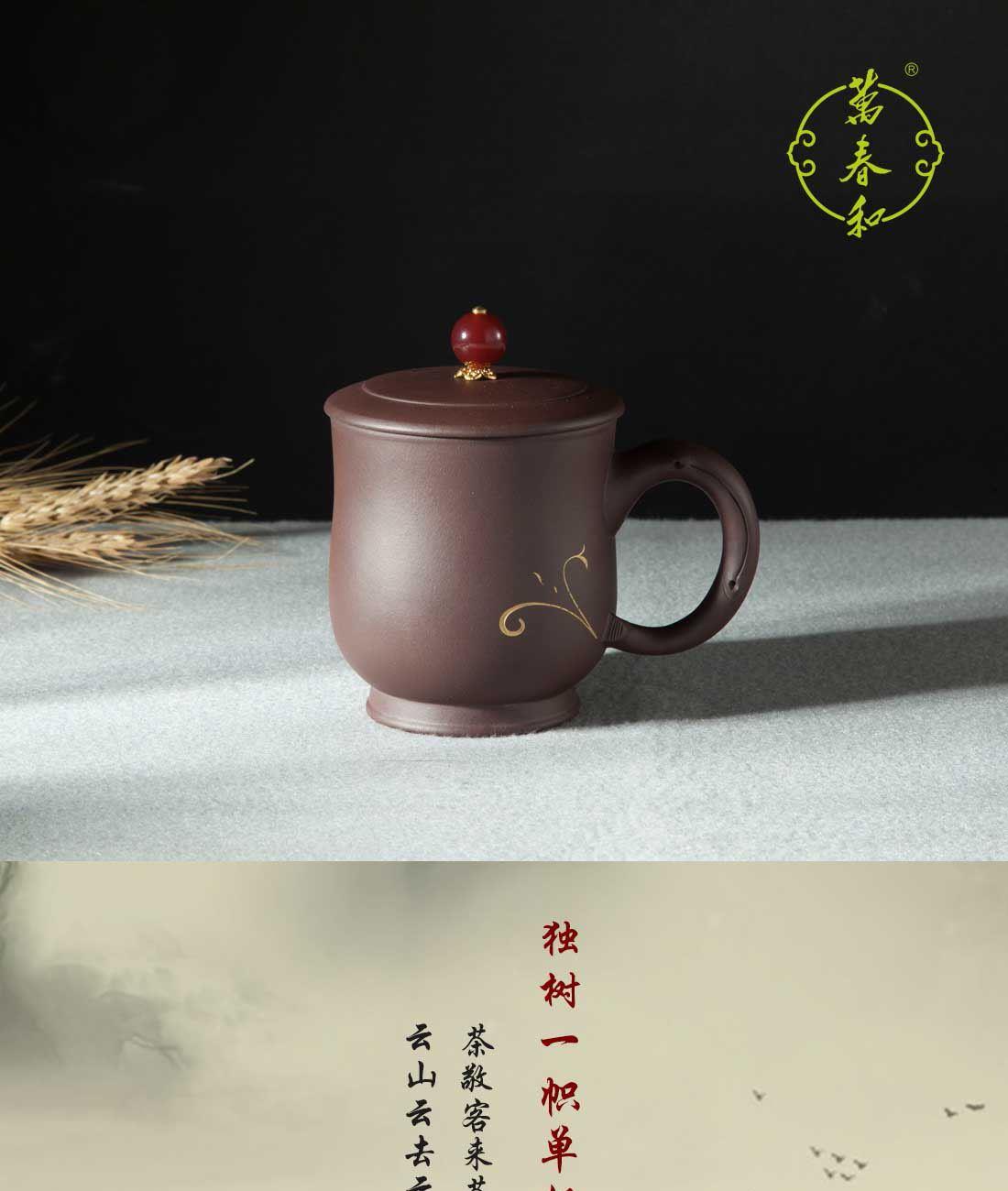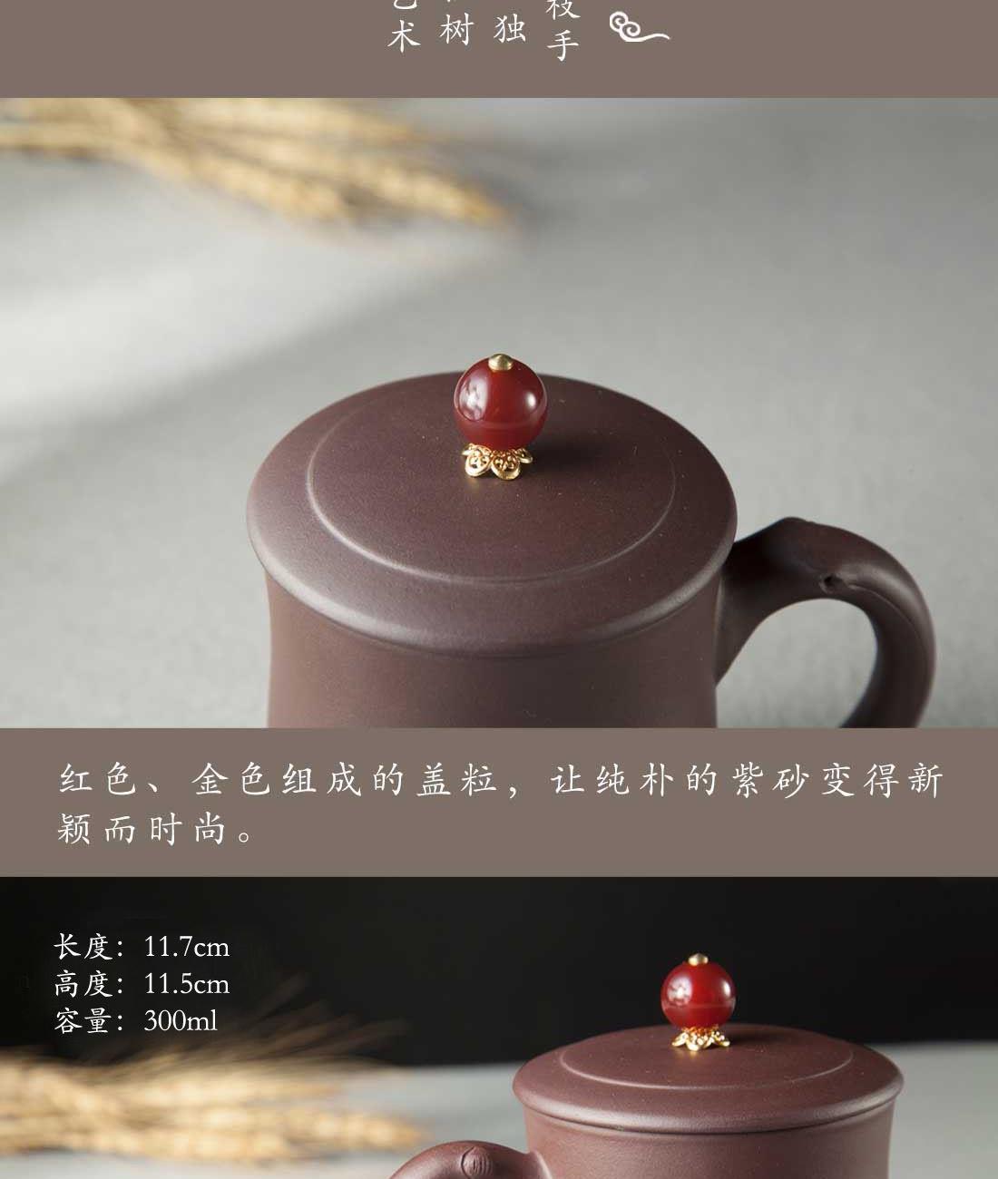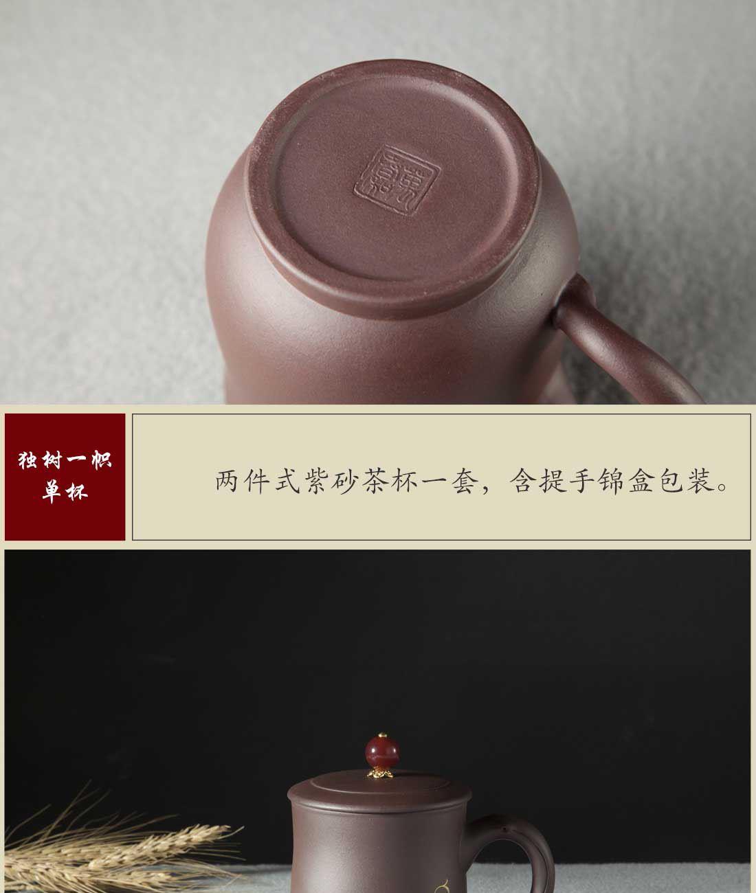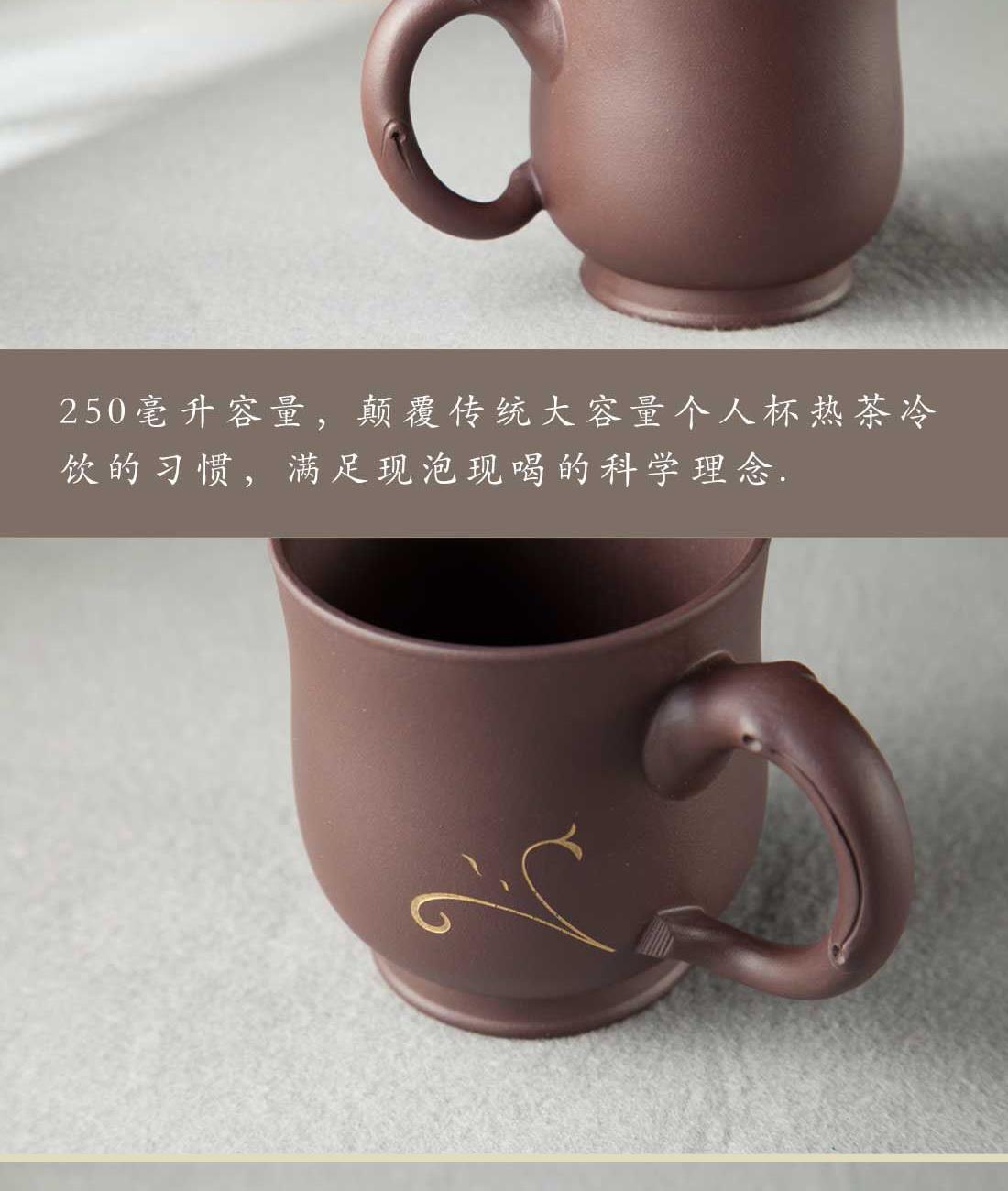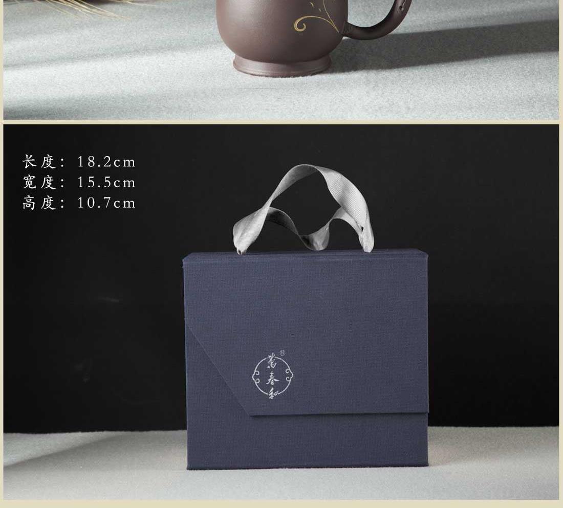 材 质:紫泥 容 量:紫砂杯270ml 包装尺寸:L18.5 W15.5 H11cm 配 置:两件式紫砂茶杯一套,含提手锦盒包装。 1.手把造型灵感源自树枝,独特而自然,仿佛能触摸到山林间的质朴与灵动,为您的品茶时光增添一抹独树一帜的大自然艺术气息。 2.盖粒采用经典的红金配色,热烈的红与奢华的金相互碰撞,打破紫砂一贯的质朴印象,尽显格调。 3.270毫升容量颠覆传统个人杯,满足现泡现喝的科学理念,无论是忙碌的工作间隙,还是惬意的休闲时光,都能尽情享受一杯好茶带来的愉悦。