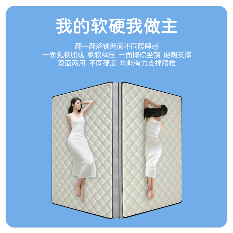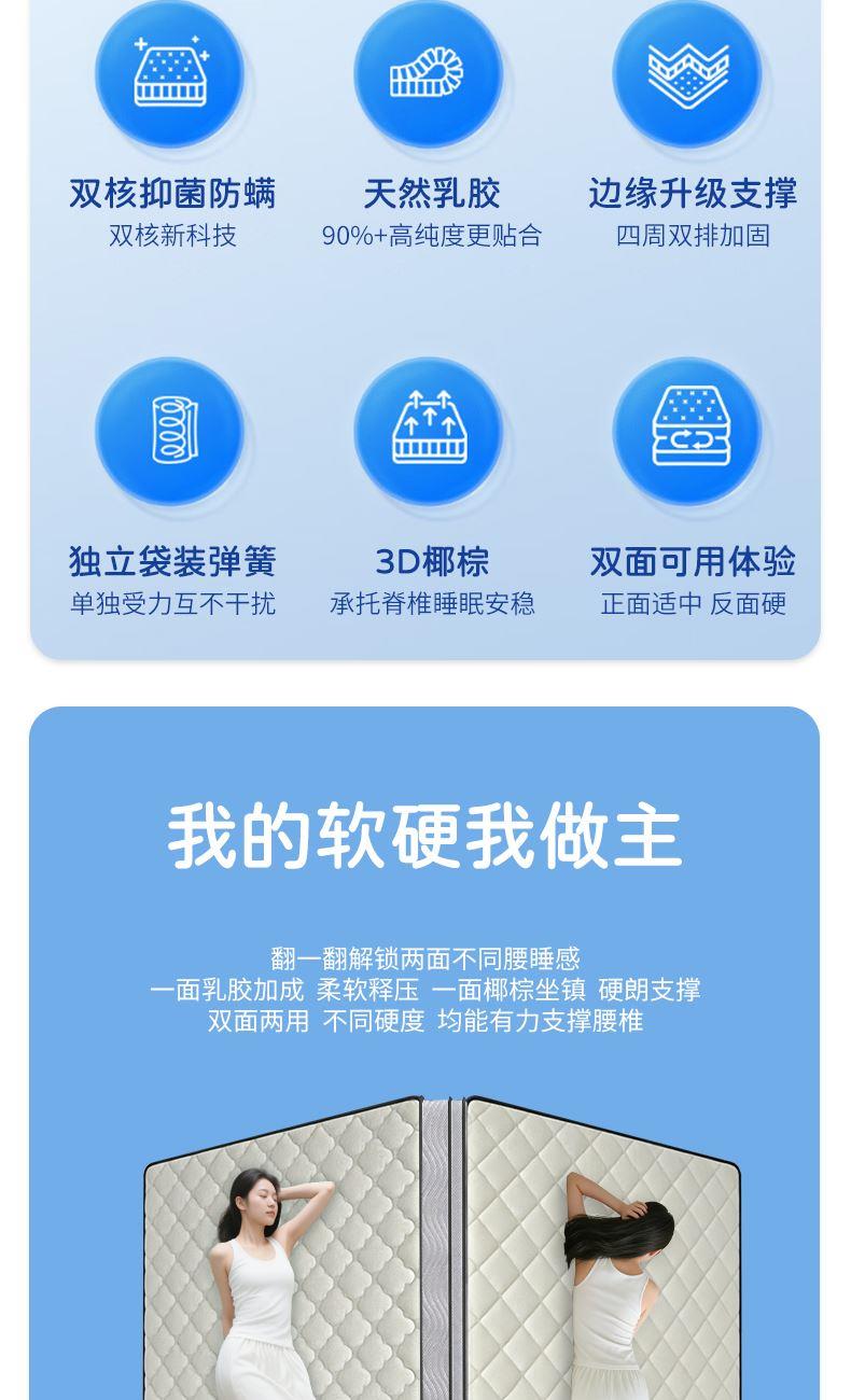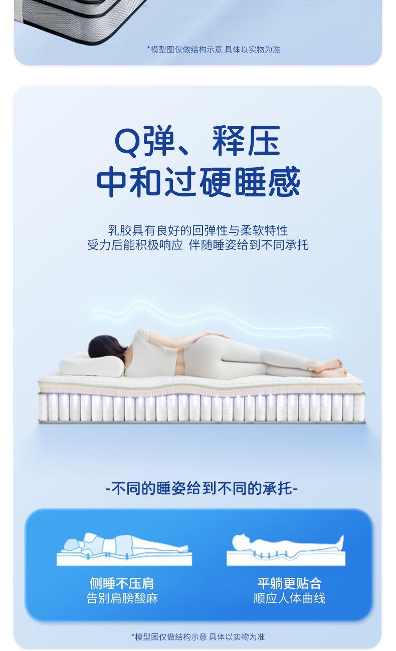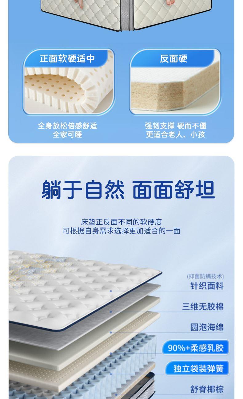 1.消菌净味,守护健康:采用双核消菌驱螨科技,细菌抑制率≥99%,螨虫趋避率≥95%,保护敏感肌肤;加入植物类除臭剂,强力分解异味分子,畅享360°自由呼吸 2.柔韧高弹,透气散热:主材采用进口天然乳胶和纳米竹炭海绵,饱满厚实、弹性优异,自动贴合不同睡姿,并且柔软透气,能及时散发人体热量 3.科学承托,分散压力:独立袋装高精碳素钢弹簧,自动贴合人体曲线,释放全身压力,增加深睡时间。 4.双面可睡,睡感随心:A面柔软贴合,B面护脊承托,无论是贴合感还是支撑感,都是可以满足。 面料:特级针织面料 核心材质:进口天然乳胶、3D椰棕 弹簧:独立袋装弹簧 包装方式:双倍加厚牛皮纸盒 规格尺寸:180*200*25cm