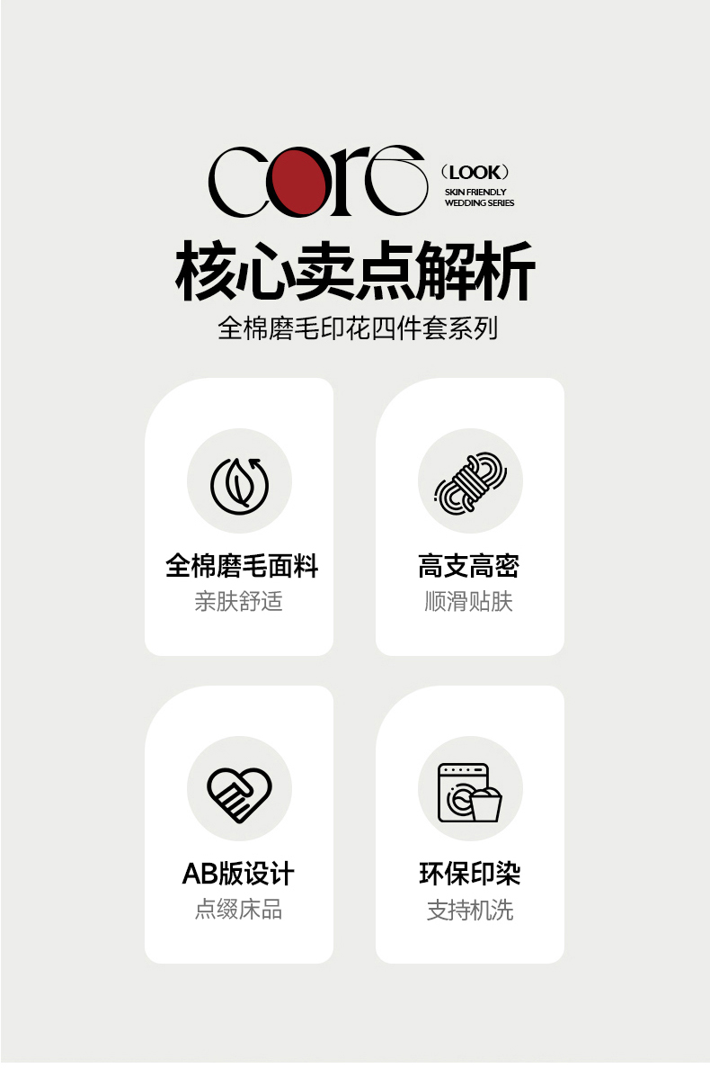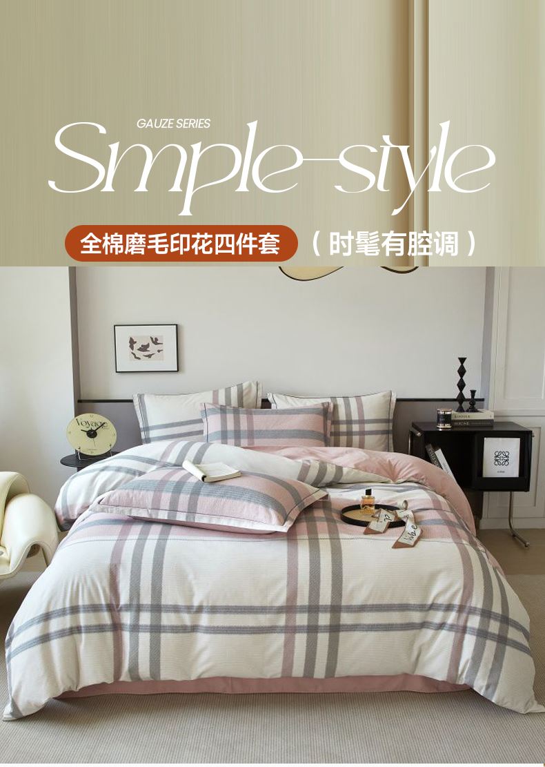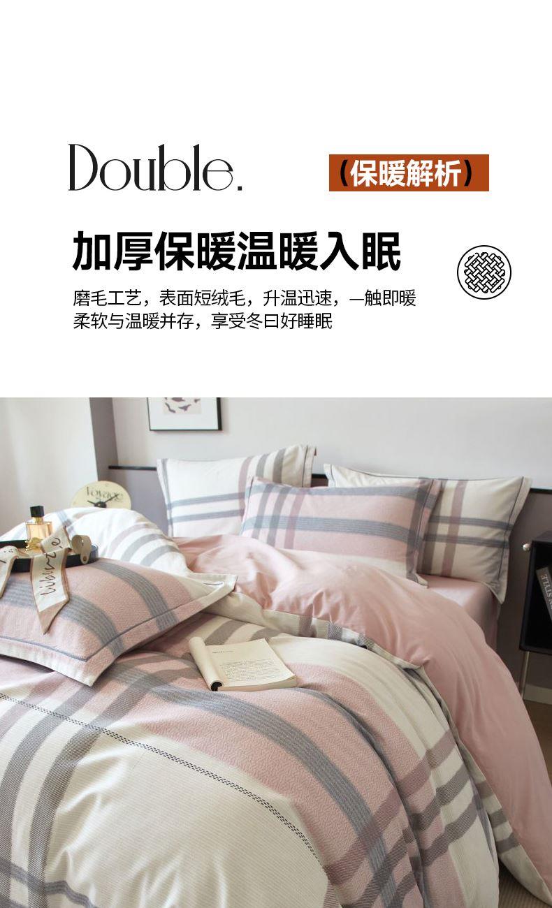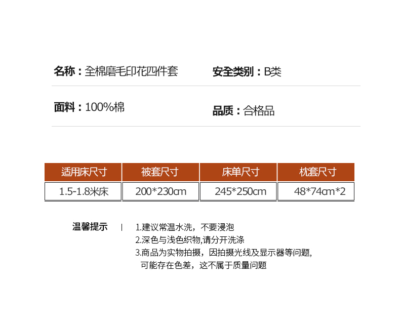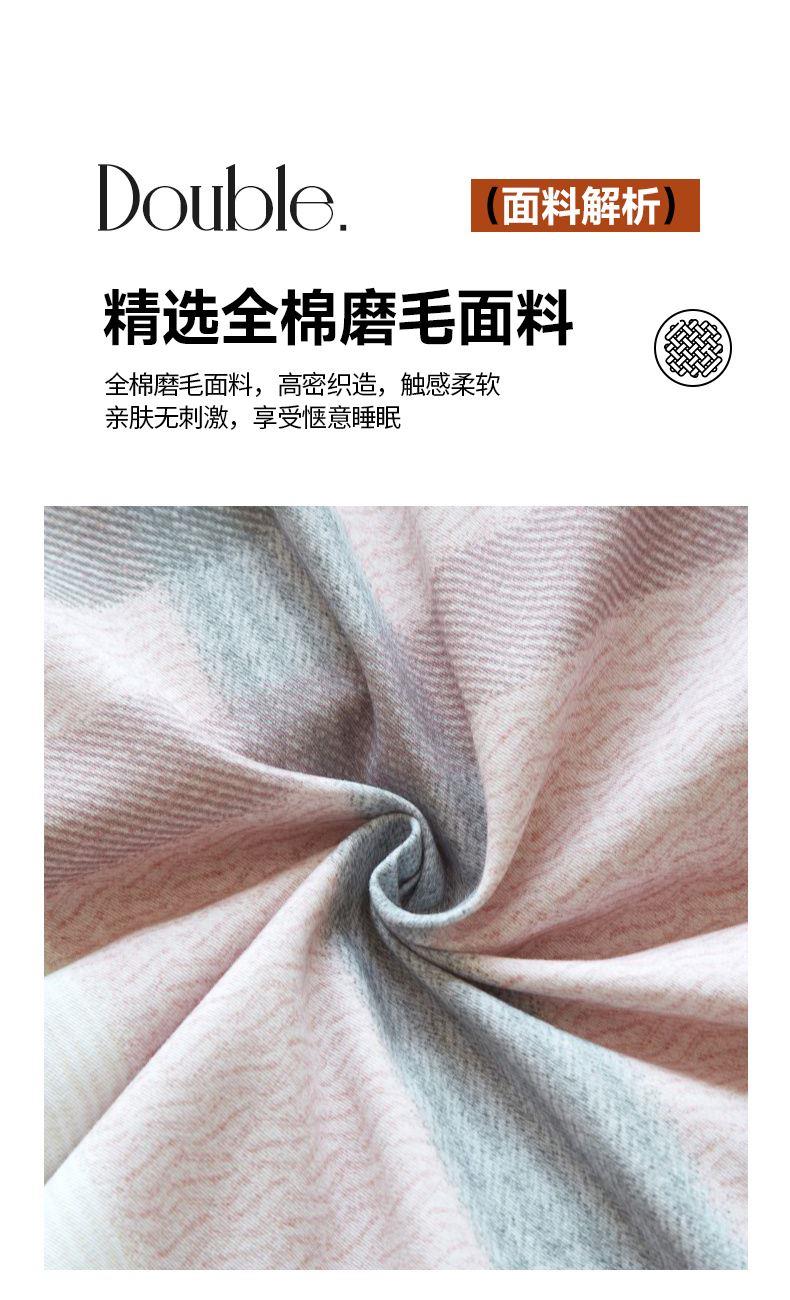 被套:200×230cm 床单:245×250cm 枕套:48×74cm 适用:1.5M-1.8M床 面料:全棉磨毛(棉) 印染工艺:活性印花 柔软纯棉与温暖磨毛工艺,保温聚温效果,碰撞出冬日的暖意,带来舒适的深度好眠,触感柔软,厚实保暖。