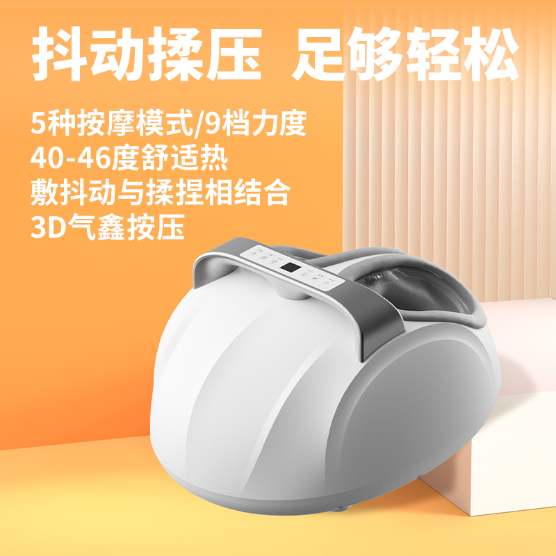 供电方式:220V 额定电压:220V 交流电额定功率:50W 额定频率:50Hz 净 重:4.1KG 毛 重:5.4KG 产品尺寸:420*230*350MM 彩盒尺寸:440*255*390 MM 执行标准:GB 4706.1-2005GB4706.10-2008 1、智能控制调节:九种按摩力度,可根据自身要求调节; 2、恒温热敷:40-46度舒适热敷,舒缓足部紧张,缓解疲劳 ; 3、高频重动:三种震动频率,高频抖动带动腿部运动,更深层次的放松脚底肌肉; 4、多模式可选:五种按摩模式可选,可体验不同按摩手法; 5、可拆洗清洁:可拆洗布套:保持机器内部干净,按摩更卫生舒适; 6、3D气囊按压:3D气囊按压,能体验到的真人按摩的手法; 7、一键启动:高清数码智能大控屏,配备避控弱,一健启动,老人也可轻松上手。
