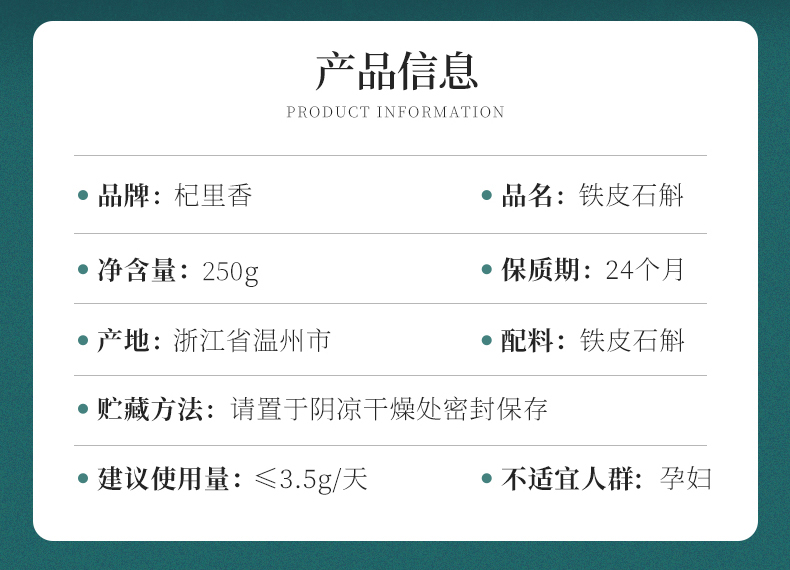 品 名:铁皮石斛 净含量:250g 保质期:24个月 产地:浙江省温州市 配料:铁皮石斛 贮藏方法:请置于阴凉干燥处密封保存 建议使用量:≤3.5g/天 不适宜人群:孕妇