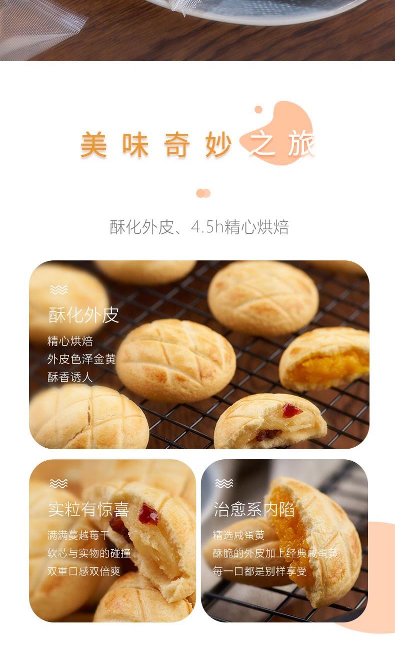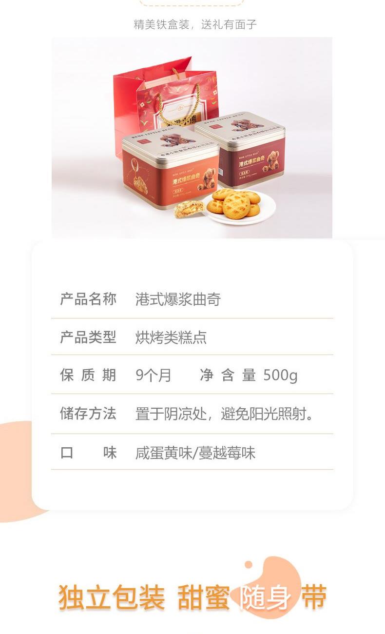 产品净含量:500g 产品保质期:9个月 产品包装:精致铁罐配精美礼品袋 产品卖点:蔓越莓,咸蛋黄双重口味任选,爆浆口感回味无穷,铁罐+独立内托小包装+礼袋,送礼更贴心。香港小熊在全国专柜和专卖店有500多家,品质保证,售后安心,有保障。