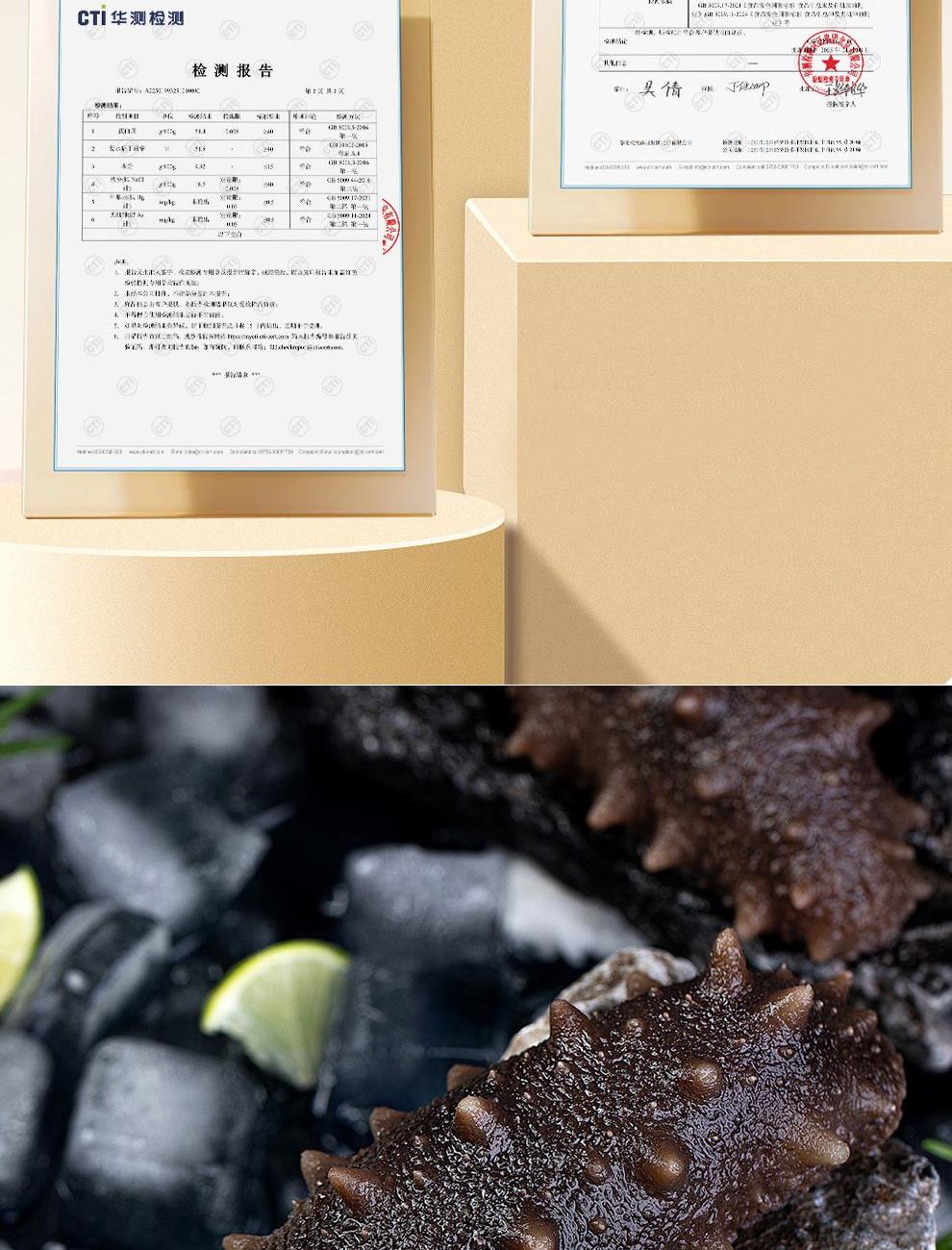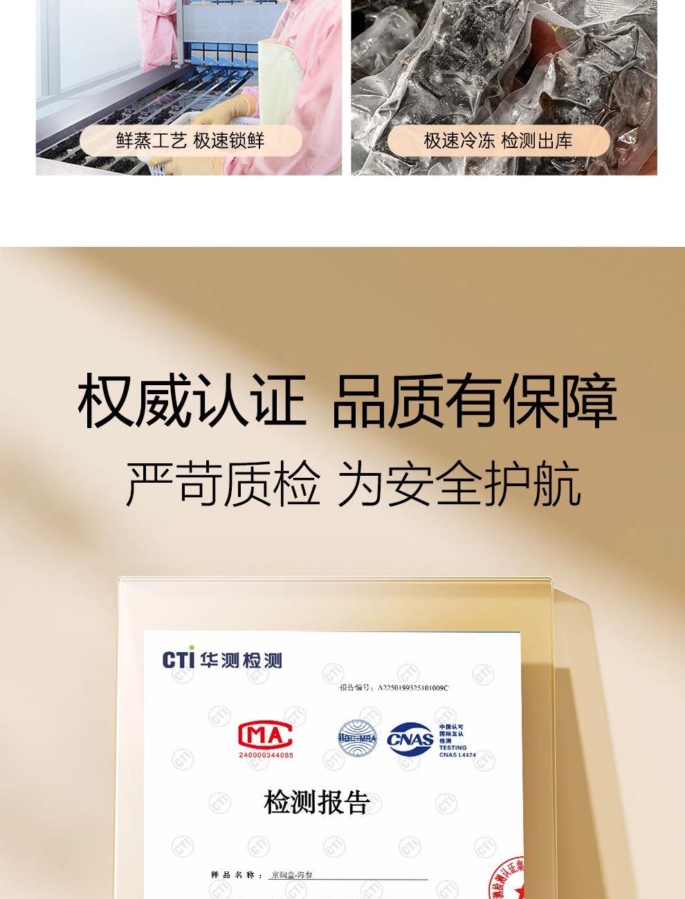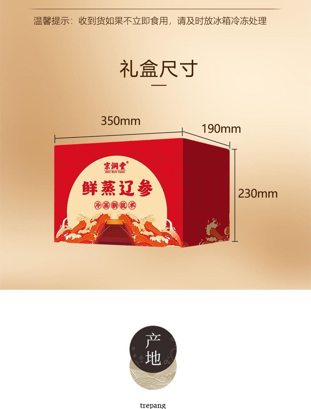 规格:1500克/(24-36头) 卖点: 京润堂大连即食海参选自黄金海域北纬39°的辽参,海域环境好,水质清洁、温度适宜,海参品质高。选取参龄5年以上的辽参,富含多种营养成分,如高蛋白含量,海参粘多糖, 维生素和多种微量元素,具有调节体质、抗疲劳、抗肿瘤等潜在功效。