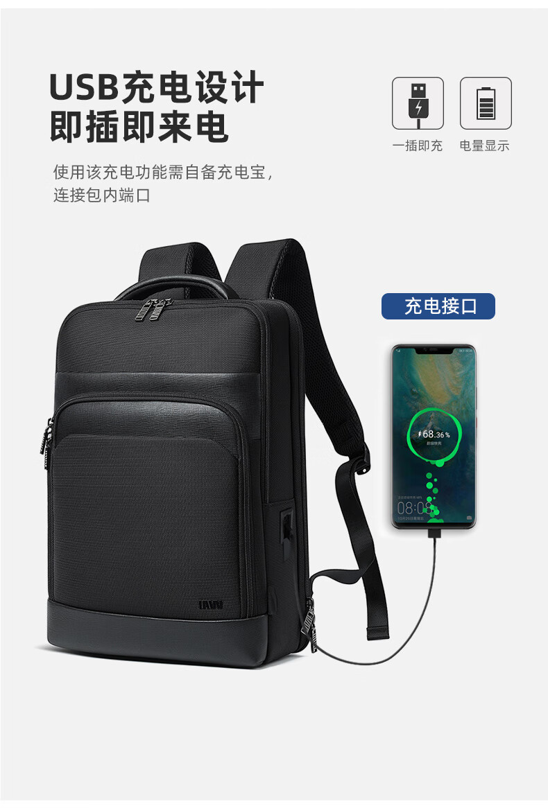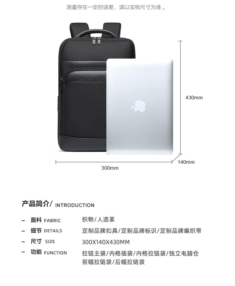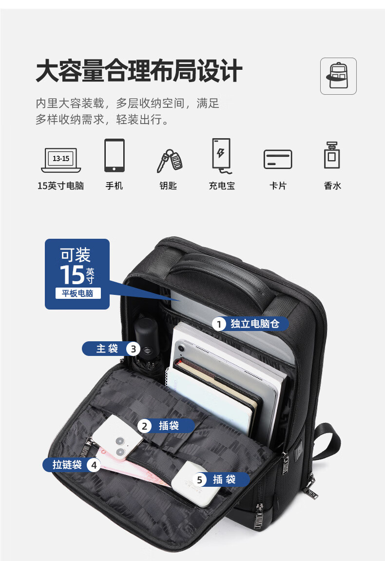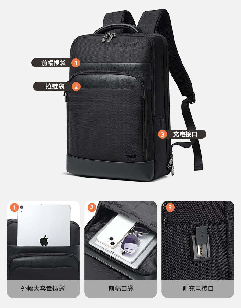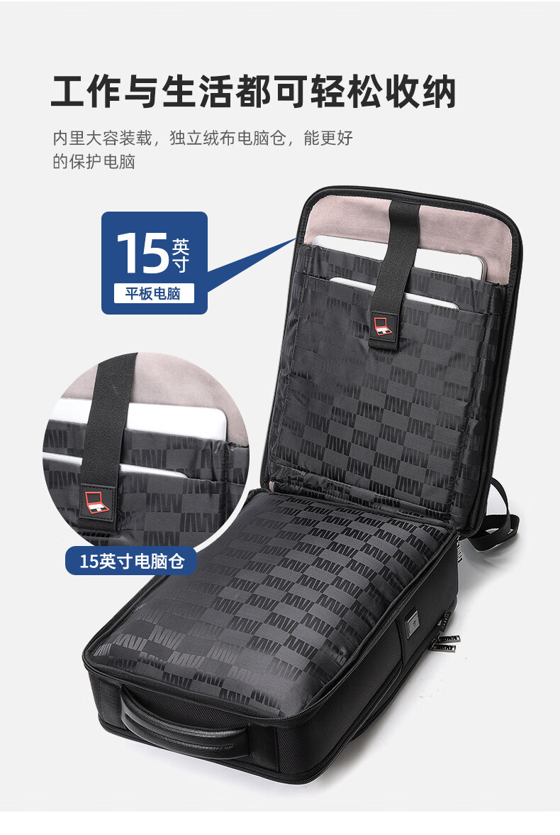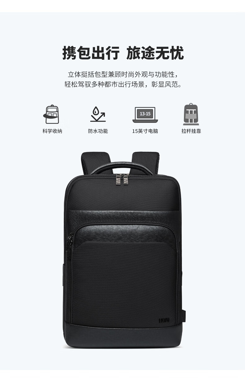 类别:背包 外部材质:织物 闭合方式:翻盖式 规格:300x140x430mm 容纳电脑尺寸:15英寸 风格:通勤风 商务风 携包出行,旅途无忧,立体挺括包型兼顾时尚外观与功能性,轻松驾驭多种都市出行场景 内里大容装载,多层收纳空间,满足多样收纳需求,轻装出行,采用高密度织物面料,防刮耐用,防泼贱,轻松应对泼水