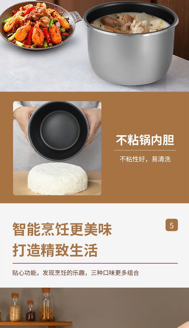 产品参数 额定功率:900W 额定容量:5L 产品净重:4.2kg 产品毛重:4.8kg 包装尺寸:308x308x350mm 外箱尺寸:635X320X370mm 材质:铝合金+PP 产品特点 1、款式新颖,时尚设计; 2、根据食物、个人口味及烹饪经验,自行选择保压时间,保压结束后自动进入保温状态; 3、具有24小时预约功能,设定预约时间,自动启动加热开始工作; 4、大屏幕数码显示,多功能,易操作; 5、多种功能一键选择操作,煮饭键一键快捷,简单又方便。