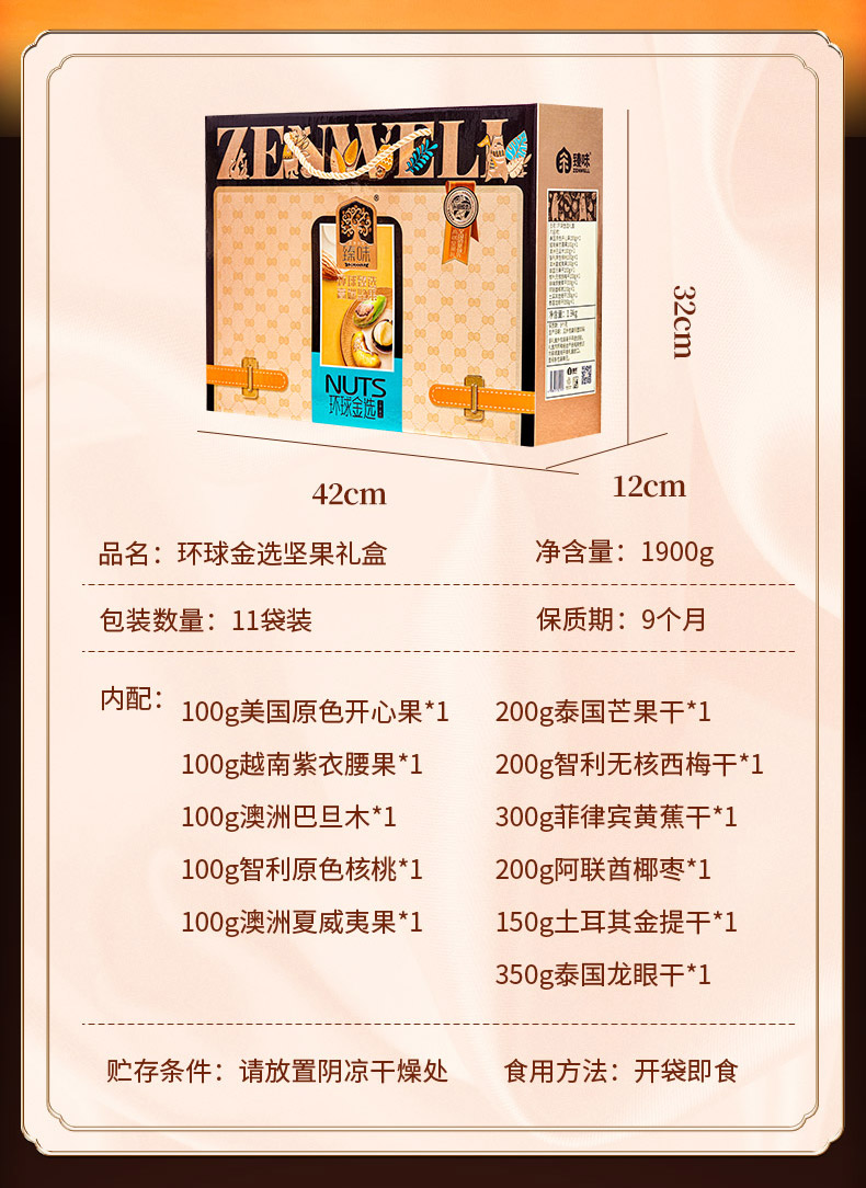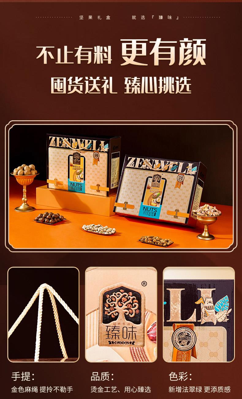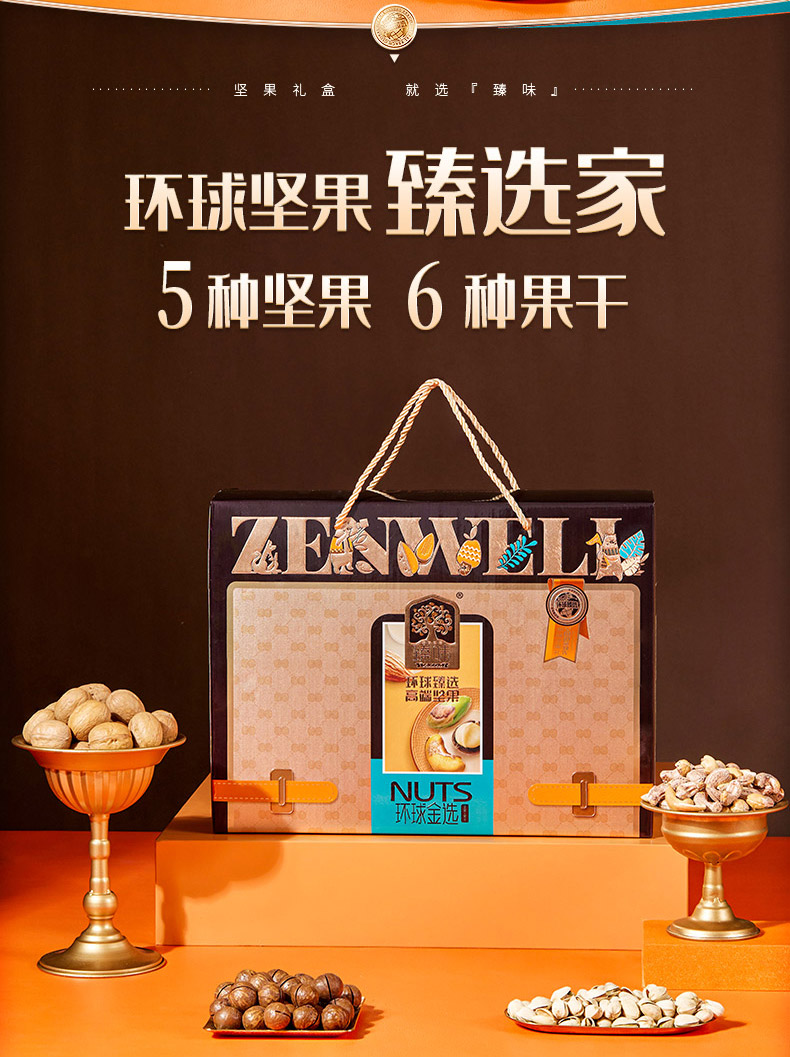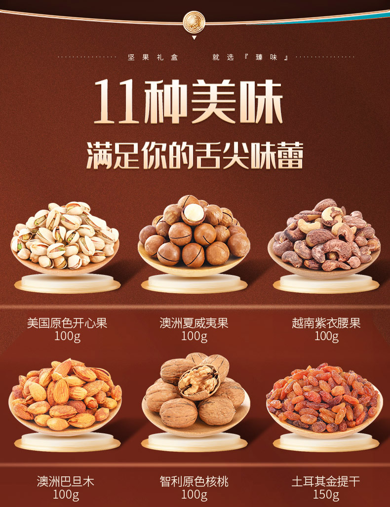 臻味100g美国原色开心果*1 臻味100g越南紫衣腰果*1 臻味100g澳洲巴旦木*1 臻味100g智利原色核桃*1 臻味100g澳洲夏威夷果*1 臻味200g泰国芒果干*1 臻味200g智利无核西梅干*1 臻味300g菲律宾黄蕉干*1 臻味200g阿联酋椰枣*1 臻味150g土耳其金提干*1 臻味350g泰国龙眼干*1 环球金选,采用烫金工艺材质,整体气质时尚沉稳;内配5种坚果,6种果干
