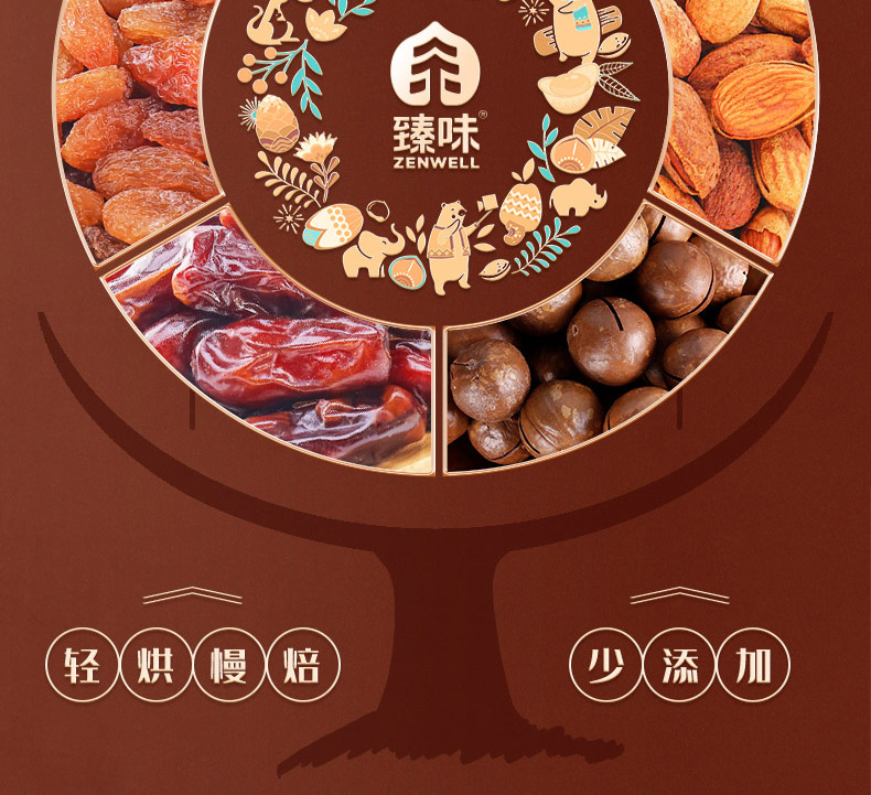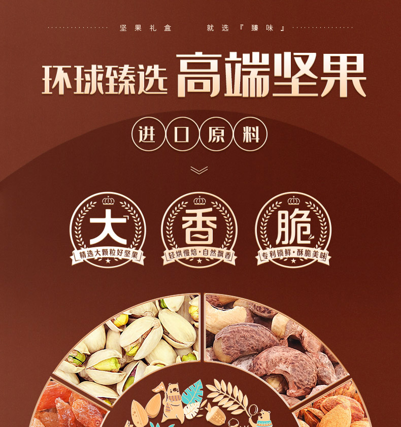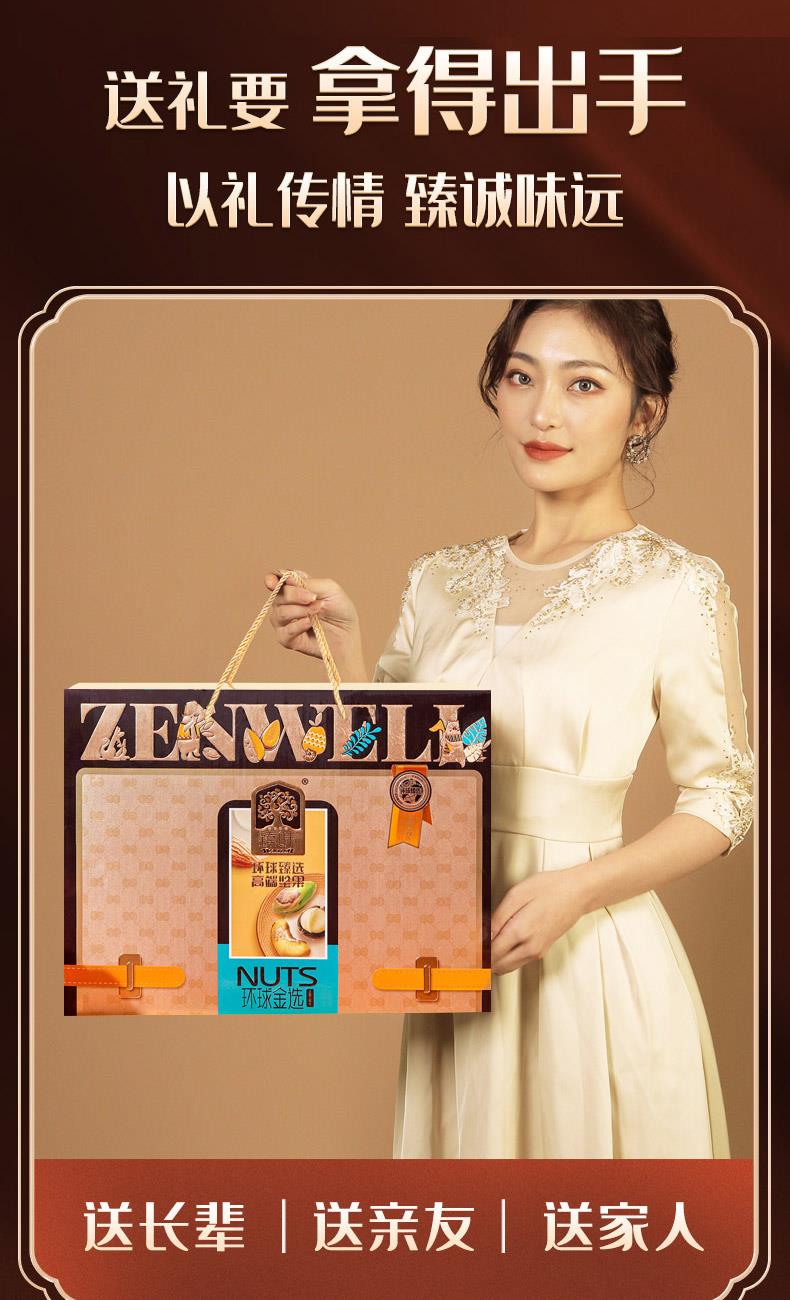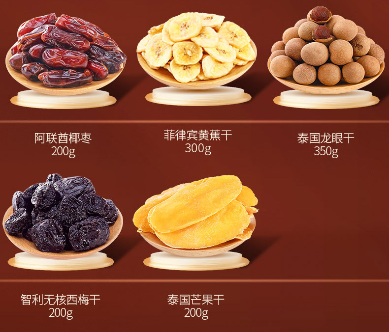 臻味100g美国原色开心果*1 臻味100g越南紫衣腰果*1 臻味100g澳洲巴旦木*1 臻味100g智利原色核桃*1 臻味100g澳洲夏威夷果*1 臻味200g泰国芒果干*1 臻味200g智利无核西梅干*1 臻味300g菲律宾黄蕉干*1 臻味200g阿联酋椰枣*1 臻味150g土耳其金提干*1 臻味350g泰国龙眼干*1 环球金选,采用烫金工艺材质,整体气质时尚沉稳;内配5种坚果,6种果干
