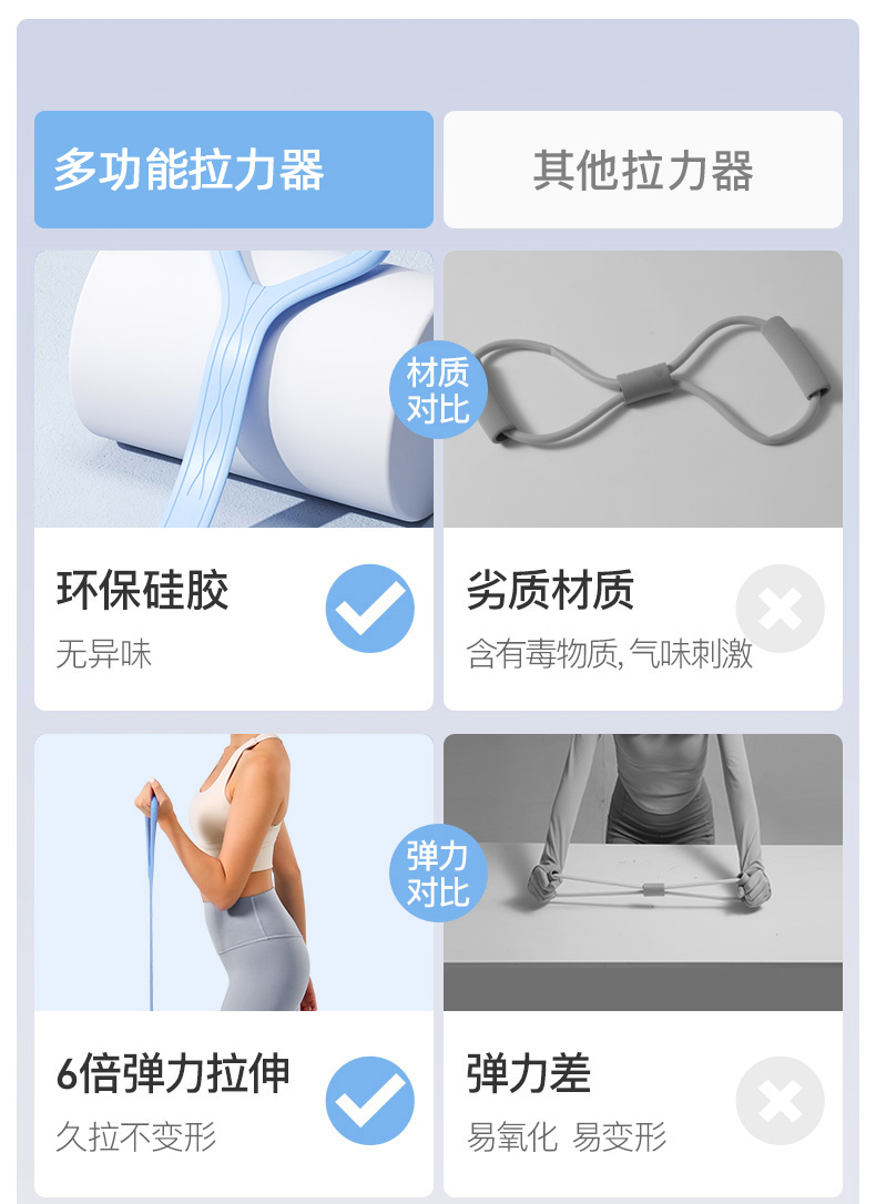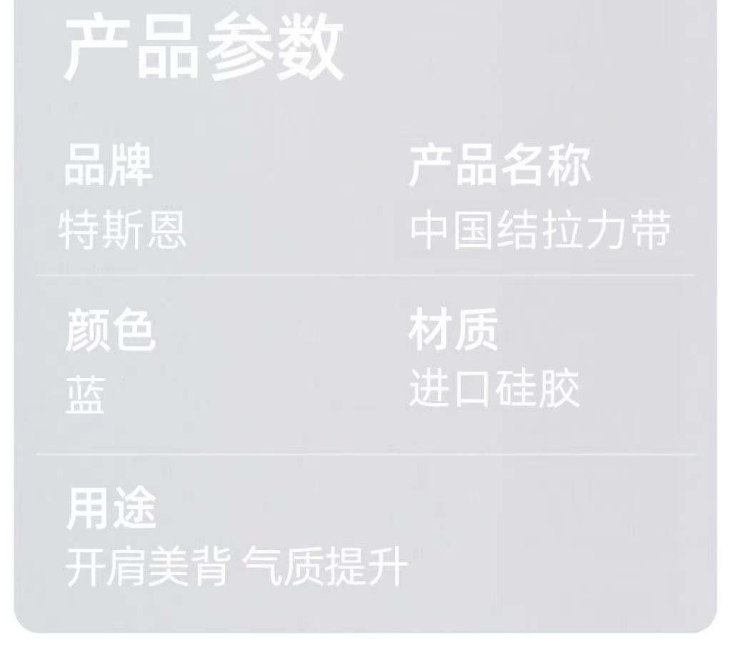 型号 TSN-7105 材质 硅胶 颜色 :蓝色 彩盒尺寸 13.5*5*13cm 单个重量 167g毛重:202g 包装方式 OPP袋+彩盒 优质材料天然橡胶 耐用抗撕裂 泛应用于力量训练、康复锻炼、全身肌肉塑形等多个领域