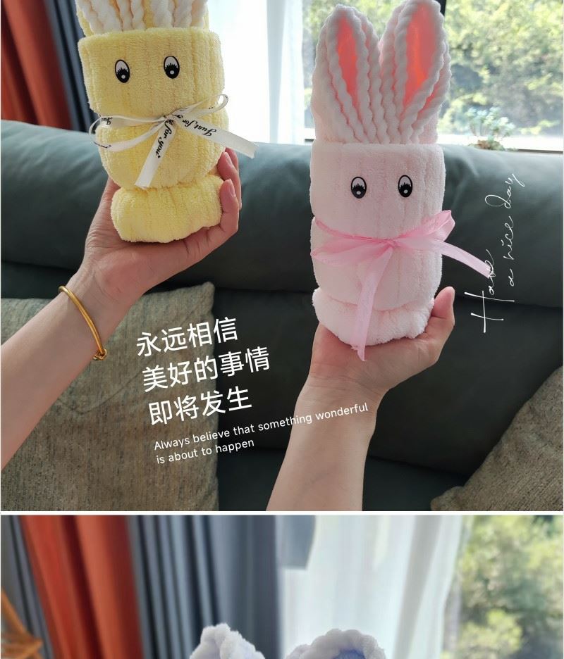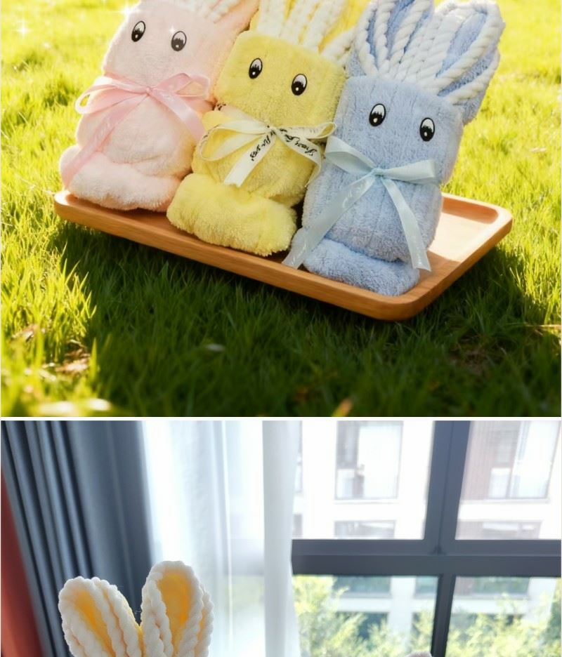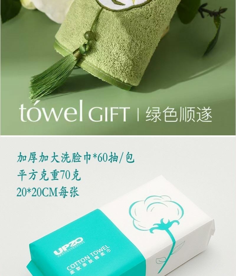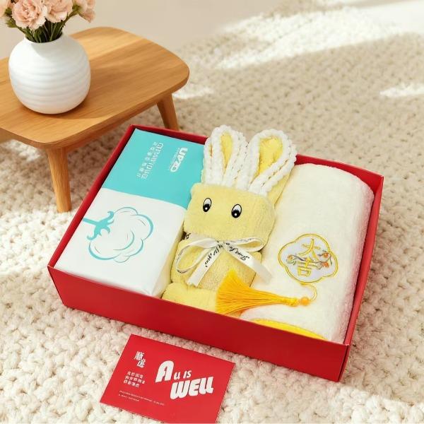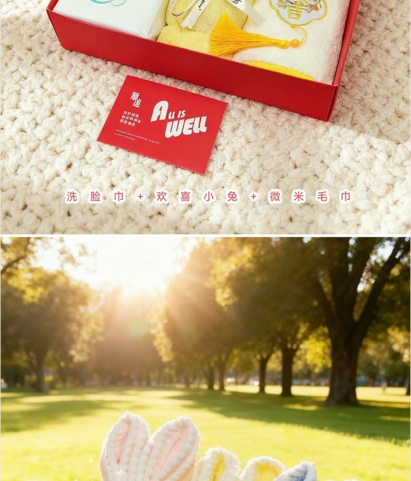 型号: A22A17A13 产品内容: 1、欢喜小兔毛巾×1 35*75CM 80克 2、微米国风大毛巾×1 34*74CM 100克 3、洗脸巾×1包 60抽 加厚加大 单张尺寸20*20CM 平方克重70 礼盒: 29.5×21×7.4cm 天地盖+拎袋 产品说明 1、欢喜小兔大毛巾 升级精美包边 波浪纹面料 2、微米国风毛巾 精制包边 厚实面料 结合国风刺绣 3、棉柔巾60抽每包 加厚设计平方克重70克 珍珠纹