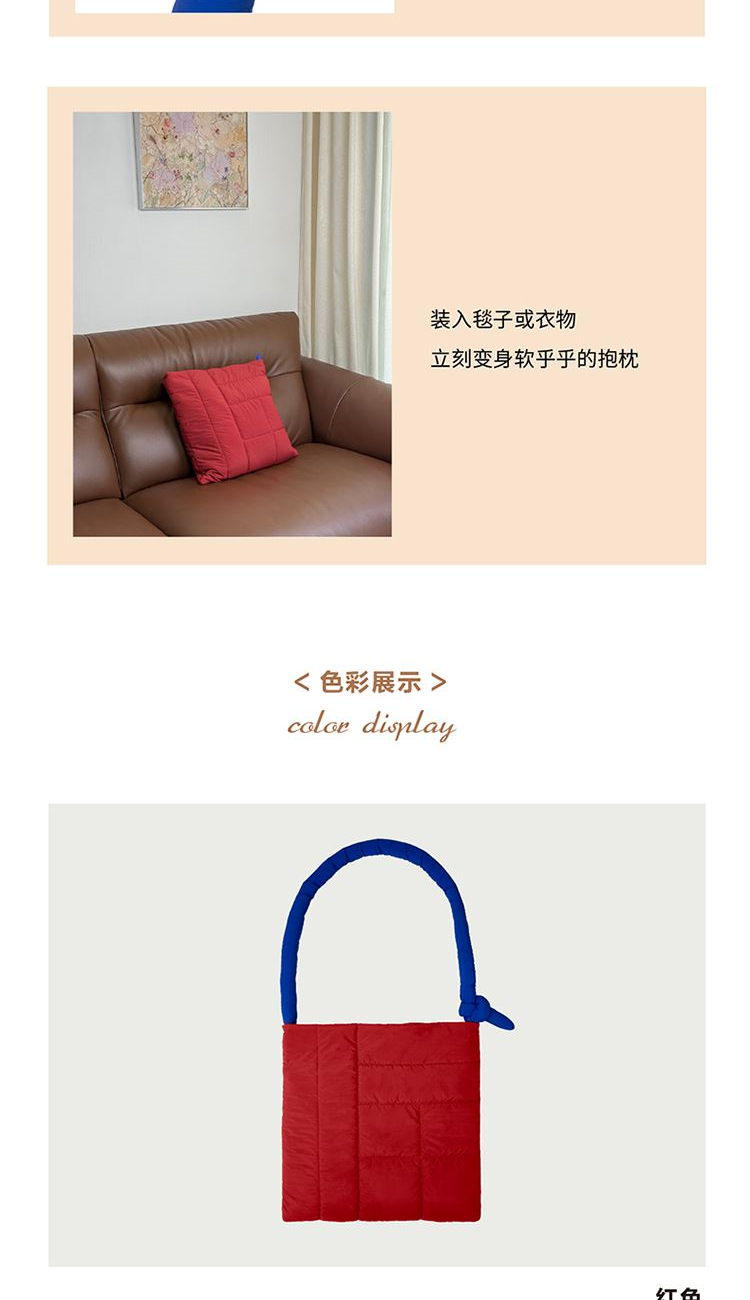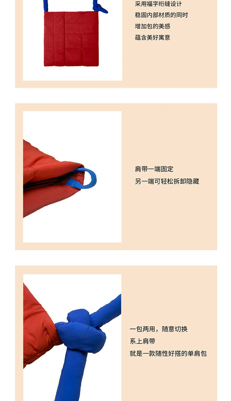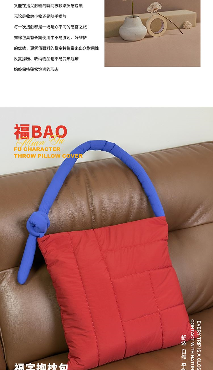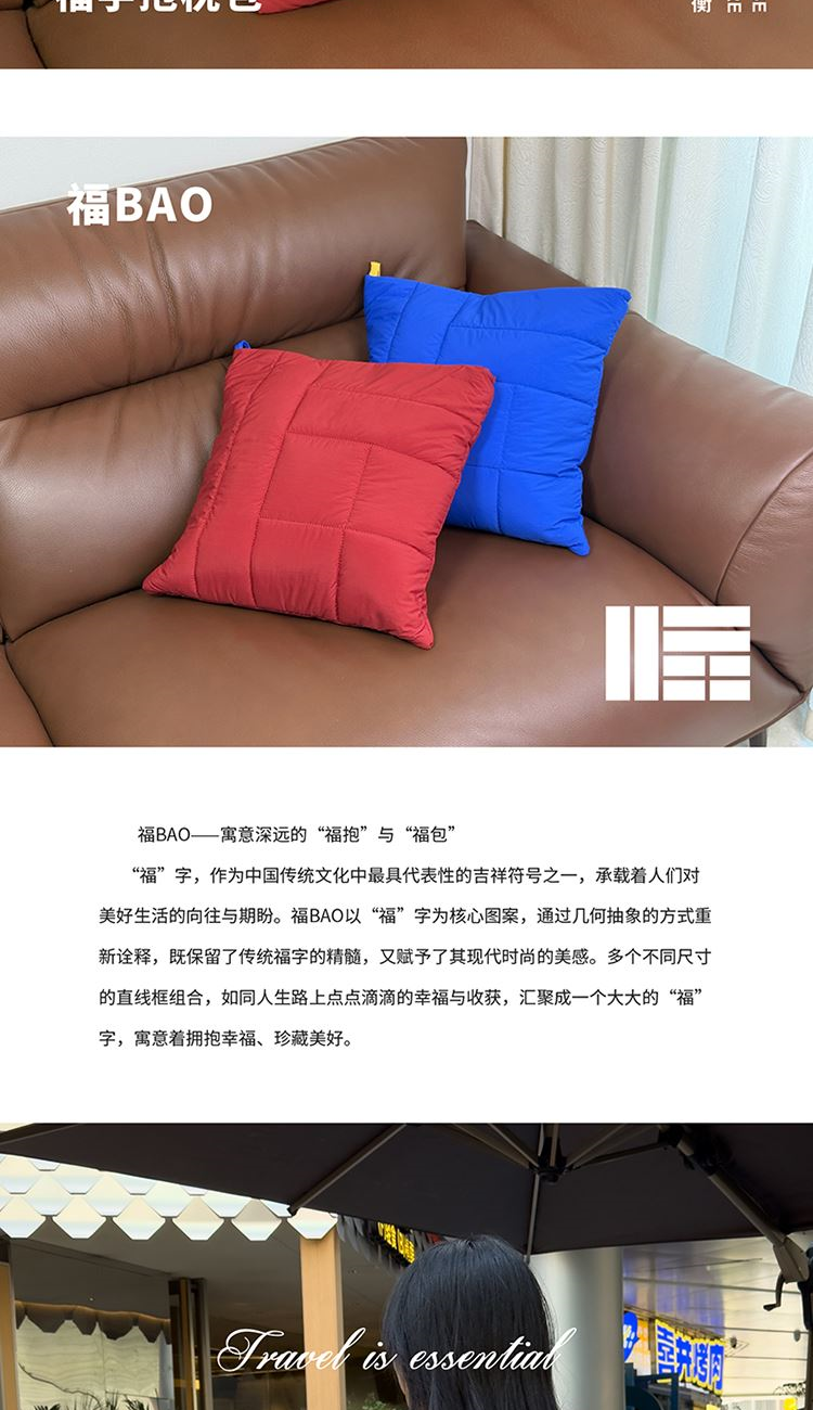 “福”字、作为中国传统文化中具代表性的吉祥符号之一、承载着人们对美好生活的向往与期盼。福bao以“福”字为核心图案、通过几何抽象的方式重新诠释、既保留了传统福字的精髓、又赋予了其现代时尚的美感。 一包两用,随意切换。它不只是个包,还是个抱枕!肩带一端固定、另一端可轻松拆卸隐藏。系上肩带,就是一款随性好搭的单肩包,日常通勤、逛街都能背;把肩带拆卸并隐藏起来,再装入毯子或衣物,立刻变身软乎乎的抱枕~办公时能装文件小物,居家时可当靠枕放松,旅行时既方便收纳,还能临时充当休憩抱枕,一包解锁办公、居家、旅行等多场景需求。