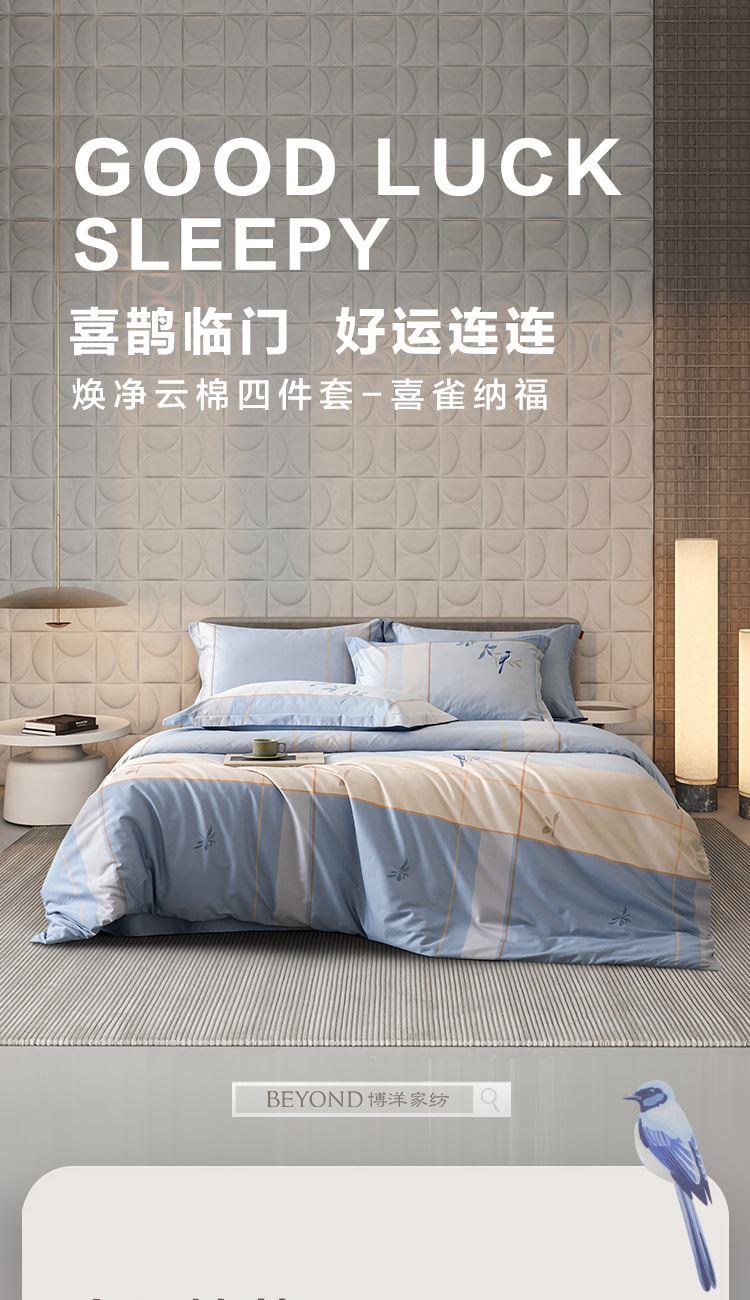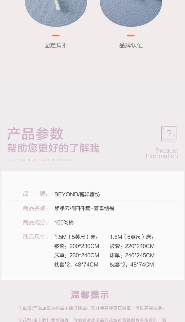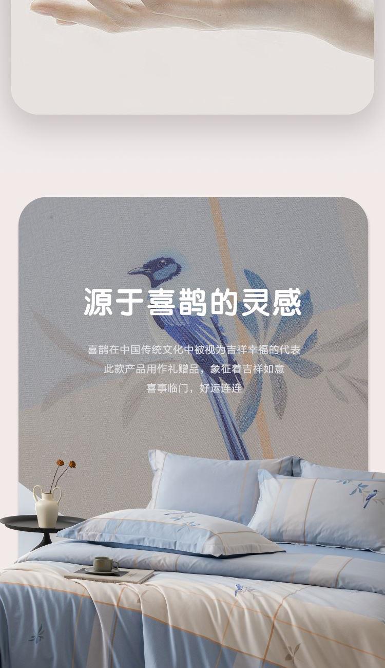 产品规格:1.8m(6英尺)床: 被套:220*240cm 床单:245*240cm 枕套*2:48*74cm 面 料:棉 1、本品采用高密全棉面料,用特殊工艺,软化纤维,去除表面毛羽,使面料更柔软轻盈,触感温润,贴合肌肤透气性好。精湛印染工艺,色牢度高,床品不易褪色不易起球呵护健康睡眠。 2、产品以喜鹊为主题,喜鹊在中国传统文化中被视为吉祥幸福的代表。此款产品用作礼赠品,象征着吉祥如意,喜事临门,好运连连。 3、全棉面料机洗方便,解放双手,常洗如新。