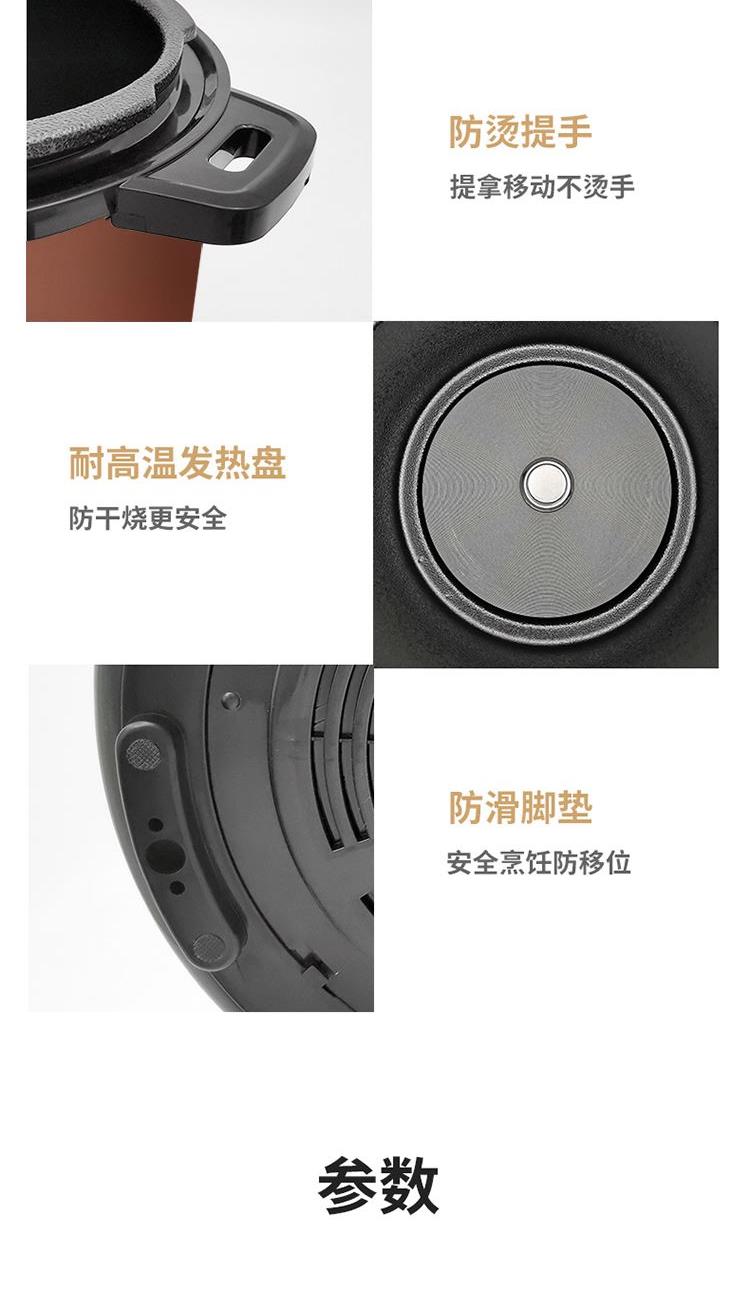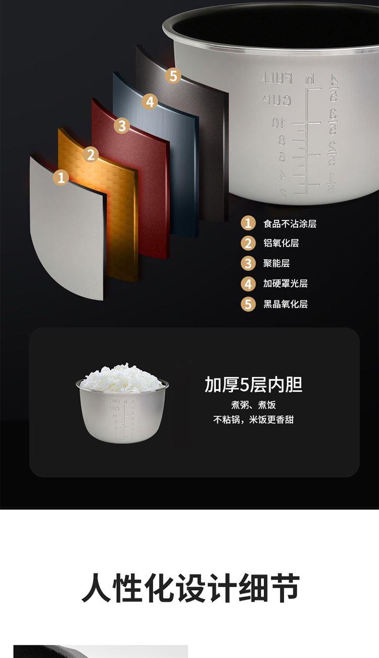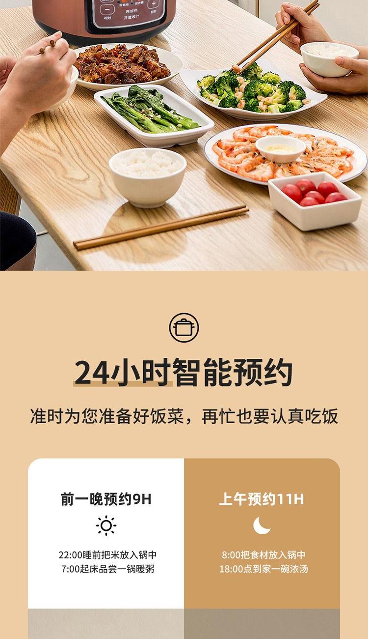额定功率:1000W 产品电源:220V~50Hz 内锅口径:220mm 工作压力:40~80kpa 产品容量:5L 净重:4.1kg 毛重:4.9kg 外包装尺寸:355*355*350mm 产品颜色:焦糖棕 1、13大功能菜单; 2、5L大容量; 3、聚能不粘内胆; 4、24小时预约; 5、智能化按键