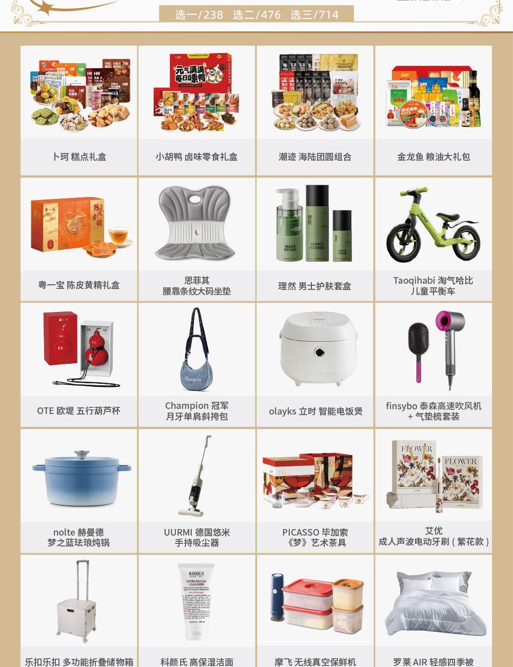 选项1 卜珂 休闲零食全家福组合 选项2 小胡鸭 精力爆棚鸭卤味零食礼盒 选项3 潮迹 海陆团圆组合 选项4 金龙鱼 粮油大礼包 选项5 粤一宝 陈皮黄精礼盒 选项6 思菲其 腰靠条纹大码坐垫 选项7 理然 男士护肤套盒 选项8 Taoqihabi淘气哈比 儿童平衡车 选项9 OTE欧堤 五行葫芦杯 选项10 Champion 月牙单肩斜挎包 选项11 olayks立时 智能电饭煲 选项12 finsybo 泰森高速吹风机+气垫梳套装 选项13 nolte赫曼德 梦之蓝珐琅炖锅 选项14 UURMI德国悠米 手持吸尘器 选项15 PICASSO毕加索 《梦》艺术茶具 选项16 艾优 成人声波电动牙刷(繁花款) 选项17 乐扣乐扣 多功能折叠储物箱 选项18 科颜氏 高保湿洁面 选项19 Morphyrichards摩飞 无线真空保鲜机 选项20 罗莱 AIR轻感四季被