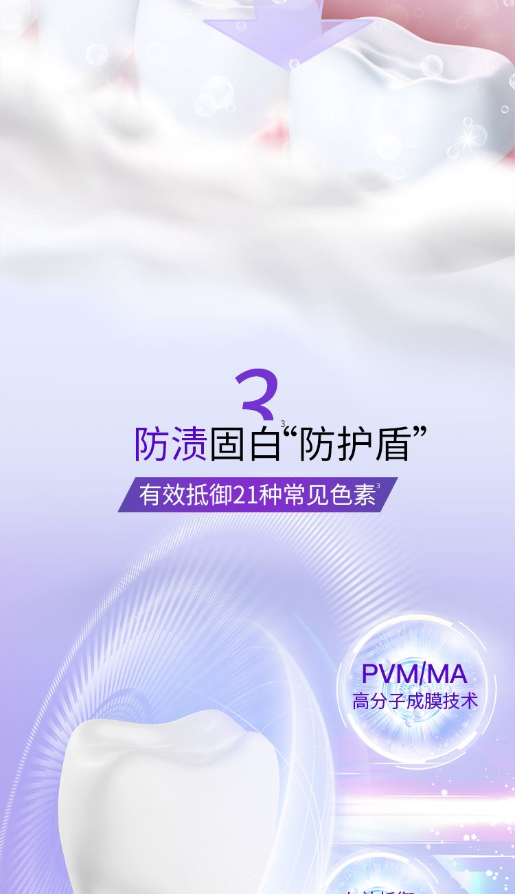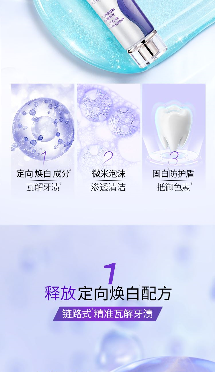 1-定向释放焕白配方 2-渗透微米级泡沫,深入清洁,温和去渍 3- 有效抵抗多种色素,防渍固白