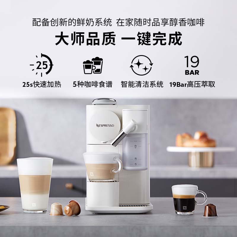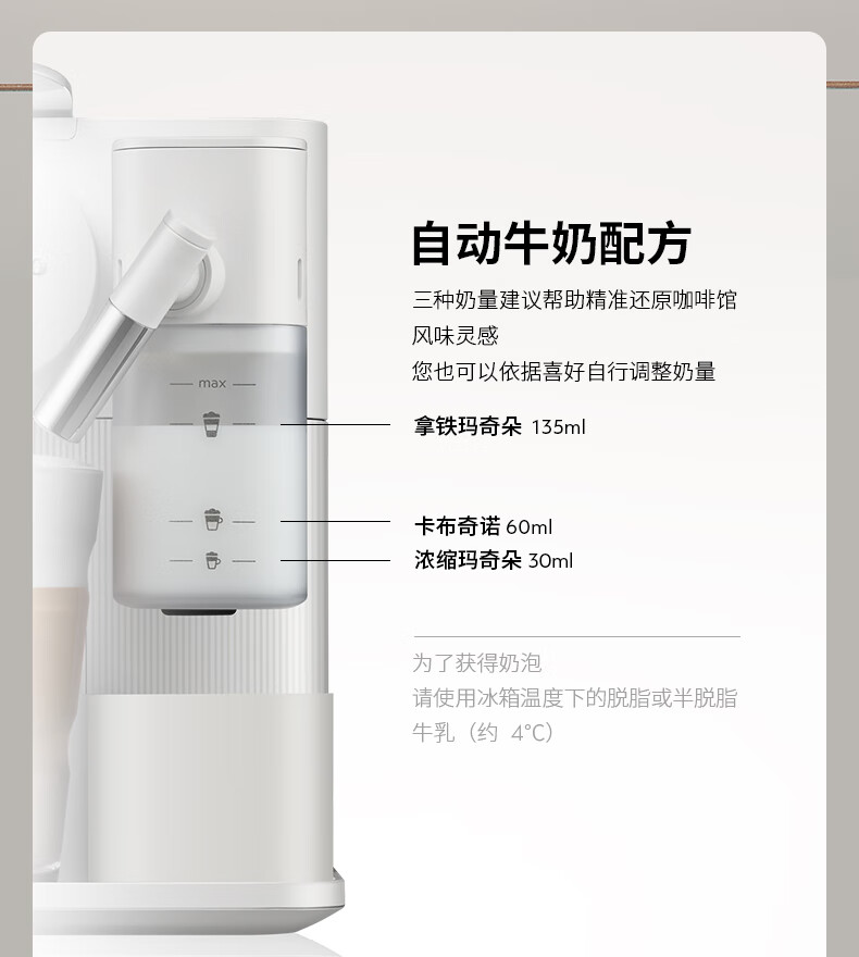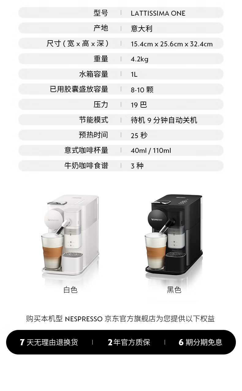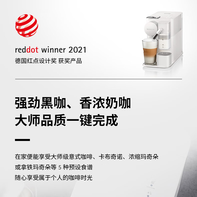 型号:F121 电源线长:1.2m 额定电压:220V 额定功率:1200W 产品尺寸:长154mm 宽324mm 高256mm 水箱容量:0.6-1.29L 泵浦压力:19Bar 制作口味:卡布奇诺 拿铁 意式浓缩 强劲黑咖、香浓奶咖大师品质一键完成,在家便能享受大师级意式咖啡、卡布奇诺、浓缩玛奇朵或拿铁玛奇朵等5种预设食谱,随心享受属于个人的咖啡时光