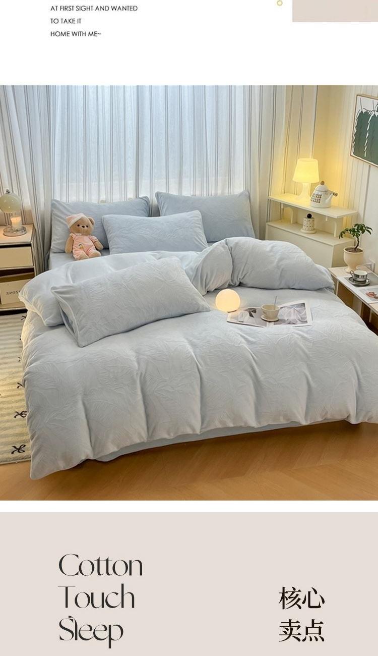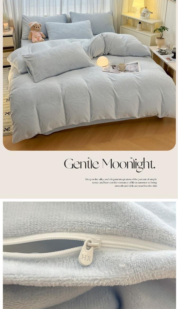 规格: 床单:230*250cm±5cm 被罩:200*230cm 枕套:48*74cmx2 面料:牛奶绒雕花绒(聚酯纤维) 重量:3.4KG 1、双面牛奶绒面料拥有丰厚的绒毛,手感极其柔软 2、特使工艺处理,内外循环,排汗速干 3、活性印染设计,色彩清晰耐看,久用如新