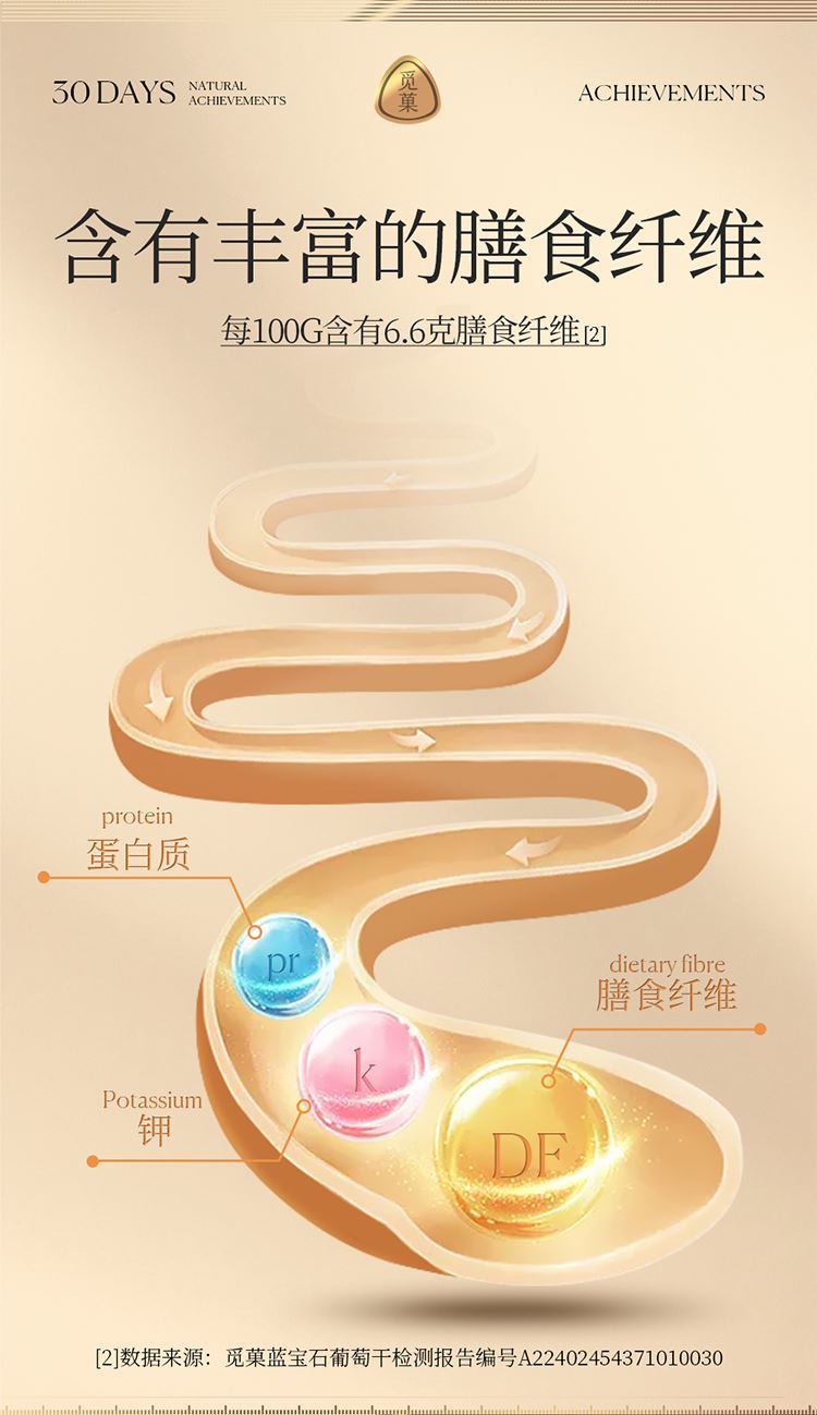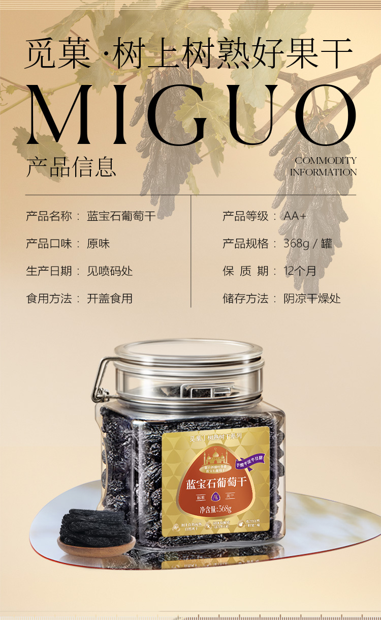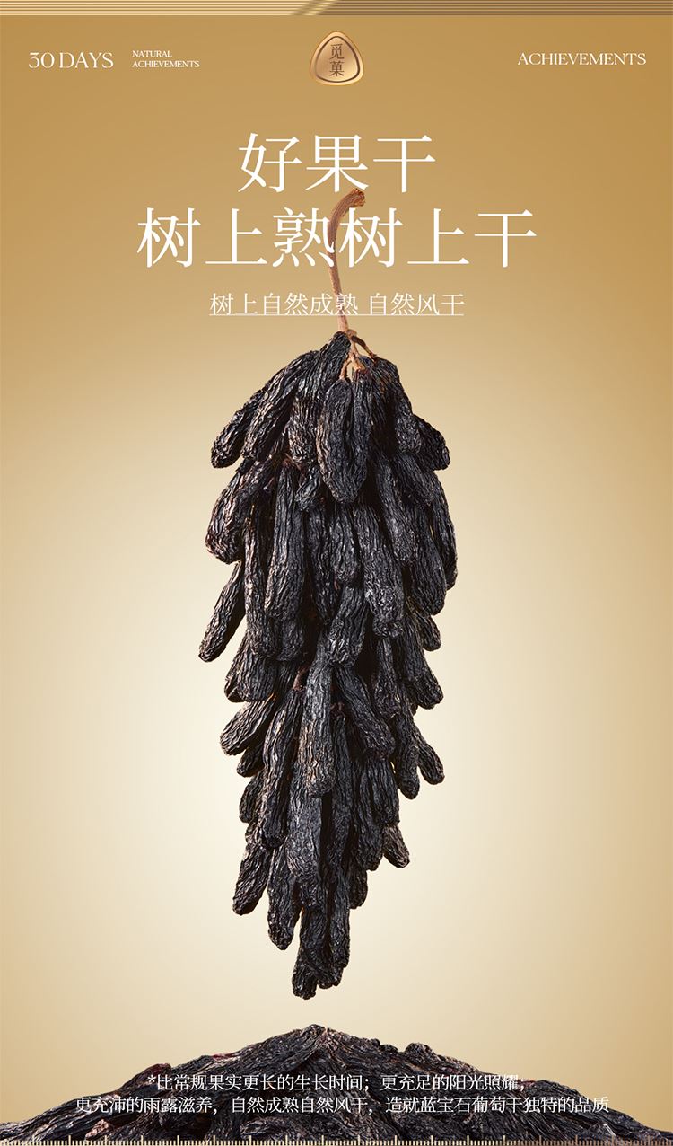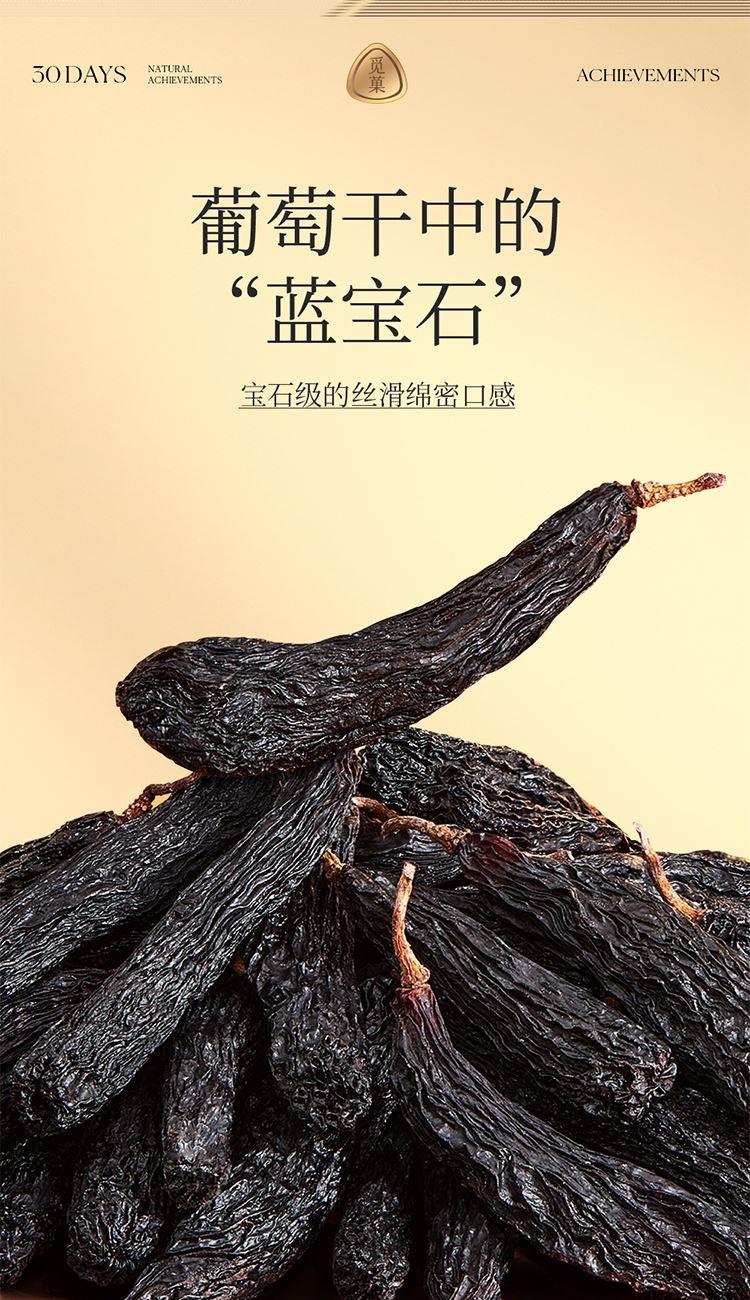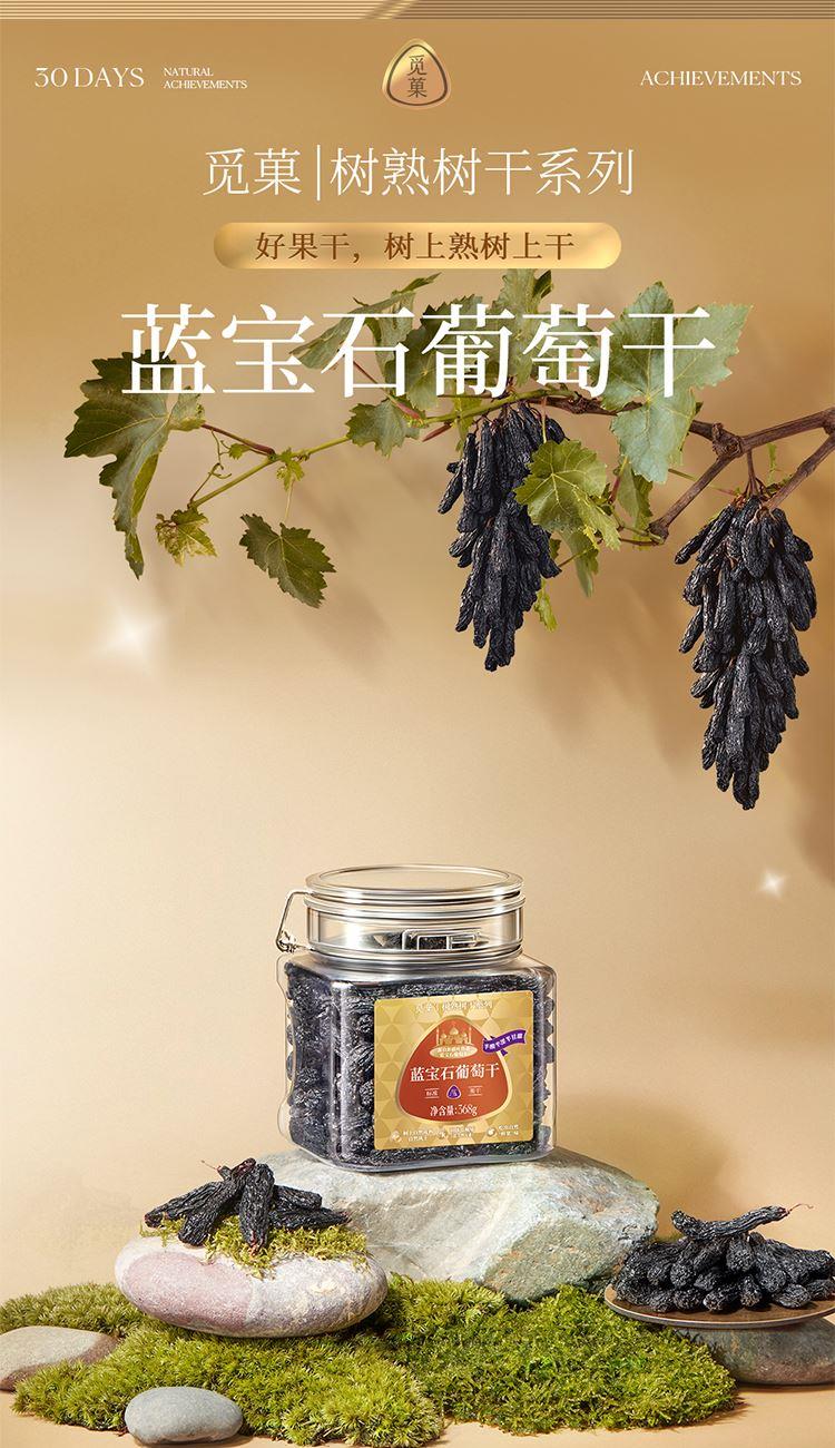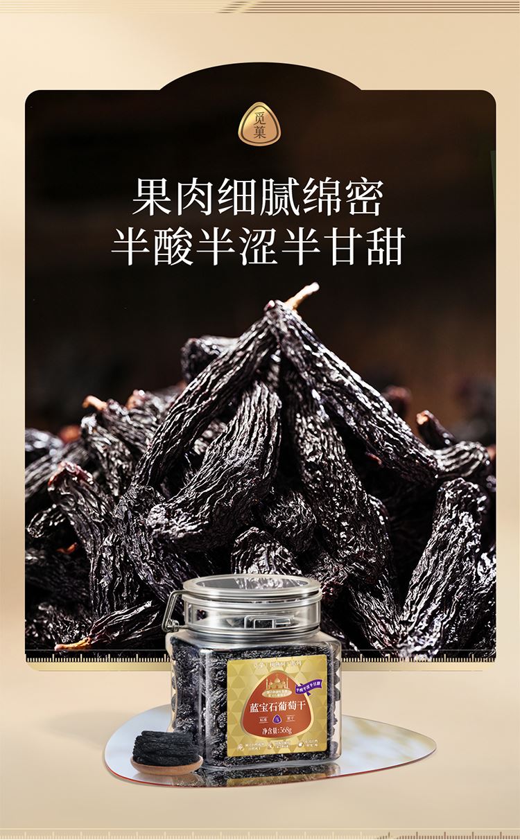 甄选品质 甄选“月光之泪”蓝宝石葡萄 半酸半涩半甘甜 入口微甜微酸 回味无尽 营养丰富 钾含量为香蕉的5倍 每100G含有6.6克膳食纤维 自然成熟好果干 树上熟 树上干 造就蓝宝石葡萄干独特品质