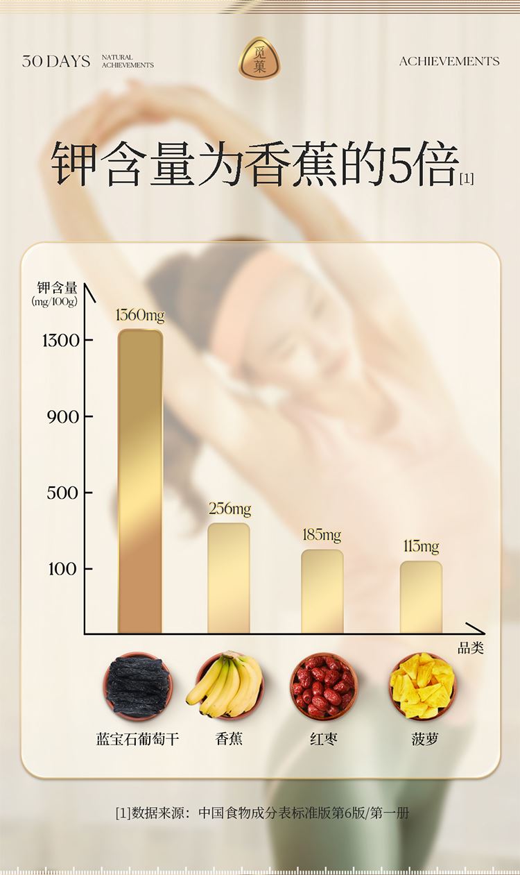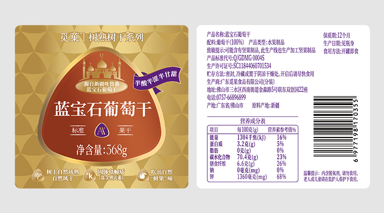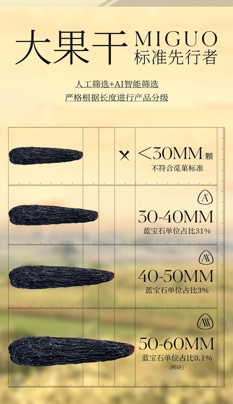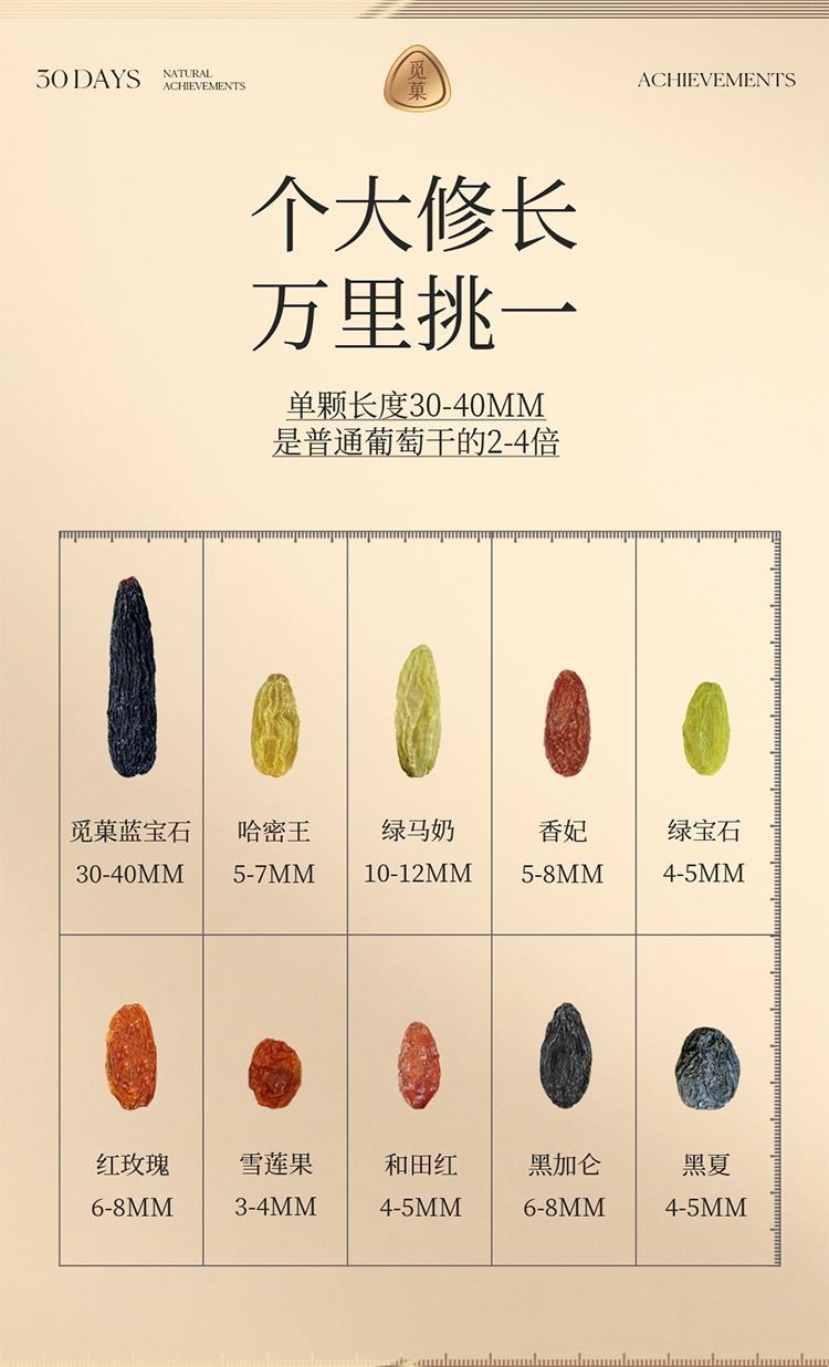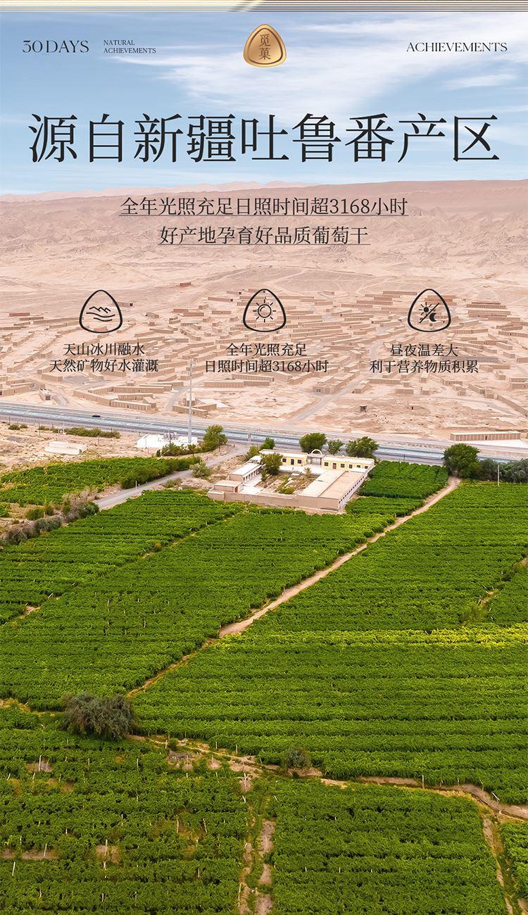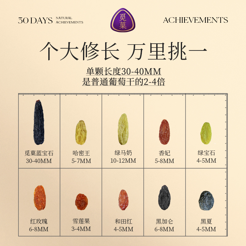甄选品质 甄选“月光之泪”蓝宝石葡萄 半酸半涩半甘甜 入口微甜微酸 回味无尽 营养丰富 钾含量为香蕉的5倍 每100G含有6.6克膳食纤维 自然成熟好果干 树上熟 树上干 造就蓝宝石葡萄干独特品质