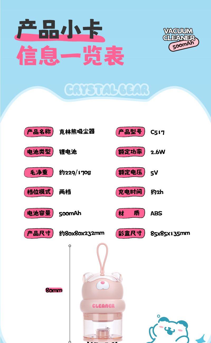 电池类型:锂电池 额定功率:2.6W 毛净重:约229/170g 额定电压:5V 档位模式:两档 充电时间:约2h 电池容量:500mAh 材 质:ABS 产品尺寸:约80x80x232mm 彩盒尺寸:85x85x135mm 外箱尺寸:53.5X39x45cm 整箱毛净重:18.5/17.3kg 备注:本产品整箱发货