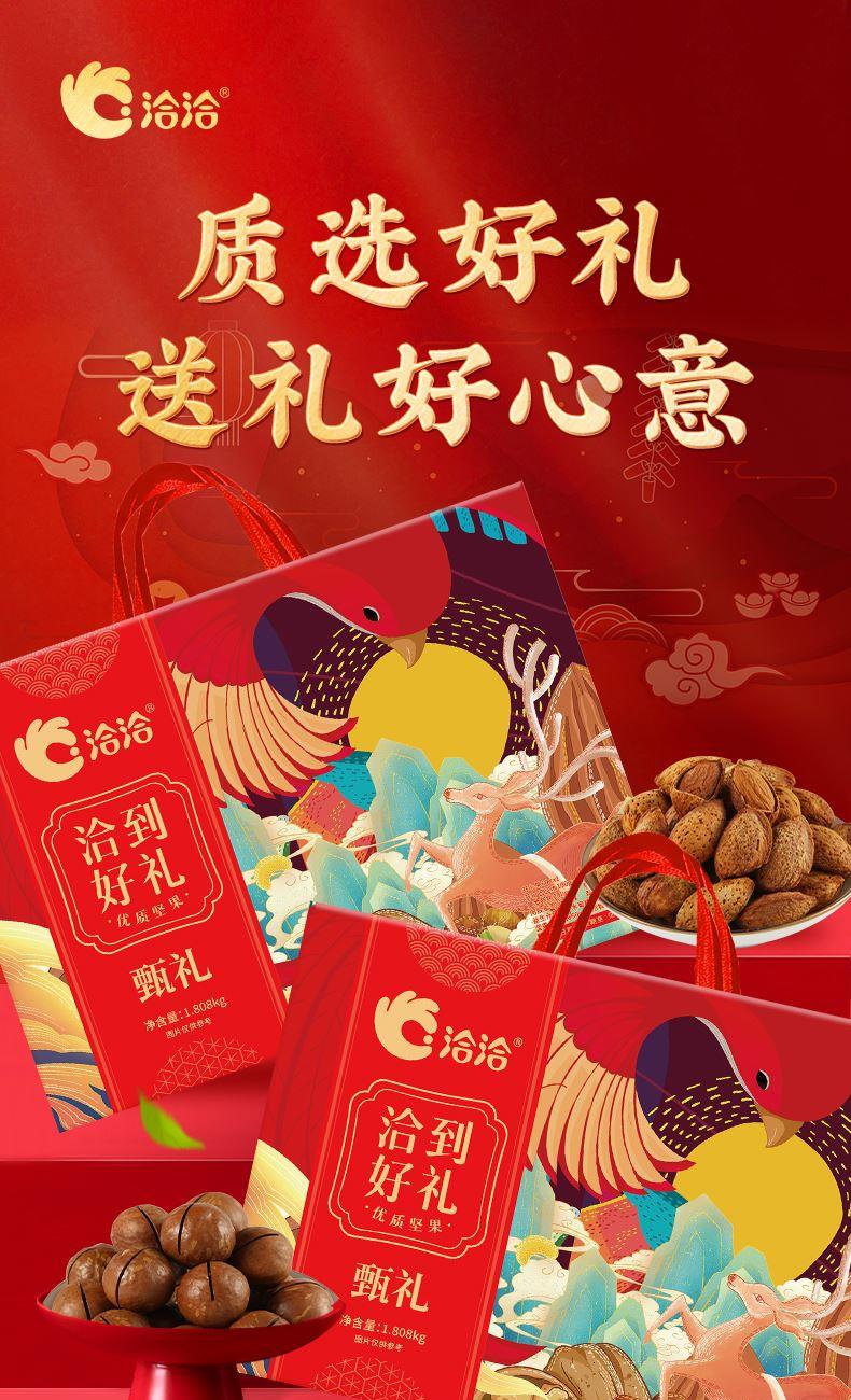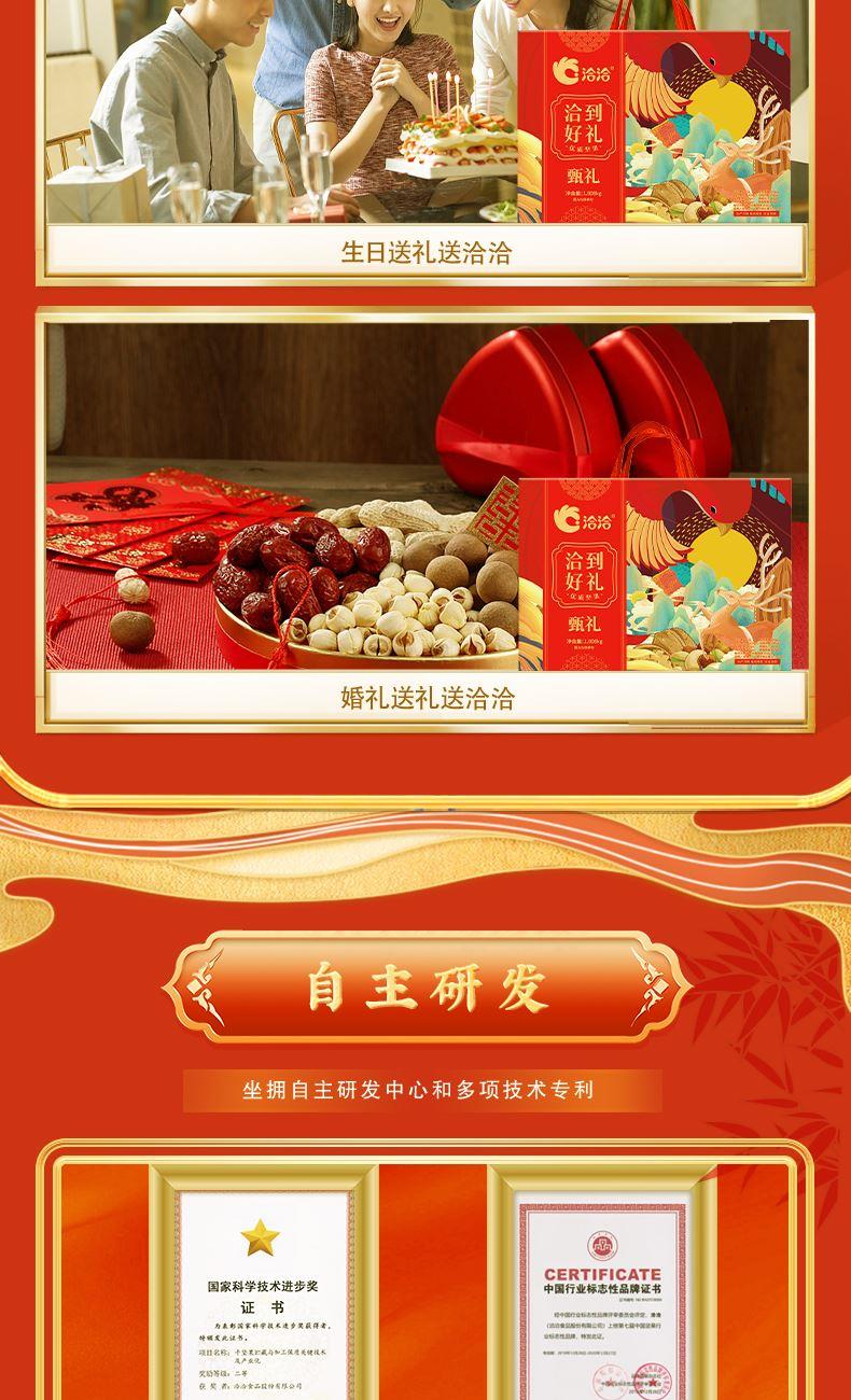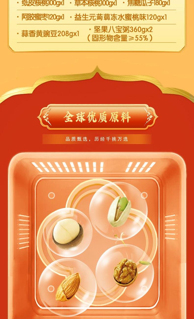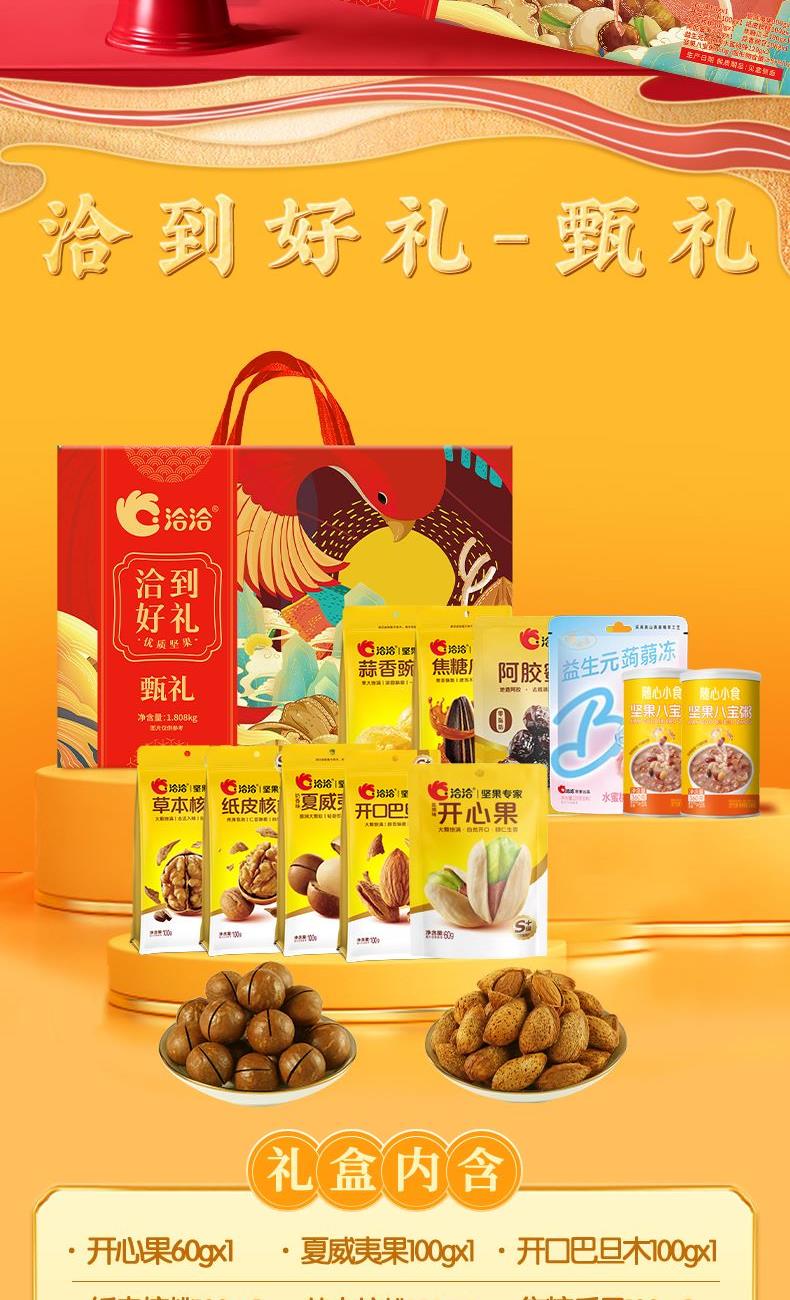 【洽洽】开心果60g 【洽洽】夏威夷果100g 【洽洽】开口巴旦木100g 【洽洽】纸皮核桃100g 【洽洽】草本核桃100g 【洽洽】焦糖瓜子180g 【洽洽】阿胶蜜枣120g 【洽洽】蒜香豌豆208g 【洽洽】益生元蒟蒻冻水蜜桃味120g 【洽洽】坚果八宝粥360g 【洽洽】坚果八宝粥360g 名物礼盒:410*290*160mm