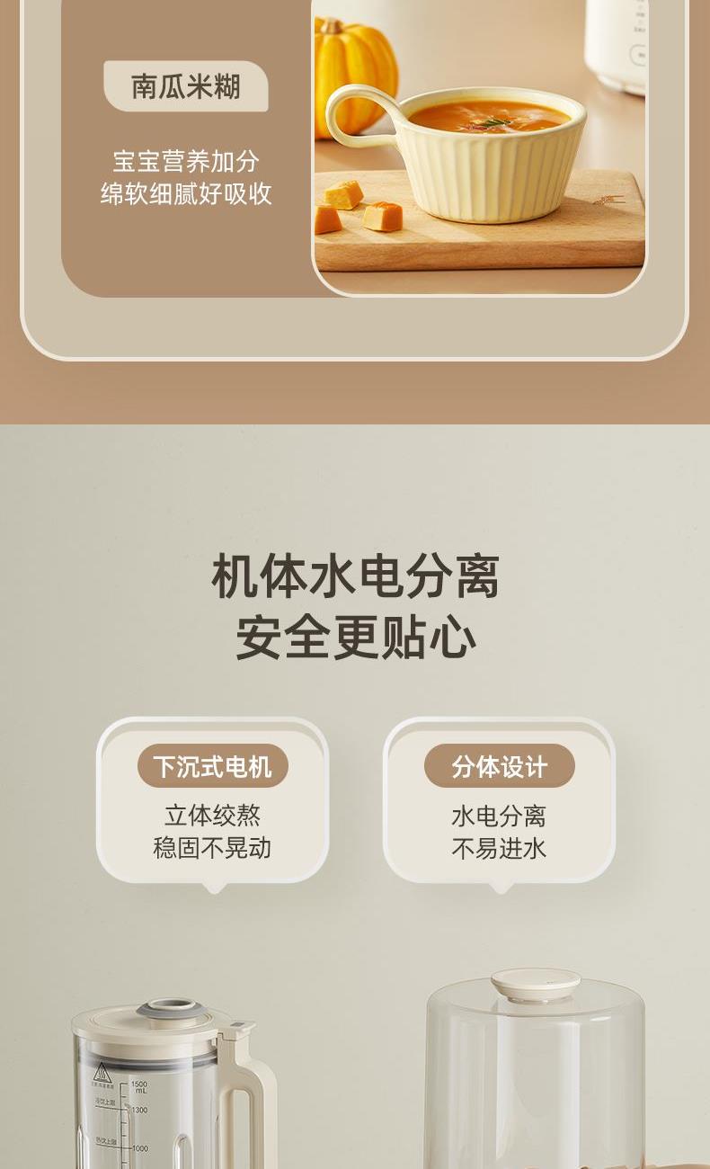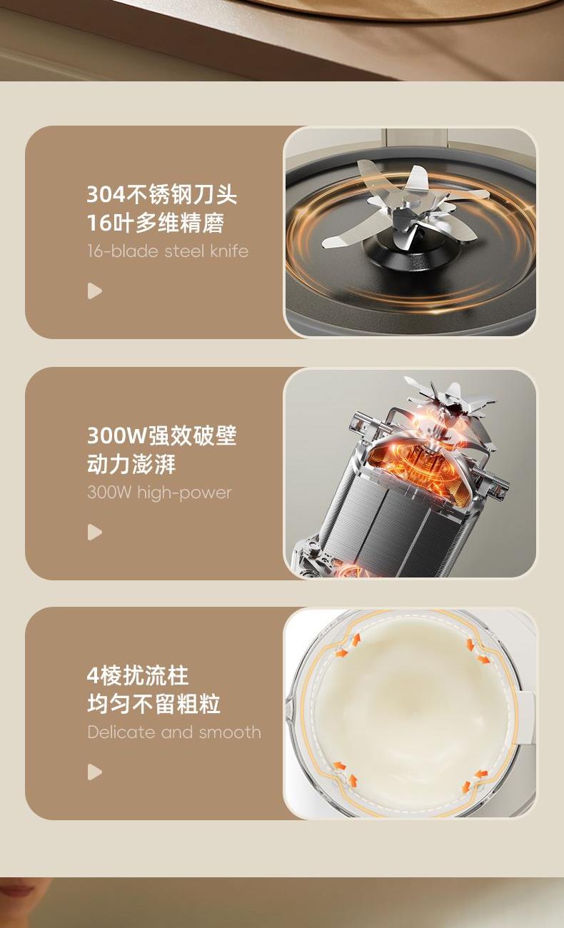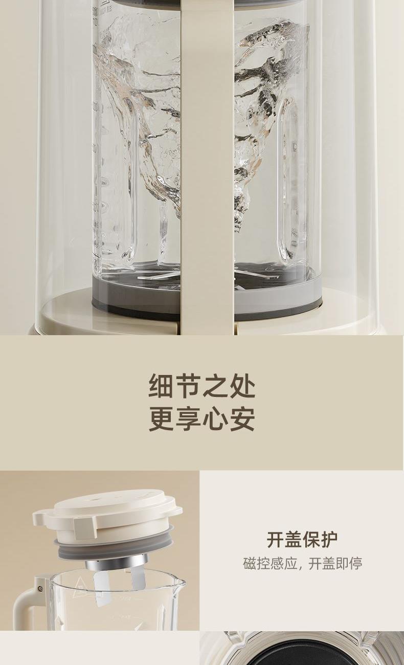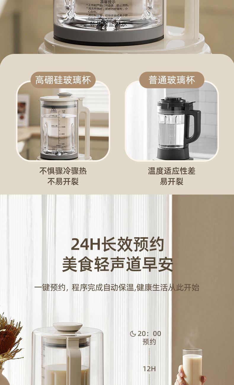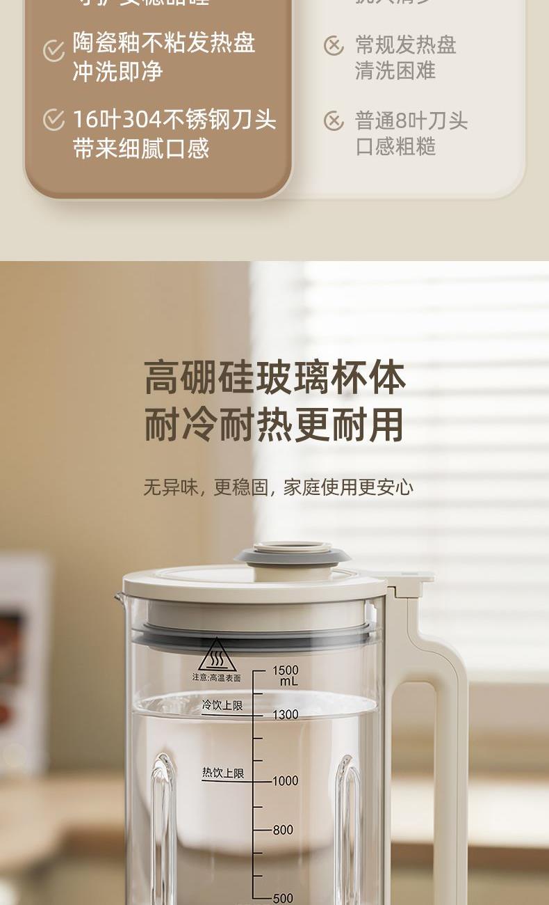 主要材质:PP+304不锈钢 电压:220V 功率:加热600W+搅拌300W 容量:冷饮1.3L/热饮1L 单台净重:2.40kg 单台毛重:2.90kg 裸机:345*175*175mm 内箱:395*258*256mm 规格:1台/箱 包装方式:彩箱+牛卡箱 颜色:里米尼白 1、1.5L大容量,满足用户四季需求 2、高硼硅玻璃杯体,骤冷骤热不易开裂 3、陶瓷釉不沾涂层发热盘,清洗方便不易糊底 4、24小时预约,尽享美味柔音隔音舱,轻音破壁不打扰 5、高温清洗功能,省心方便 6、不锈钢刀组,有效绞打食材