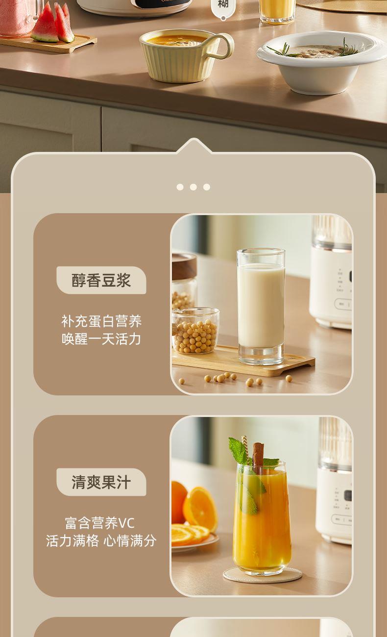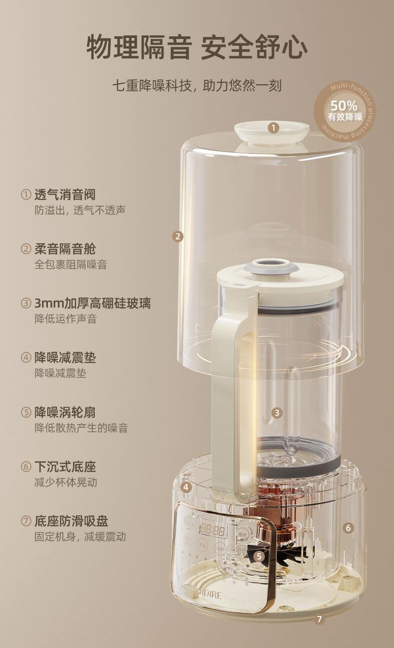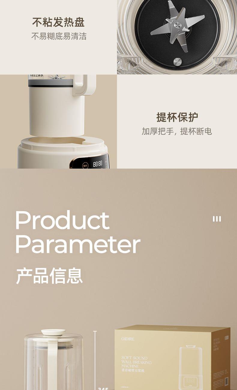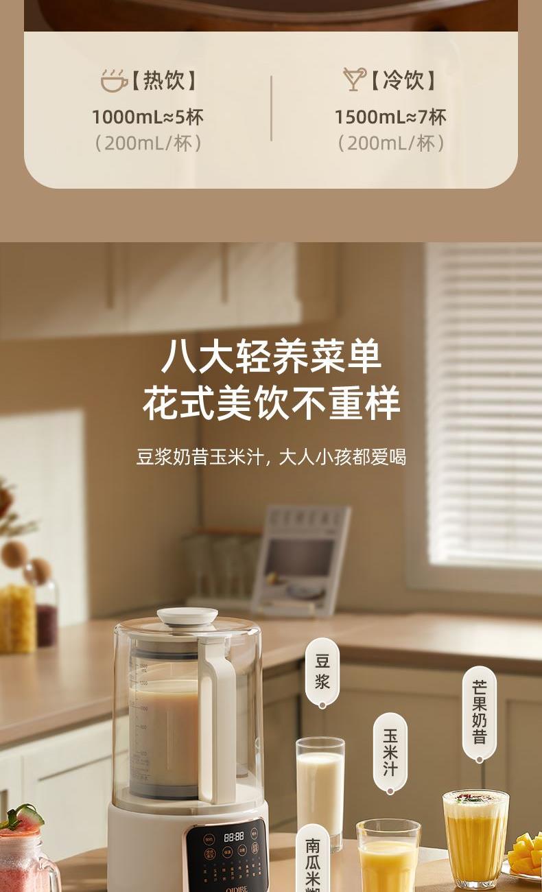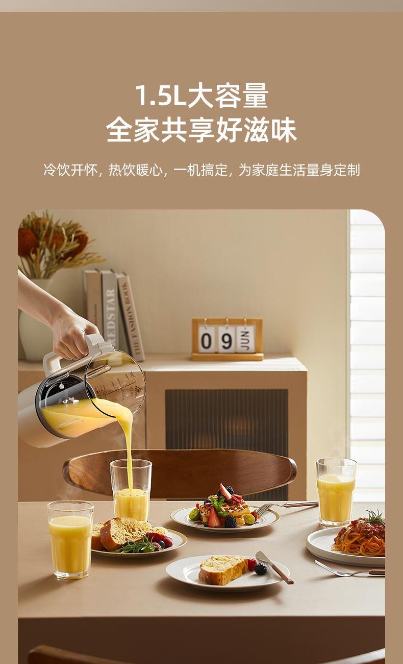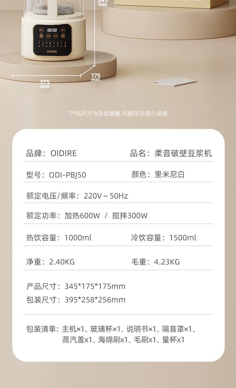 主要材质:PP+304不锈钢 电压:220V 功率:加热600W+搅拌300W 容量:冷饮1.3L/热饮1L 单台净重:2.40kg 单台毛重:2.90kg 裸机:345*175*175mm 内箱:395*258*256mm 规格:1台/箱 包装方式:彩箱+牛卡箱 颜色:里米尼白 1、1.5L大容量,满足用户四季需求 2、高硼硅玻璃杯体,骤冷骤热不易开裂 3、陶瓷釉不沾涂层发热盘,清洗方便不易糊底 4、24小时预约,尽享美味柔音隔音舱,轻音破壁不打扰 5、高温清洗功能,省心方便 6、不锈钢刀组,有效绞打食材